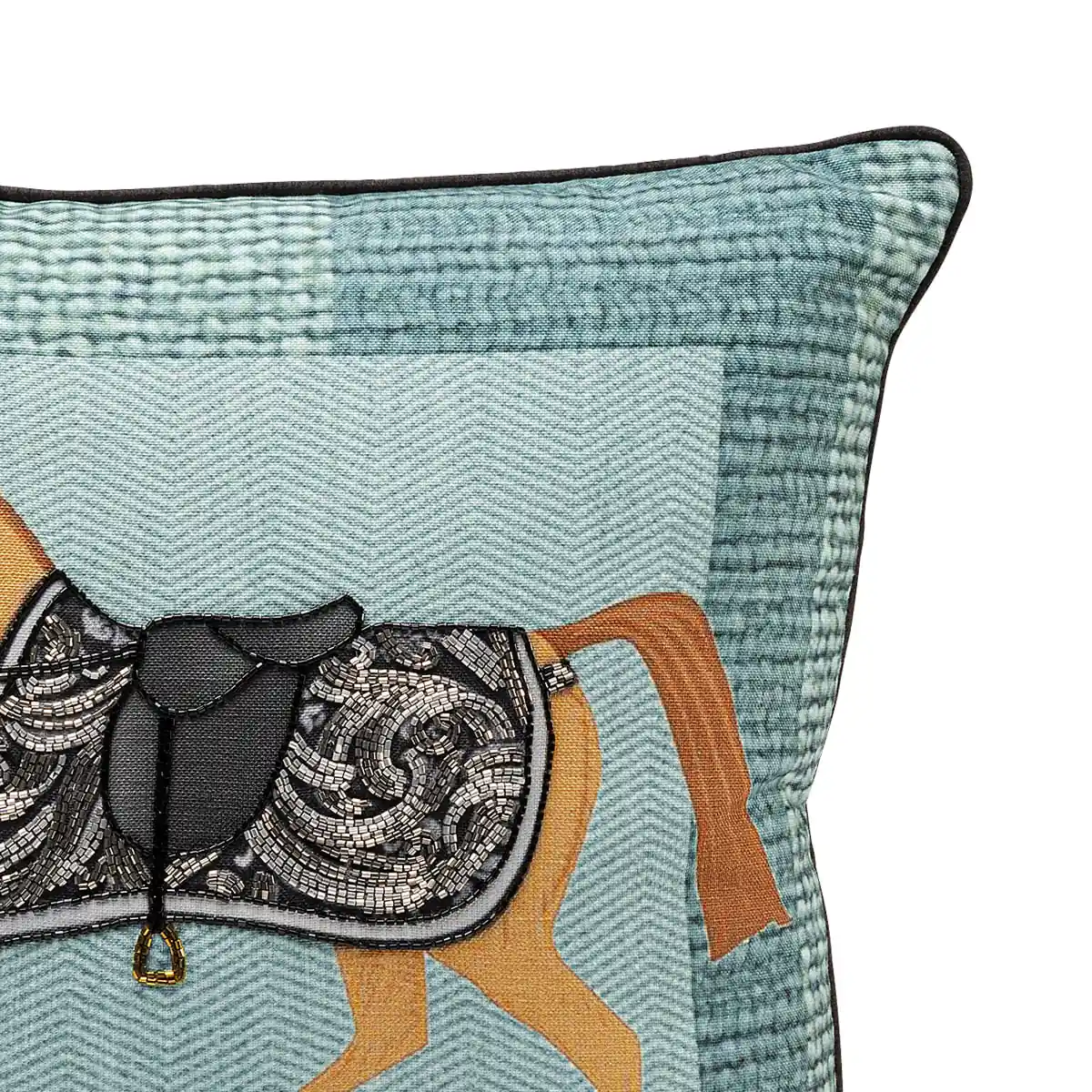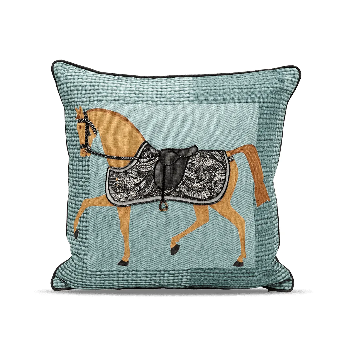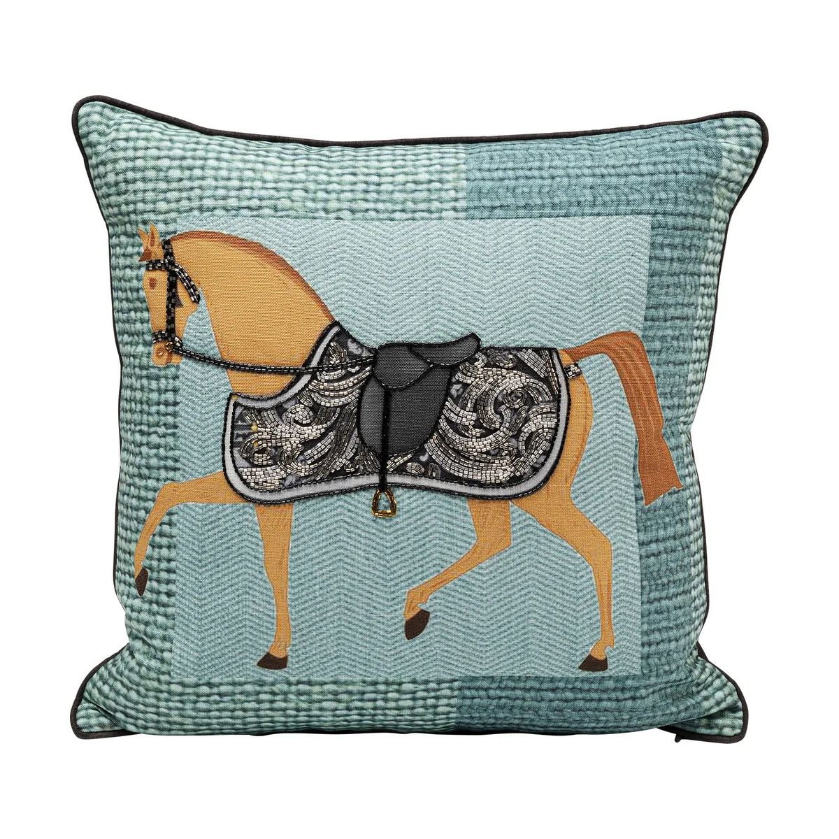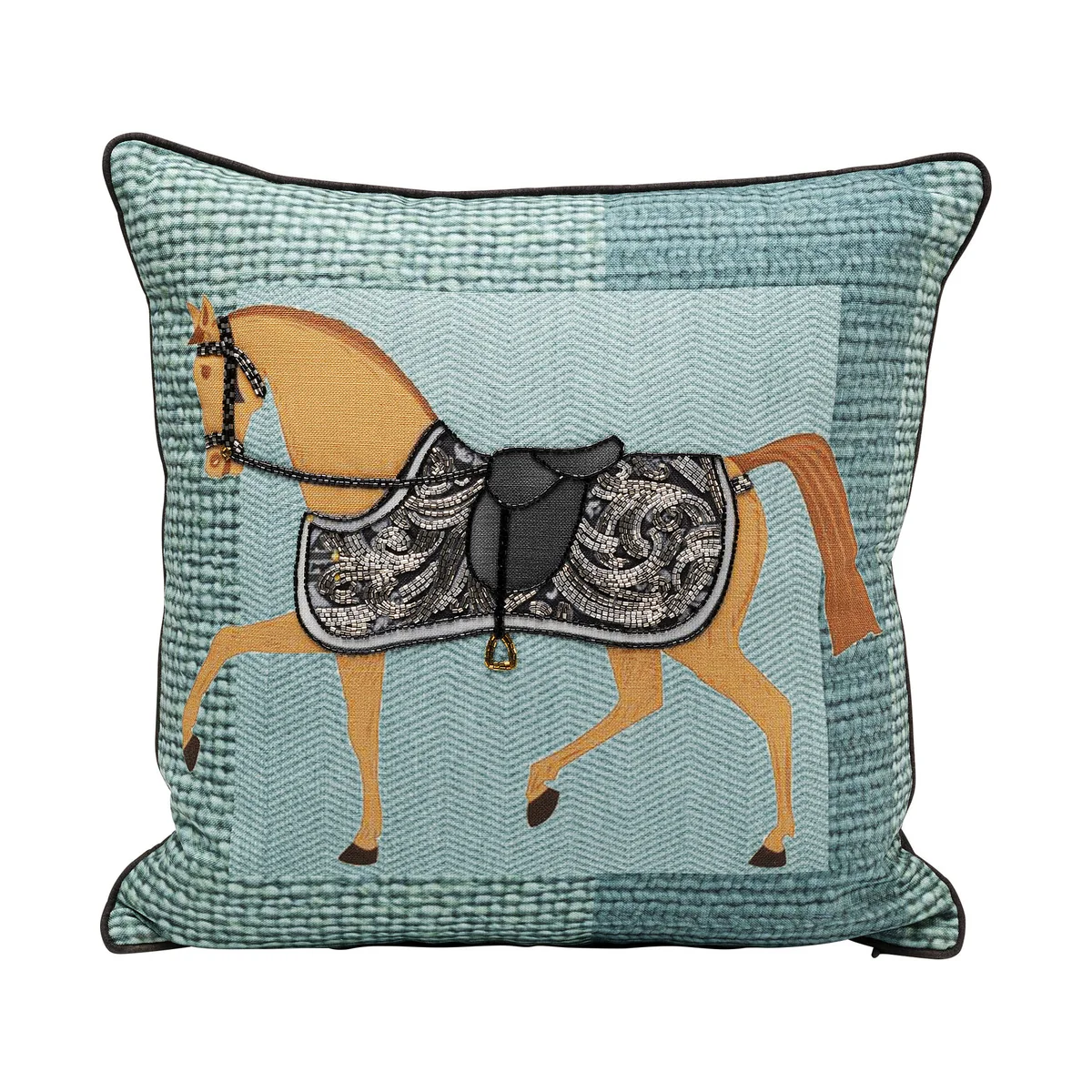 Standing out against a rich turquoise background, the brown horse motif is enhanced by dazzling rhinestones. With dimensions of 45 cm x 25 cm x 45 cm, this cushion is a perfect blend of comfort and style. The removable cover, crafted from 100% polyester, ensures easy maintenance, while the included polyester filling cushion guarantees plush comfort.