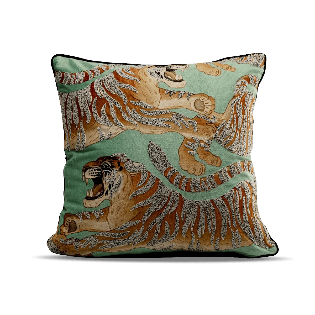 Our cushion features a radiant tiger motif in mint green, measuring 45 x 45 x 25 centimetres. Detailed 3D effect applications give it an opulent feel, enhancing its luxurious appeal. The cushion comes with a removable cover with a zipper for easy cleaning, and includes a 100% polyester filling.