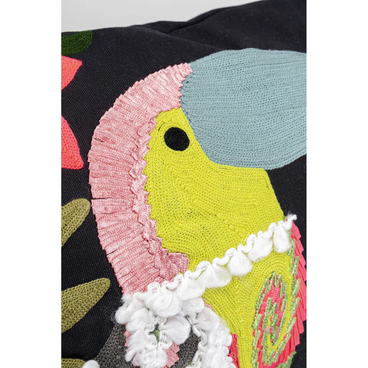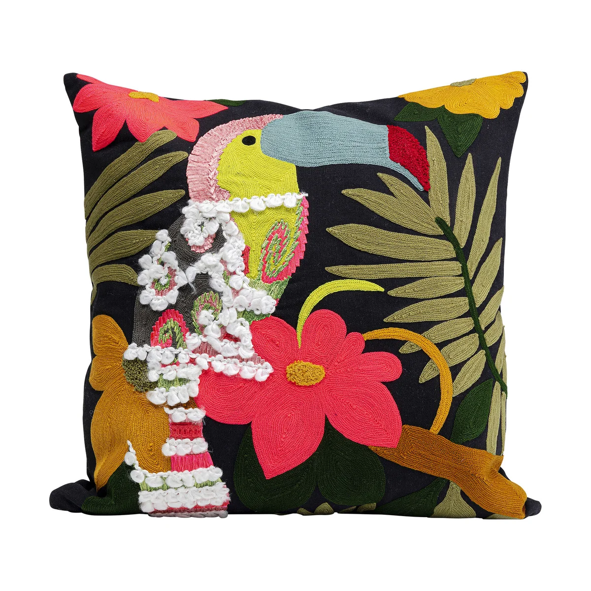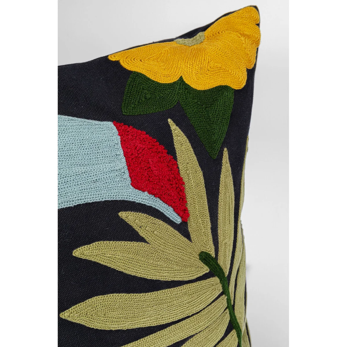 • A colourful decorative cushion made of wool and cotton, sized 45x45cm • A designer cushion with embroidered, tufted and woven surfaces • An eye-catcher as a sofa cushion in combination with other cushions or on its own • The removable cushion cover has a zip • Filling cushion included