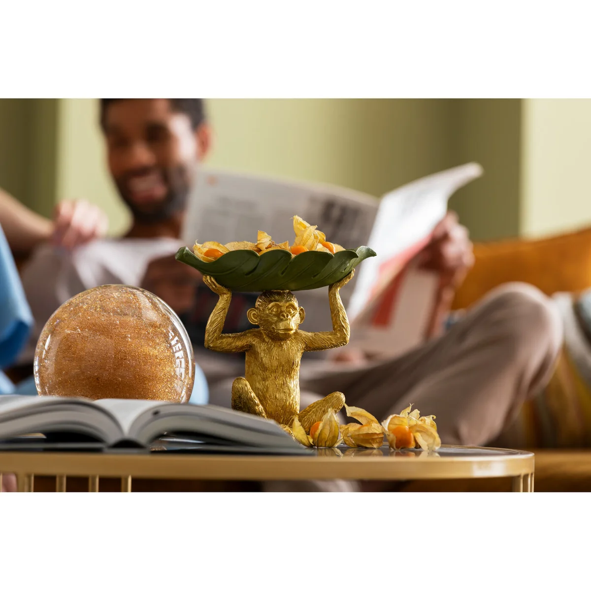 This radiantly beautiful helper has everything under control: leave keys, rings or the snacks for movie night to him and the friendly monkey will keep everything in order. The sculpture is detailed and lovingly painted by hand. With its fur in gold and the bowl in green, it brings that jungle feeling into the living room, the bedroom, the hallway or the home office.