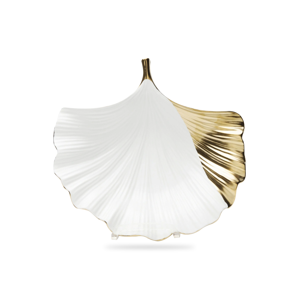 This exquisite bowl, measuring 28cm in diameter and 5.7cm in height, is meticulously crafted from galvanized ceramics porcelain. The elegant Gingko design lends a touch of sophistication to any space it adorns. Its compact size makes it ideal for your side table or coffee table.