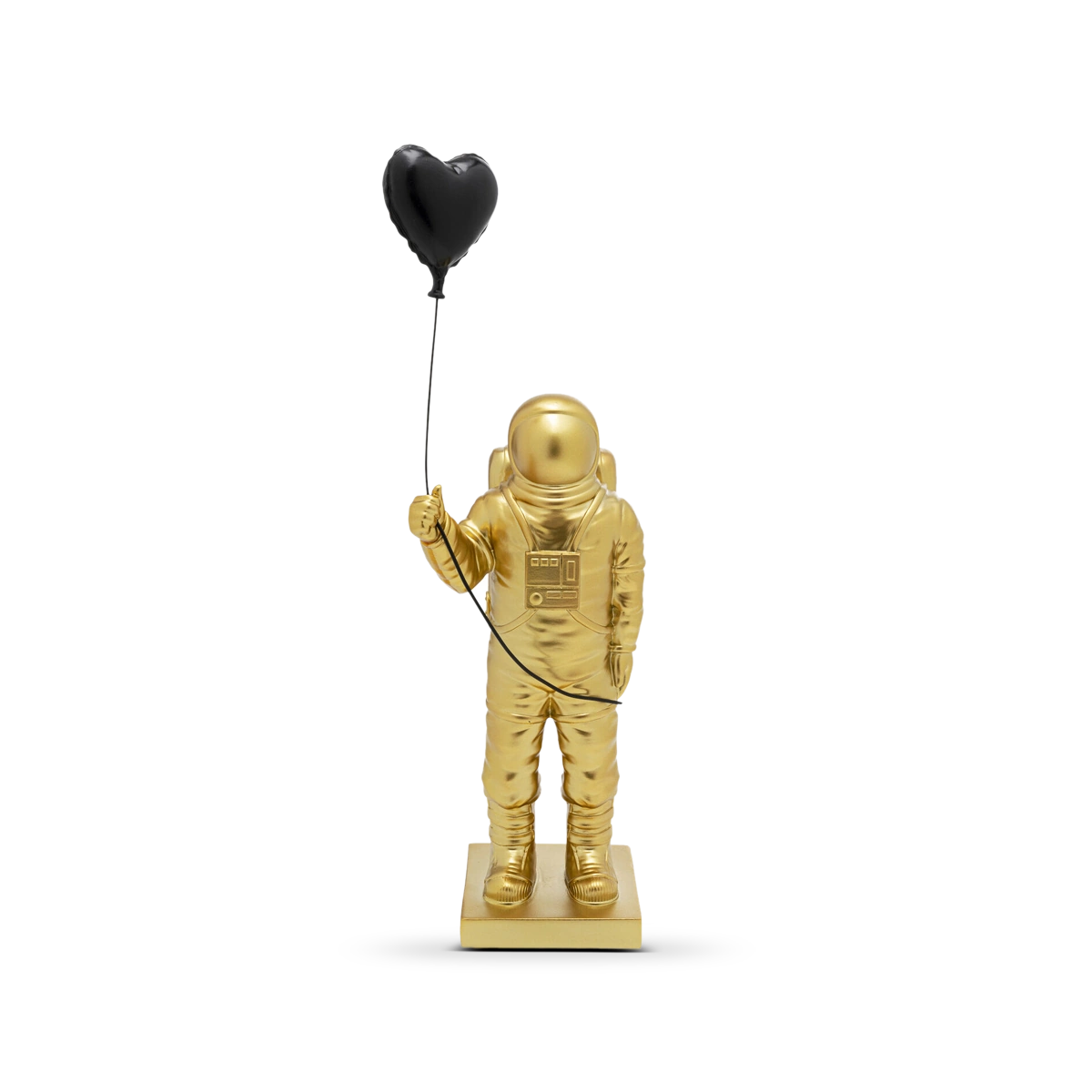 A golden astronaut floats through the home and brings a special touch of love with a heart-shaped balloon. This unique decorative figurine made of high-quality polyresin impresses with its shiny surface and the perfect combination of futuristic gold and contrasting black accents. Handcrafted, each piece is unique and adds a stylish accent to sideboards or shelves. Ideal for modern interiors or as a playful highlight in minimalist rooms.
