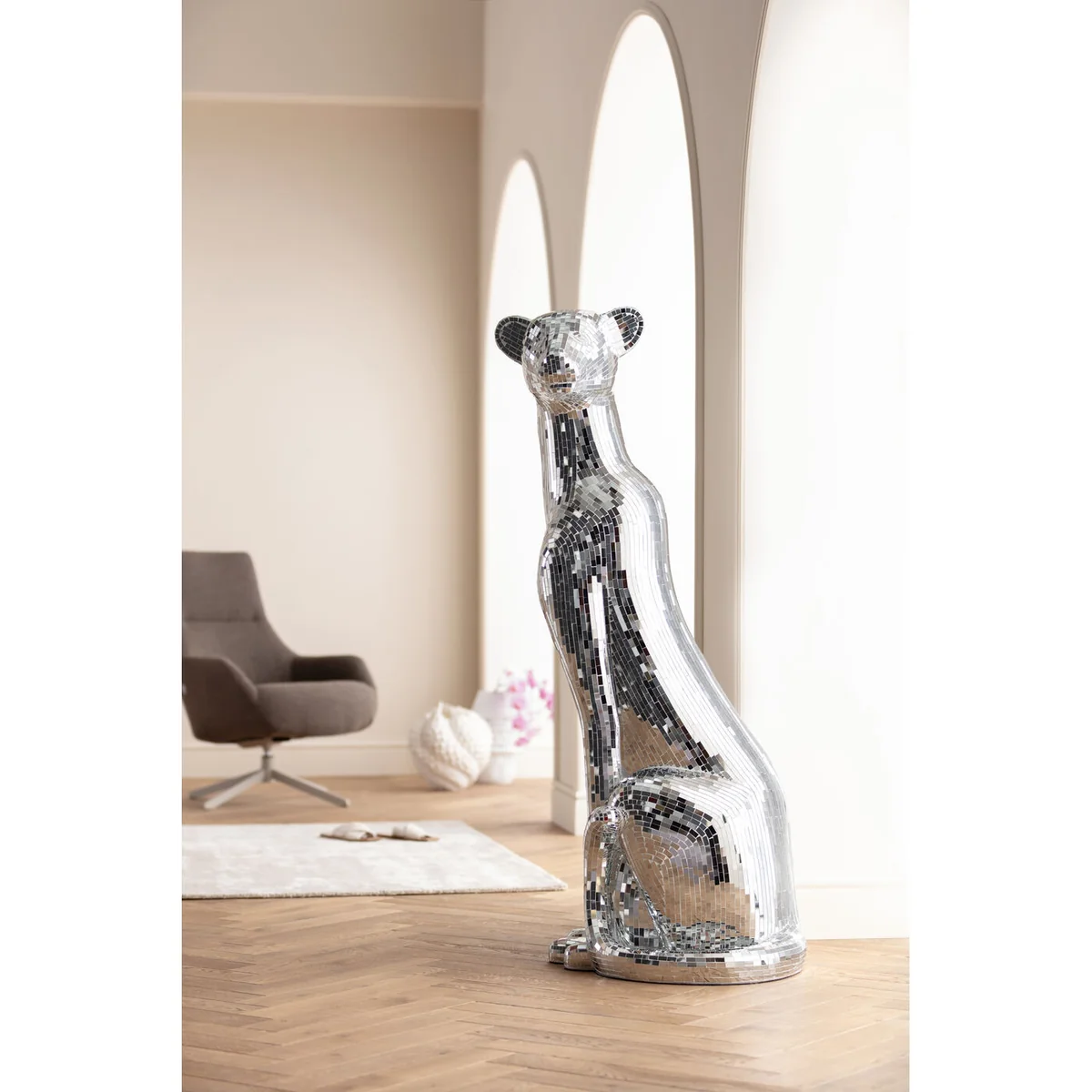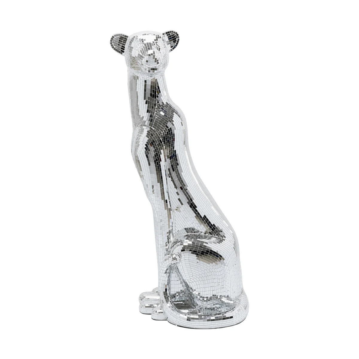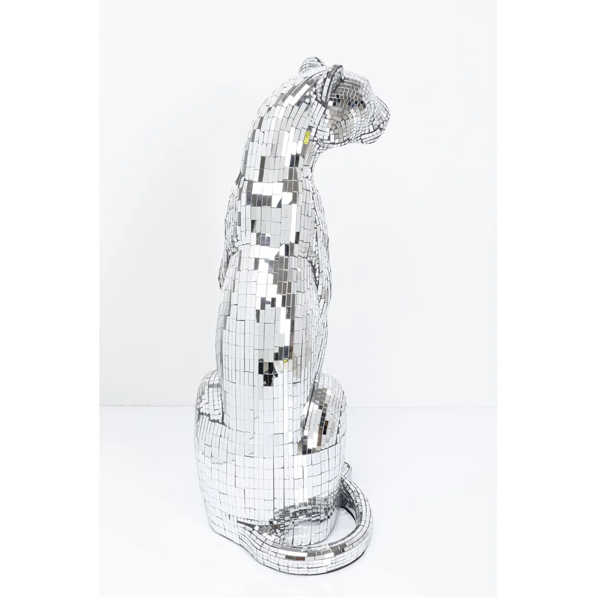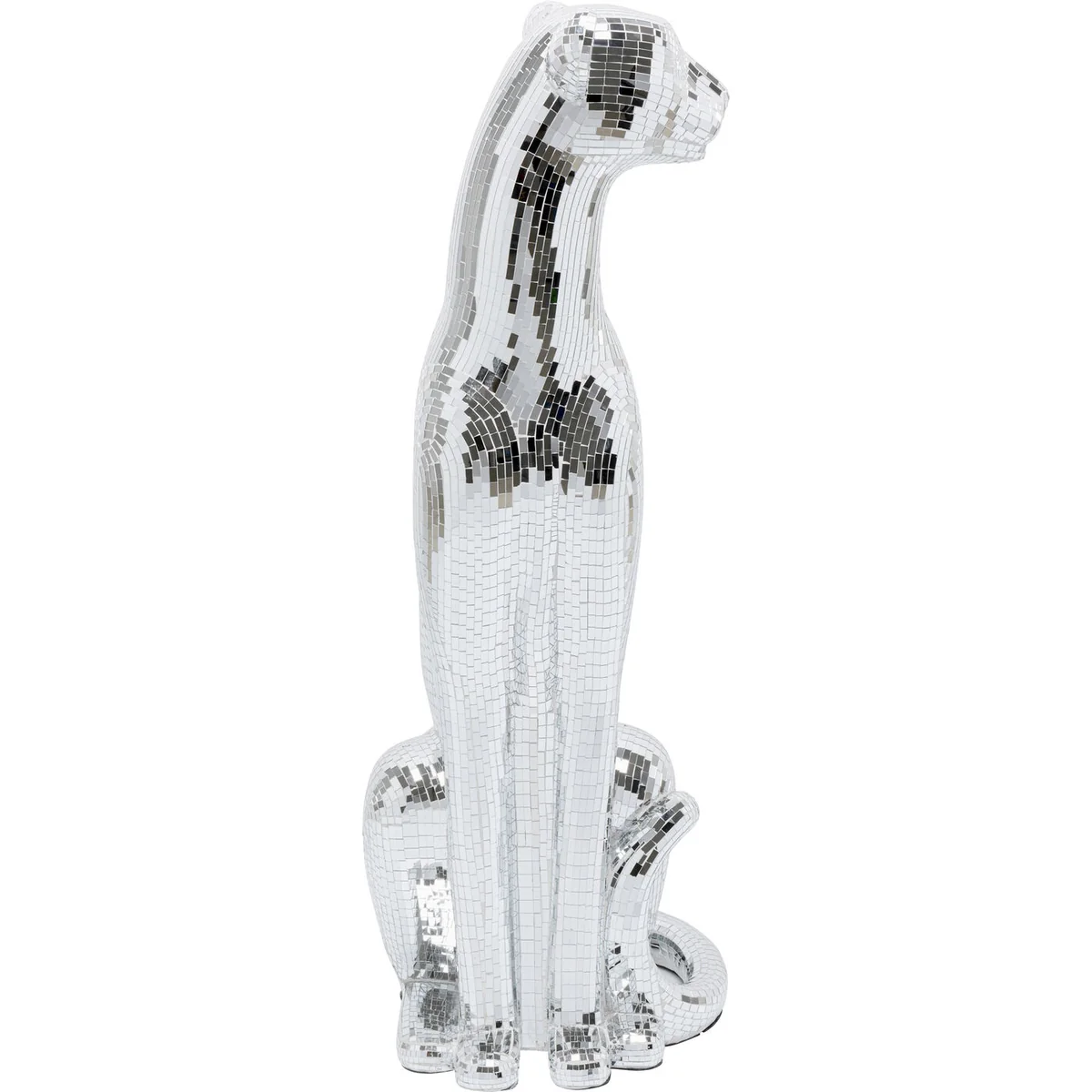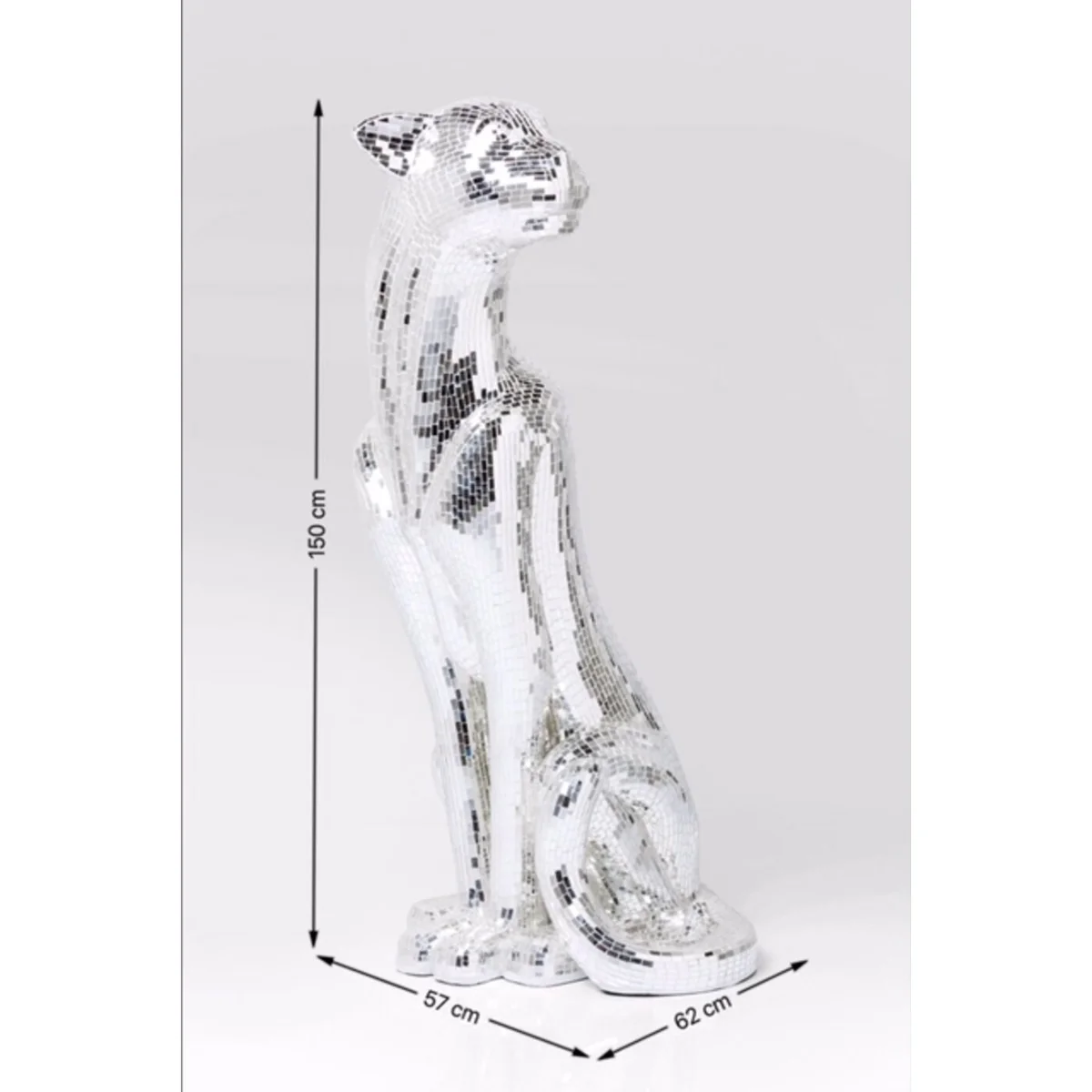 • Large decorative figure panther with silver mosaic, 150 x 68 x 50 centimeters (H/W/D) • The glamorous panther figurine impresses with its elaborate mosaic technique in mirrored glass • Sparkles from every angle thanks to the shiny surface and creates impressive light reflections • Ideal as a standalone eye-catcher or combined with other decorative elements for stylish staging • Perfect for stylish living rooms, modern lounges or elegant bars - a wild highlight in any luxurious ambience