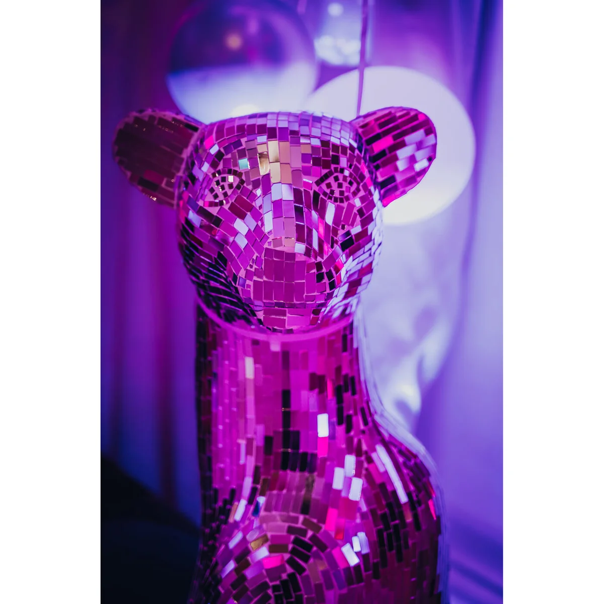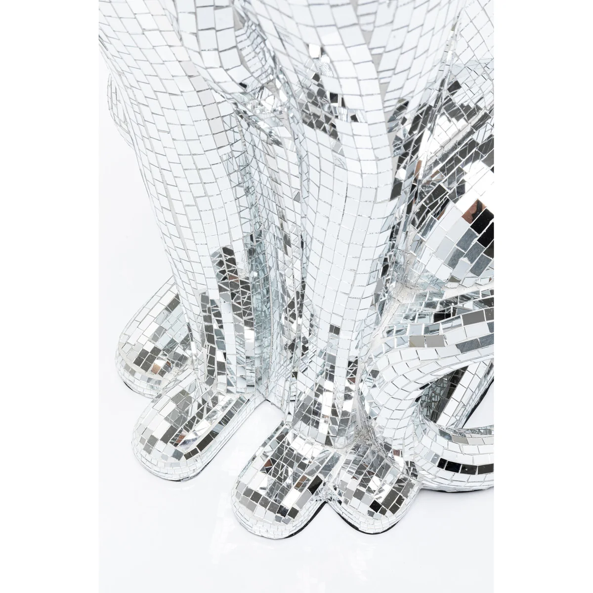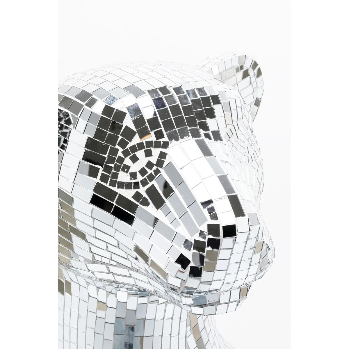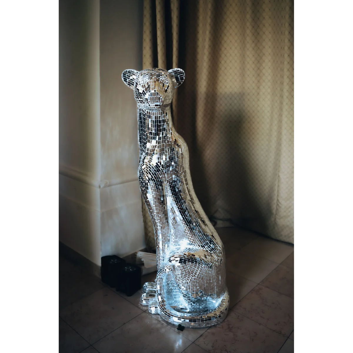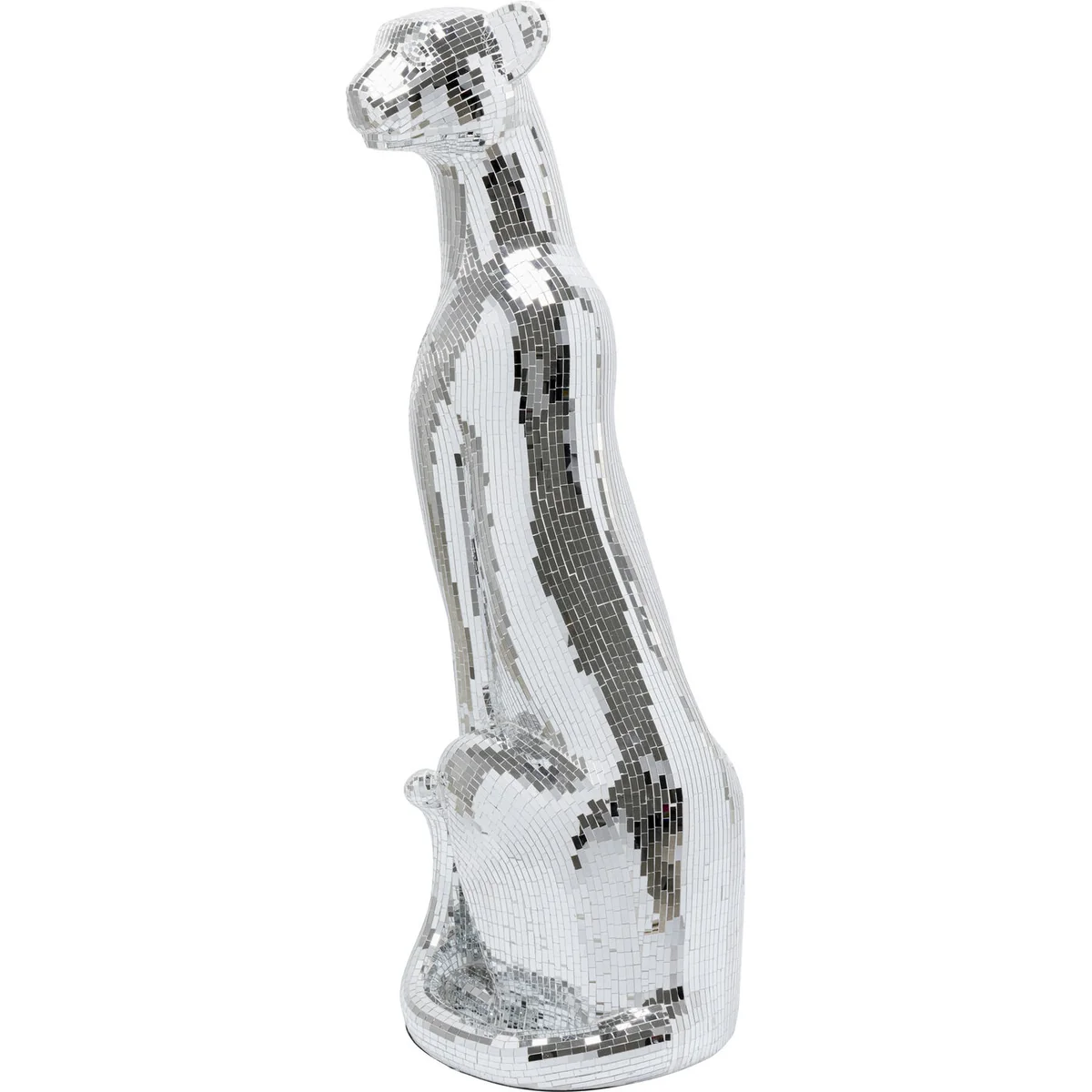 • Large decorative figure panther with silver mosaic, 150 x 68 x 50 centimeters (H/W/D) • The glamorous panther figurine impresses with its elaborate mosaic technique in mirrored glass • Sparkles from every angle thanks to the shiny surface and creates impressive light reflections • Ideal as a standalone eye-catcher or combined with other decorative elements for stylish staging • Perfect for stylish living rooms, modern lounges or elegant bars - a wild highlight in any luxurious ambience
