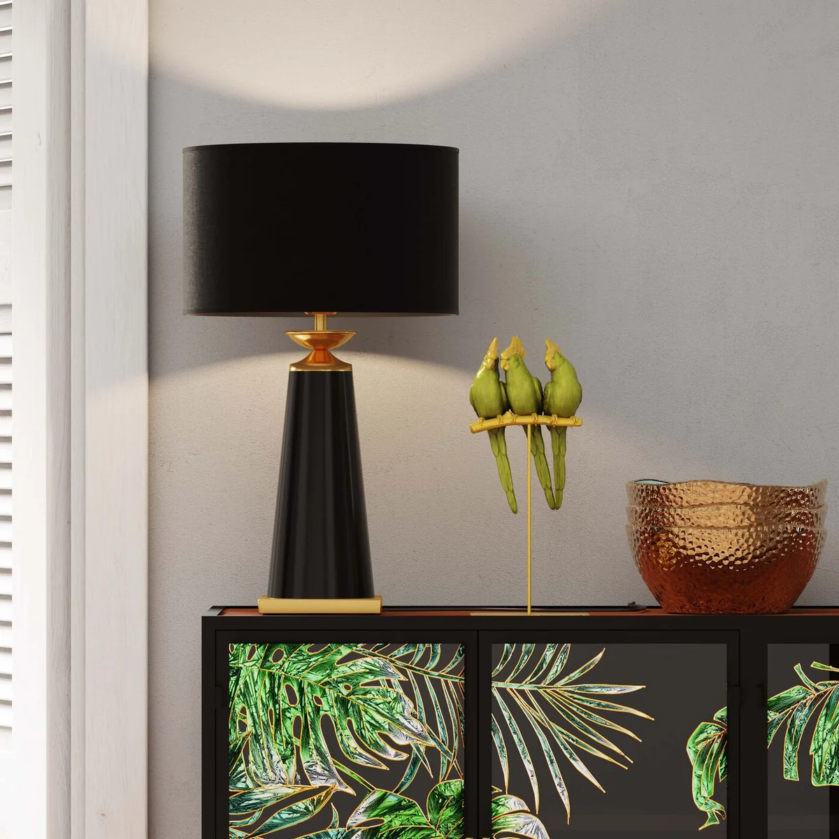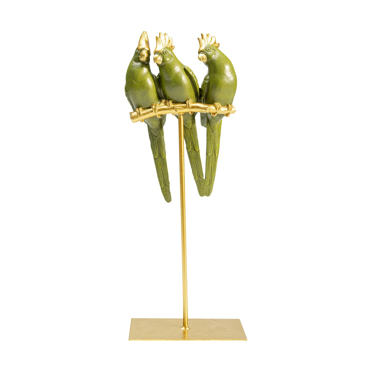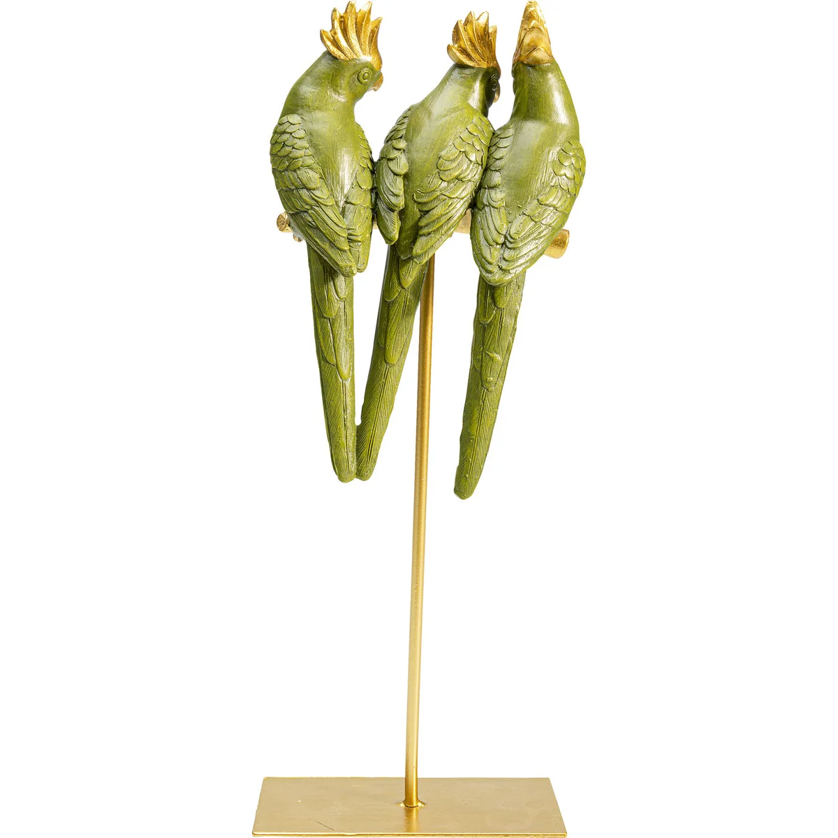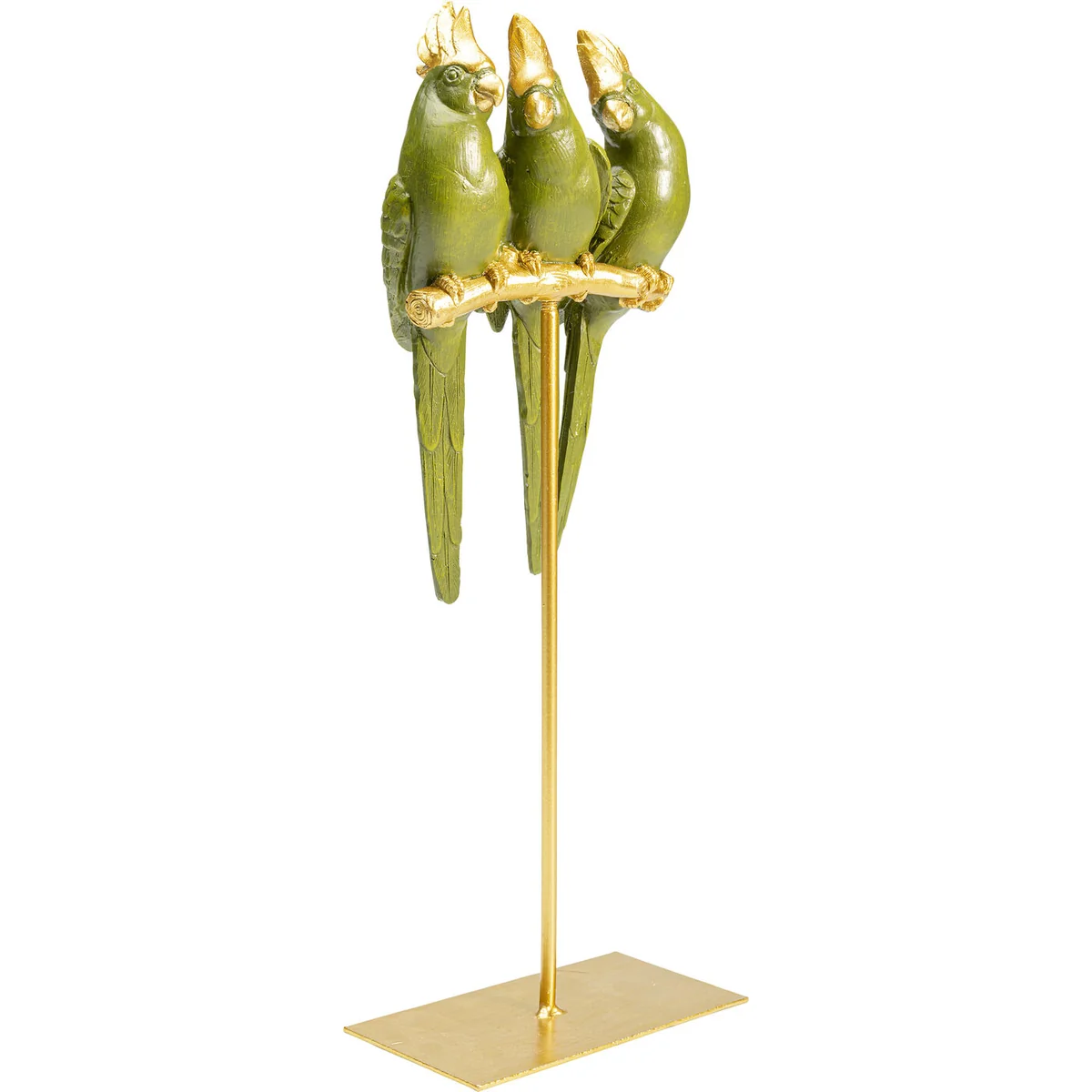 - These three exotic friends with green plumage and gold accents are absolutely easy-care pets - The parrots sit well-behaved on the gold-coloured pole and greet your guests with curiosity - Deco tip: placed on a side table, this cute trio brings life to unused corners - The natural habitat of this deco object is an urban jungle of tropical houseplants - Lovingly hand-painted. The perfect gift for parrot lovers