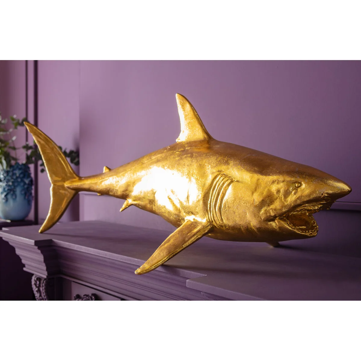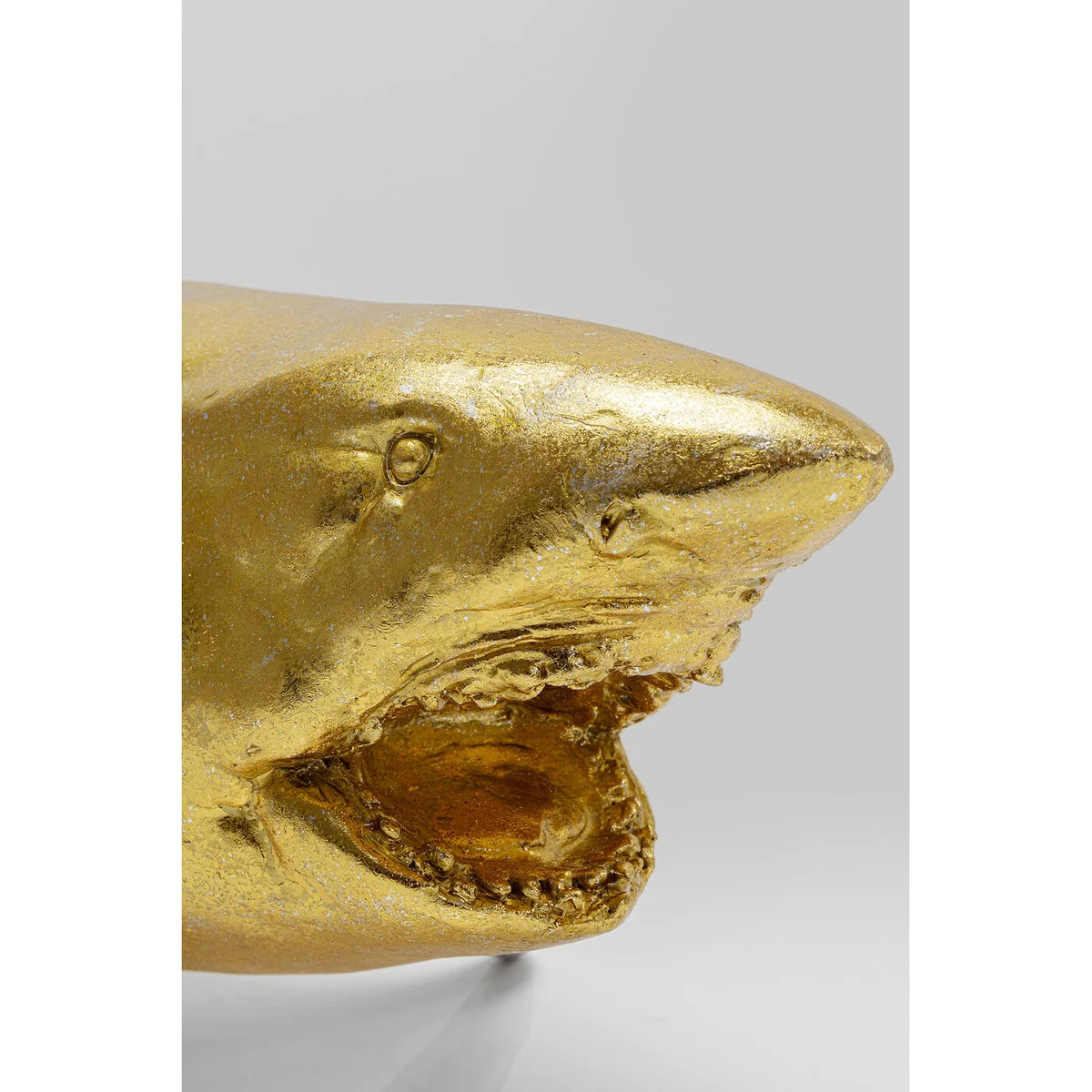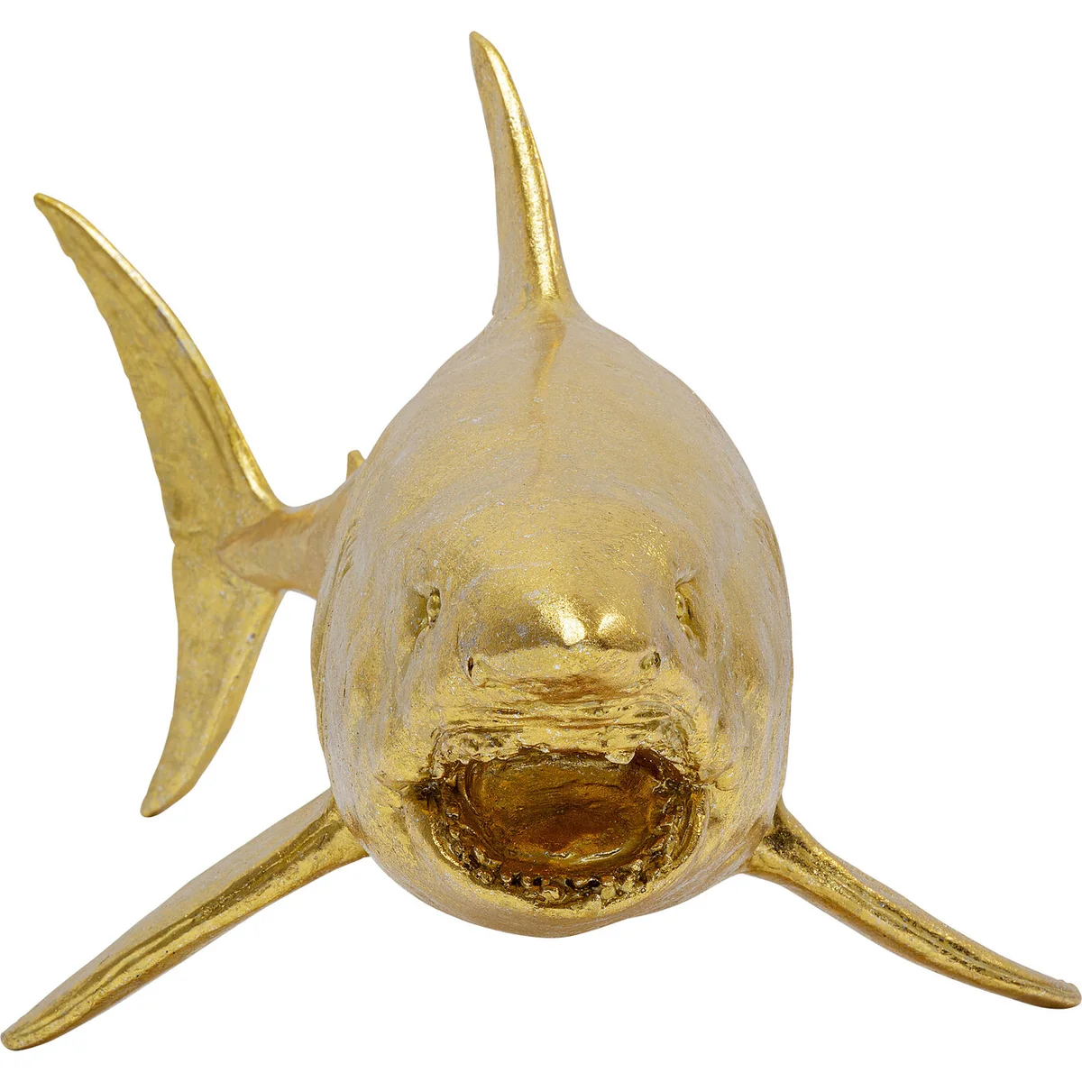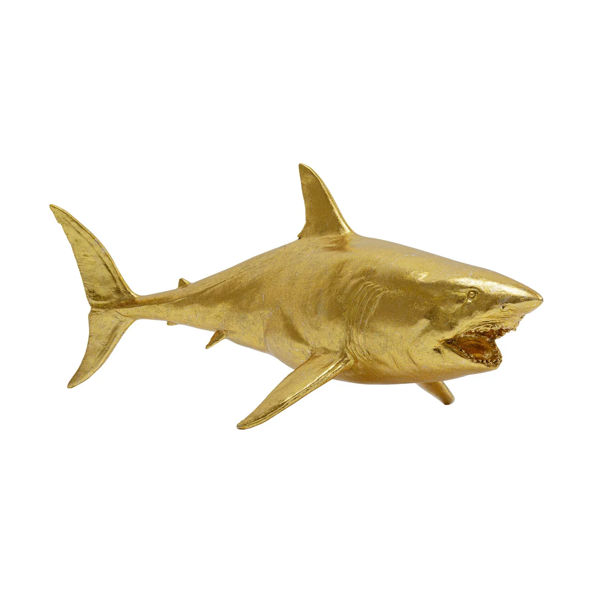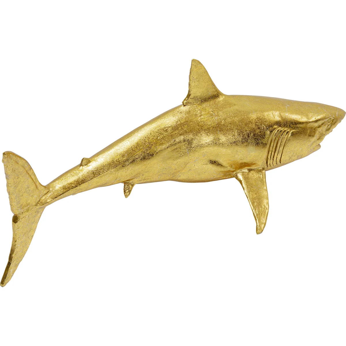 - A golden decorative figure in XL format, 106cm wide - The large shark guarantees moments of wonder - An effective statement as a decorative idea in the living room - Highly detailed and lifelike - partly made by hand