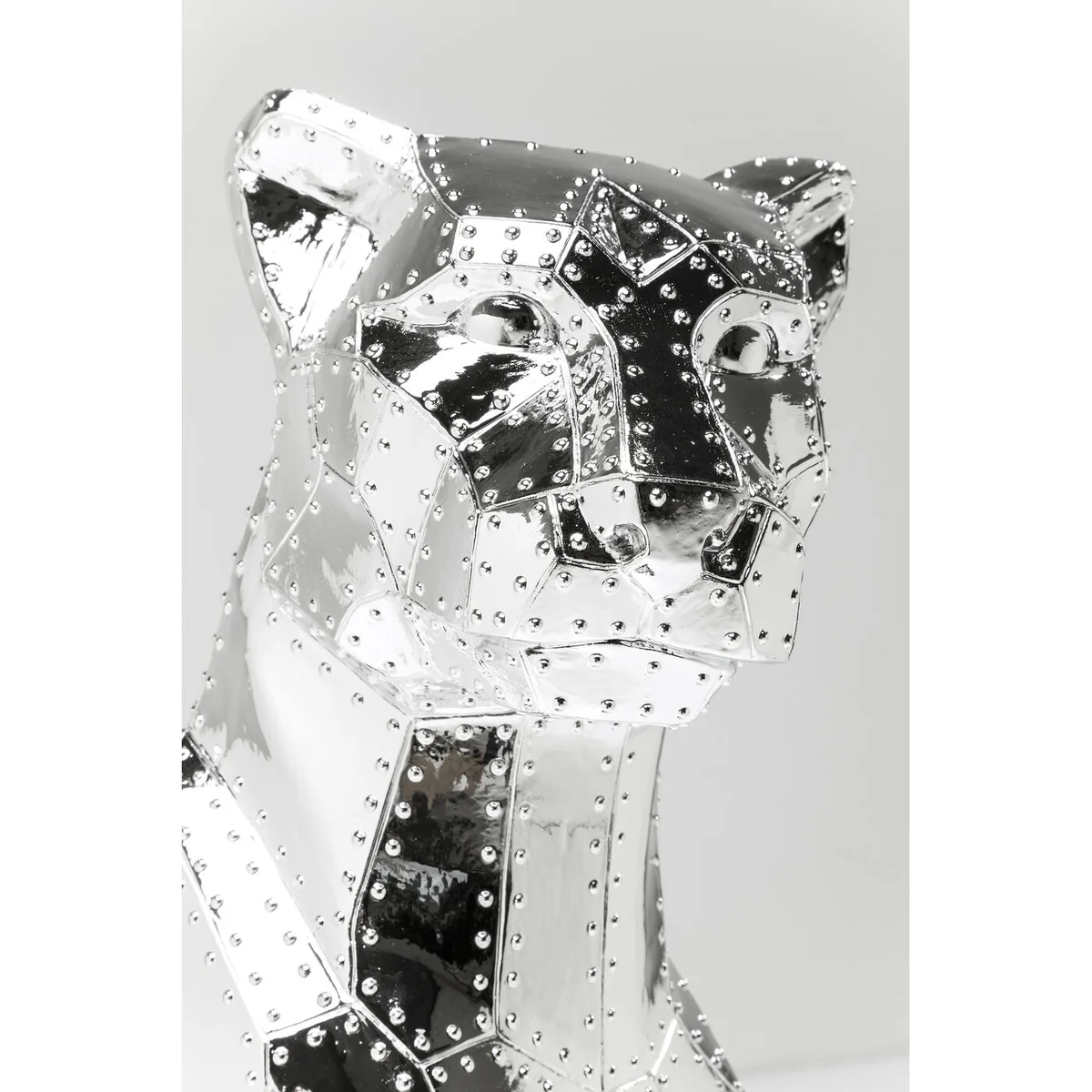 Bring a touch of whimsy and style to your home with this Silver Sitting Cat Rivet Chrome Deco Figurine in polyresin.