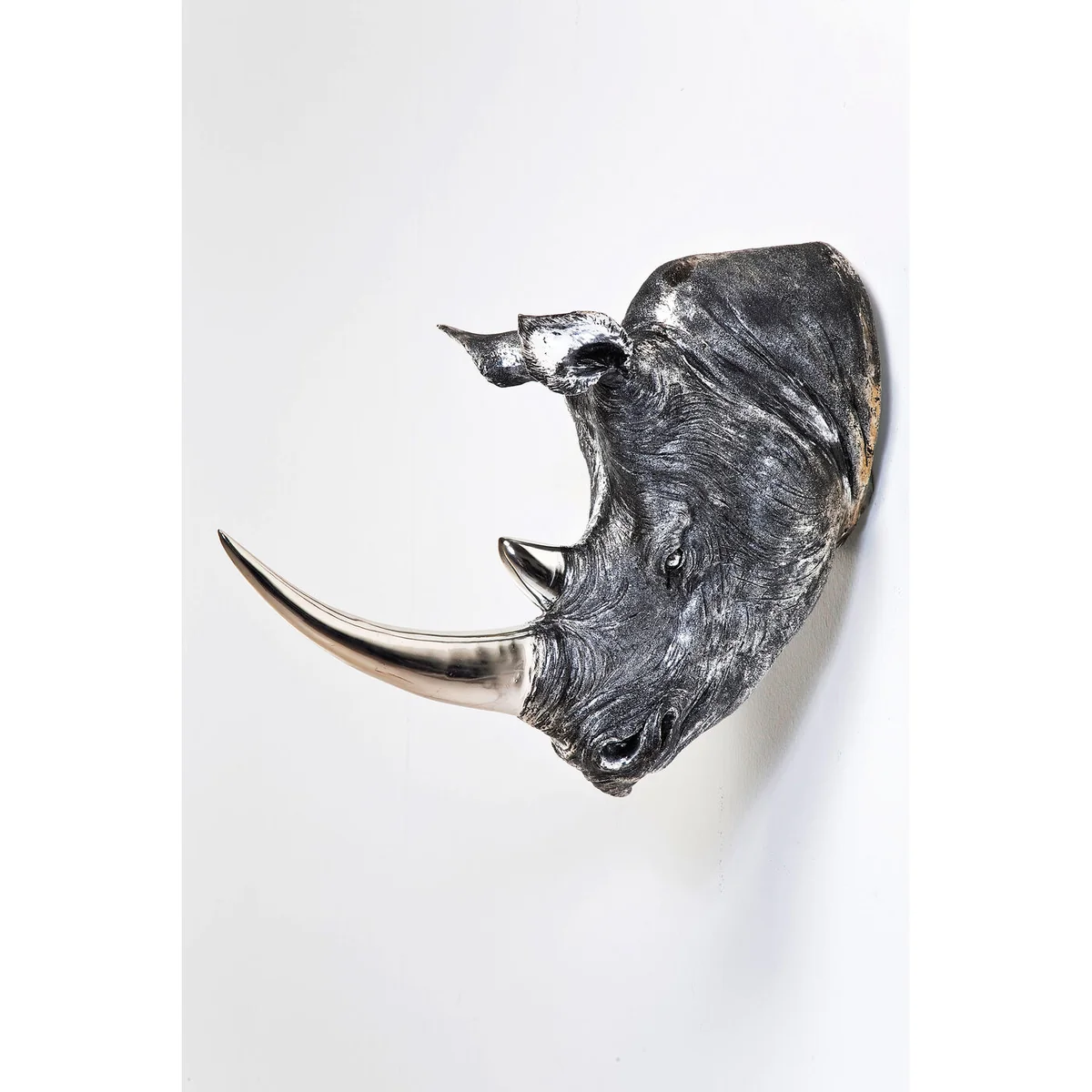 Our Rhino Deco Head is crafted from durable polyresin and electroplated in a rich, antique silver finish. Its dimensions are L 44 cm, D 19 cm, and H 53 cm, making it a sizable and noticeable piece.