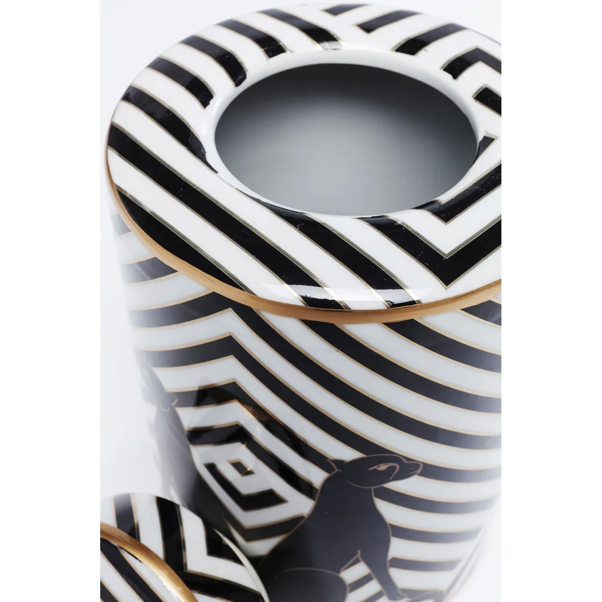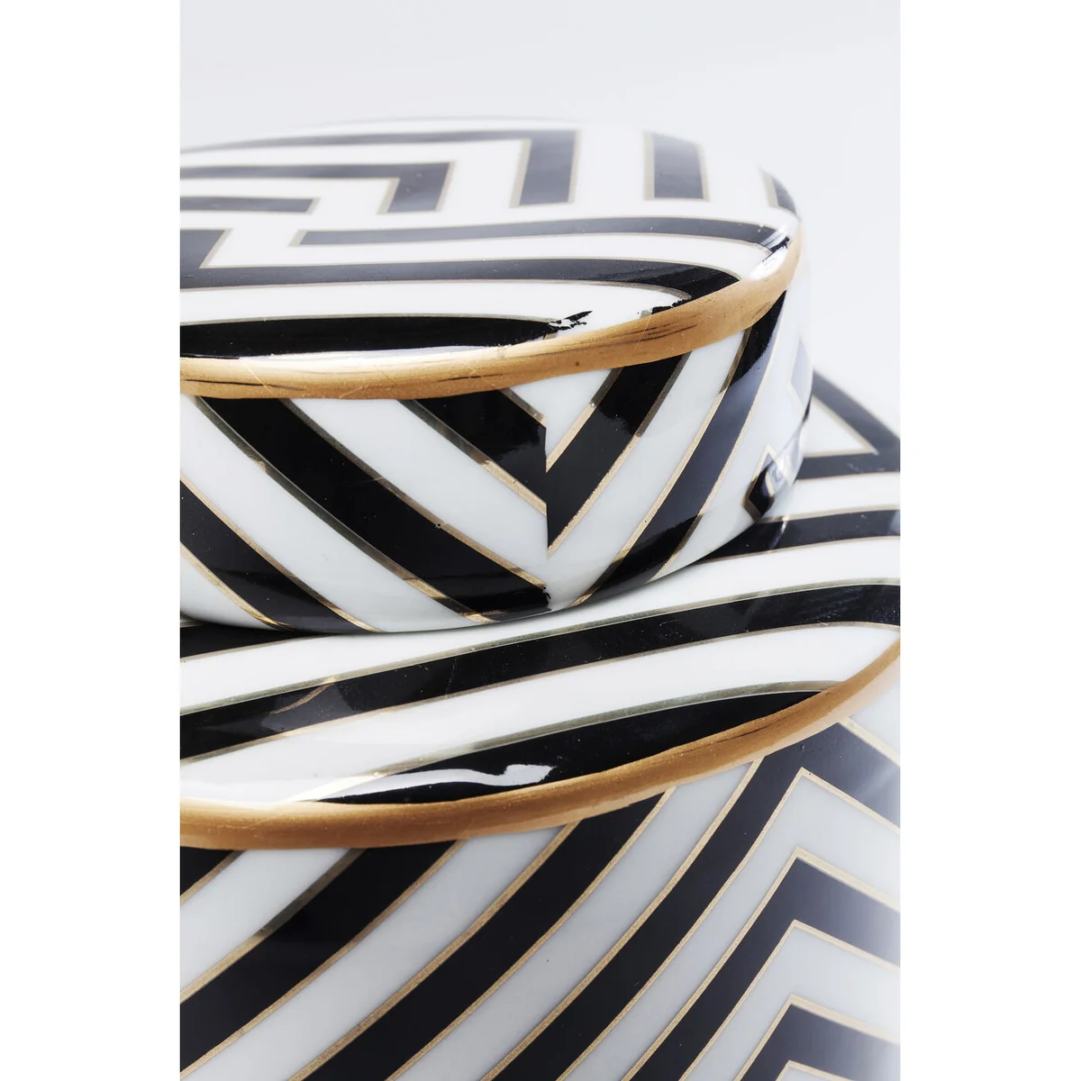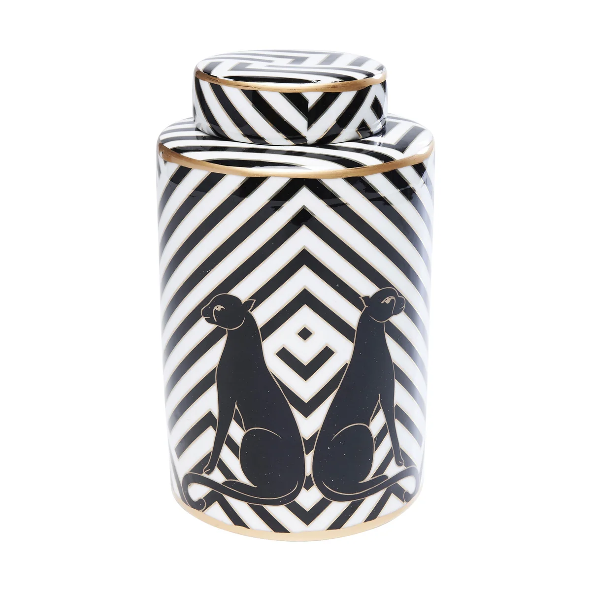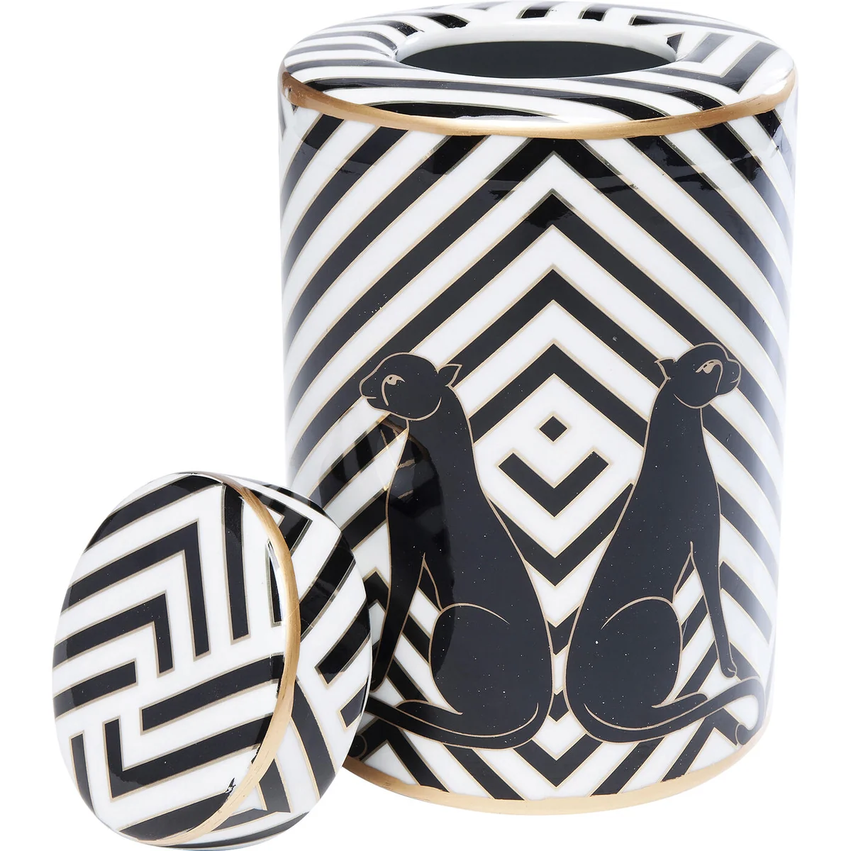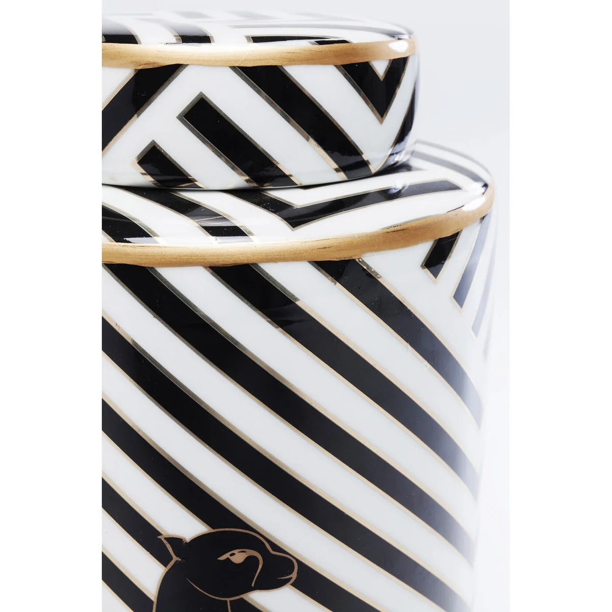- Wow! This large ceramic decorative container is a real eye-catcher and ensures glamorous elegance in every corner. - Super noble design: black and white stripe pattern in typical art-déco style, golden details and stylised panthers. - A typical the apartment-seems-instantly-more-fancy-piece: classic design can do something! - - With a height of 25 cm this vessel can also be used as a vase: e.g. for white long-stemmed lilies - Also very impressive as decoration in happy-chic style on a sideboard or bookshelf.