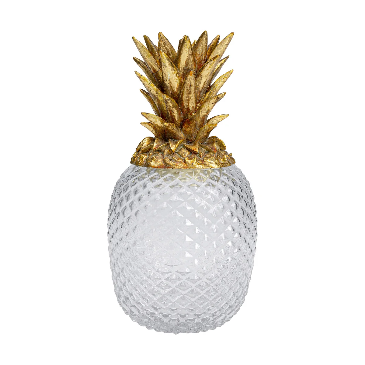 • Decorative container in the shape of a pineapple with a gold-coloured lid and transparent body • A sweet little fruit that will hold your supply of hair bands, cotton wool pads and whatever else you need to store • As a convenient feature, the decorative pineapple is made of polyresin and therefore not as fragile as glass • An exotic eye-catcher with practical features in the bathroom, bedroom and on the hall chest of drawers • What more could you want! • Handcrafted with a love of detail and therefore unique, it may vary slightly from the illustration
