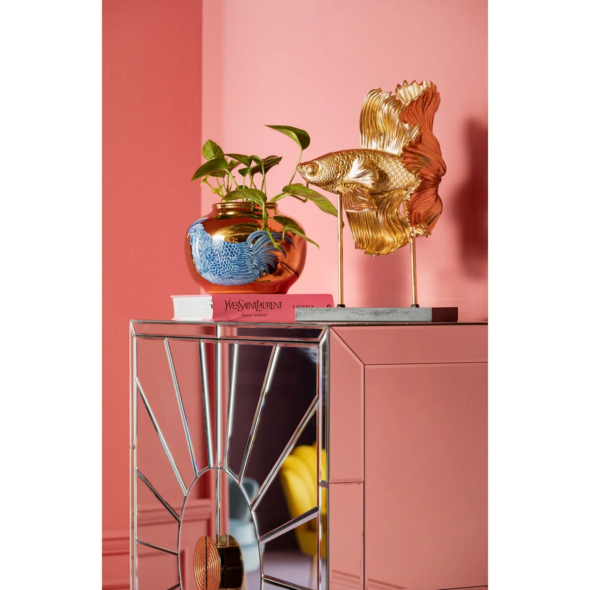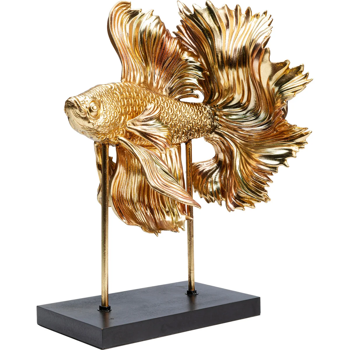 - A golden decorative object of a fish - An original marine figure and an exclusive, partly handmade piece - An original table decoration which will create a guaranteed impact in your home - Large, curved fins give the figure an extra striking effect - Ideal for decorating sideboards, shelves and chests of drawers