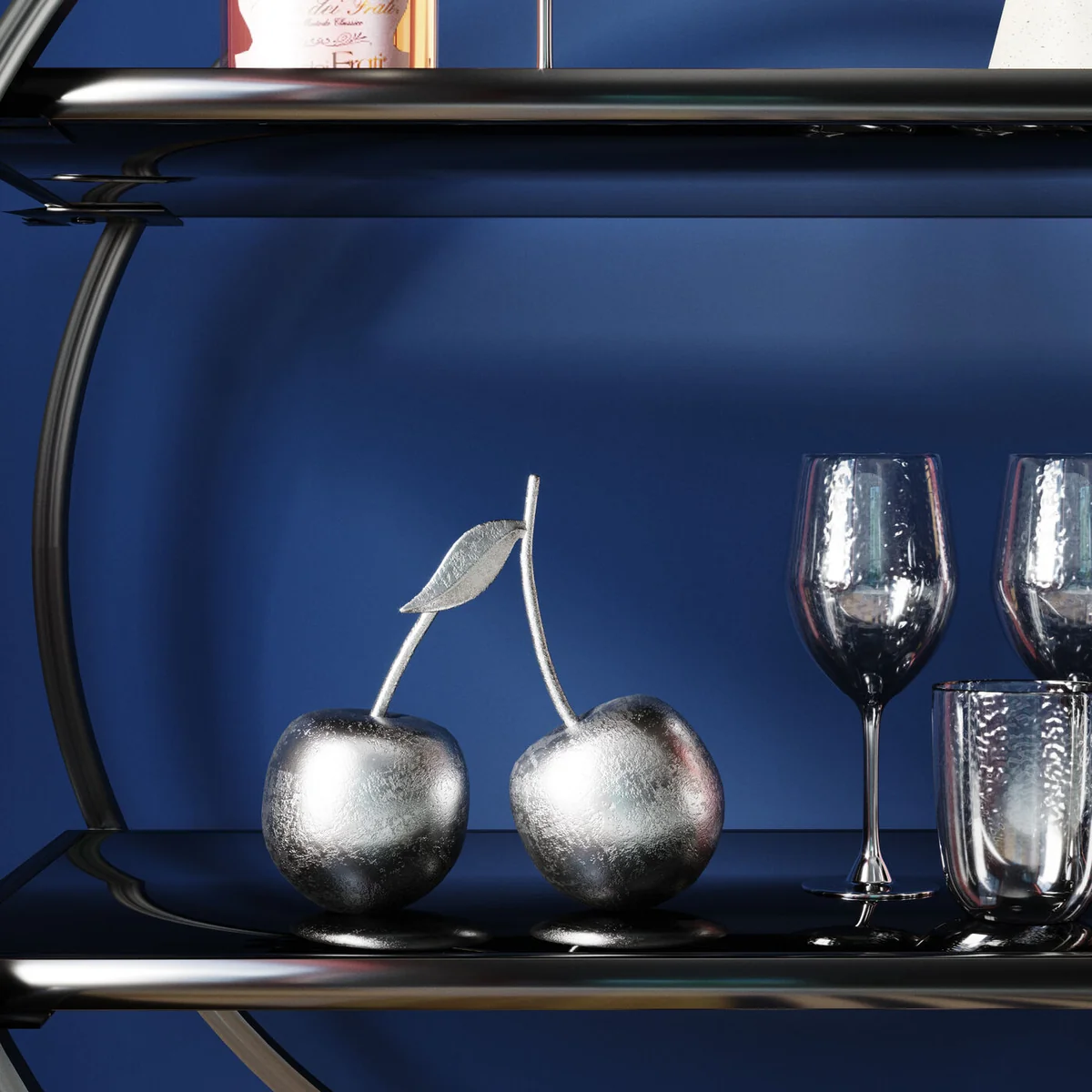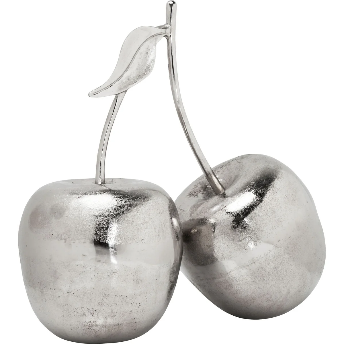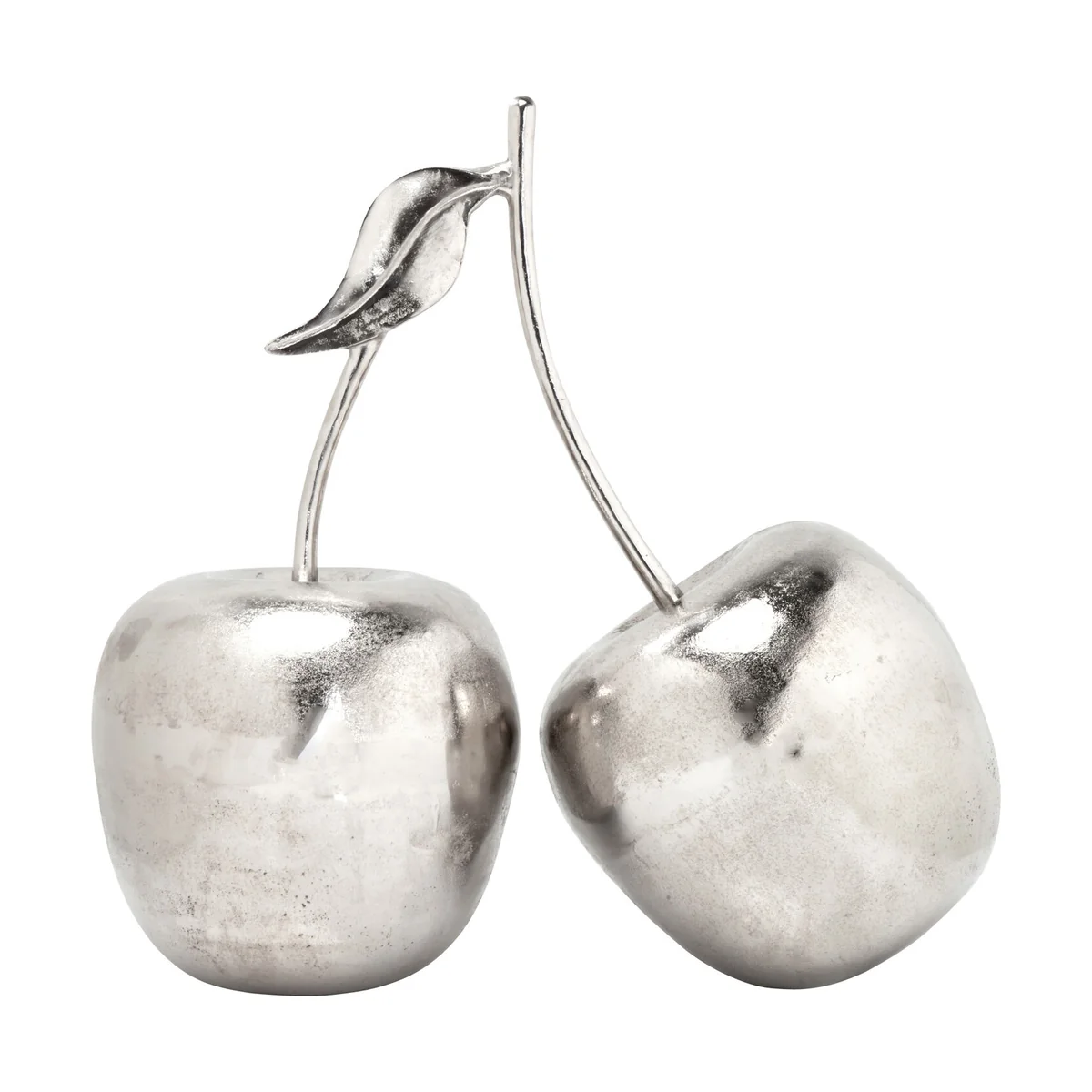 Anybody can do fruity - in contrast the Cherry decorative object features an exclusive silvery finish instead of imposing itself in bright red. This enables the accessory to form part of stylish and ingenious combinations. With its cool effect the design becomes highly expressive, in particular with glass, metal and mirrors. The two cherries are connected not just by a stalk and leaf, but also by a surface polished to a high gloss and their bold modernity. Comes in various sizes.
