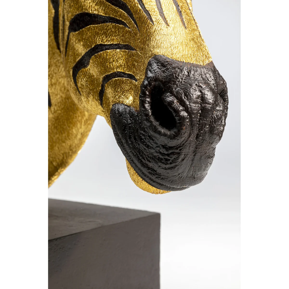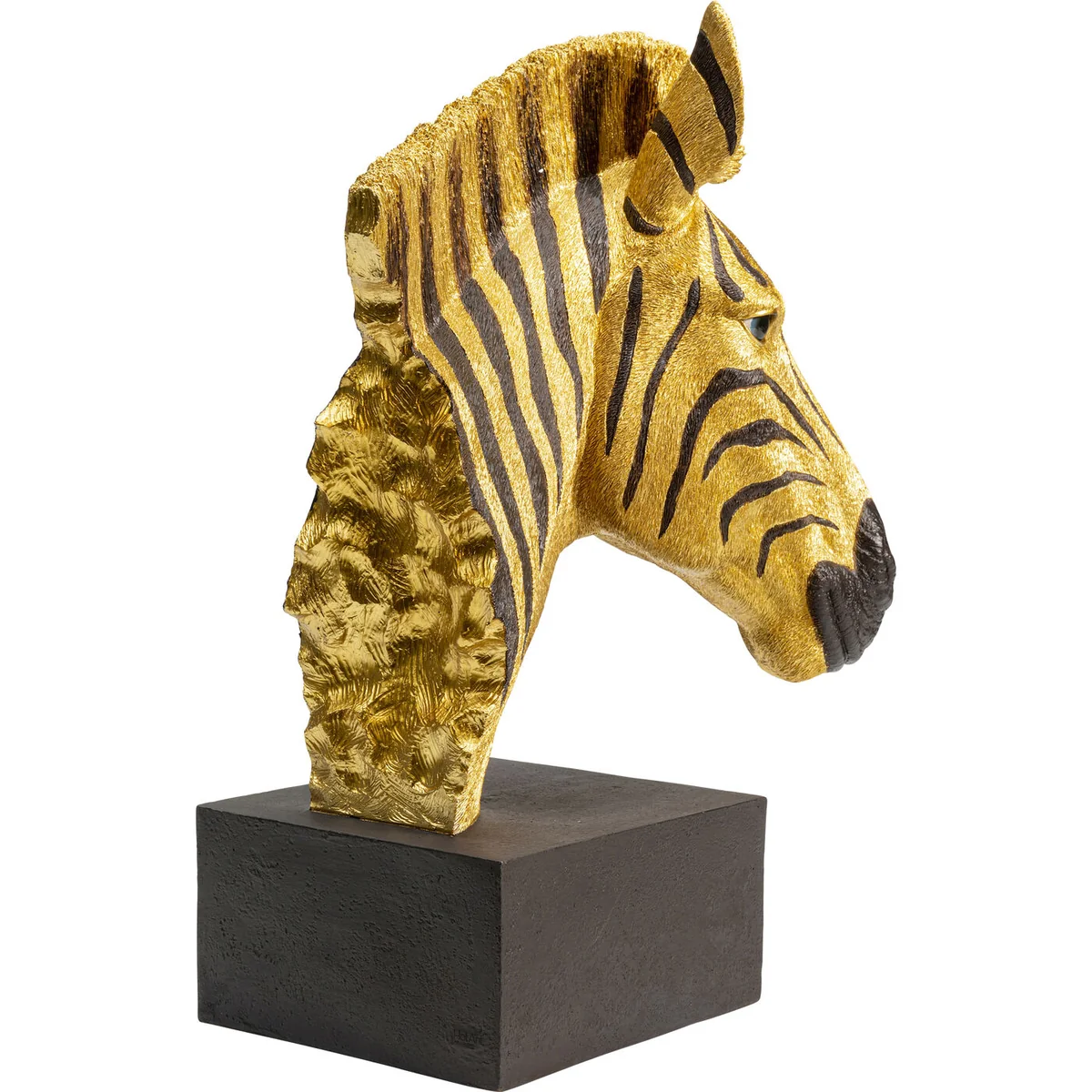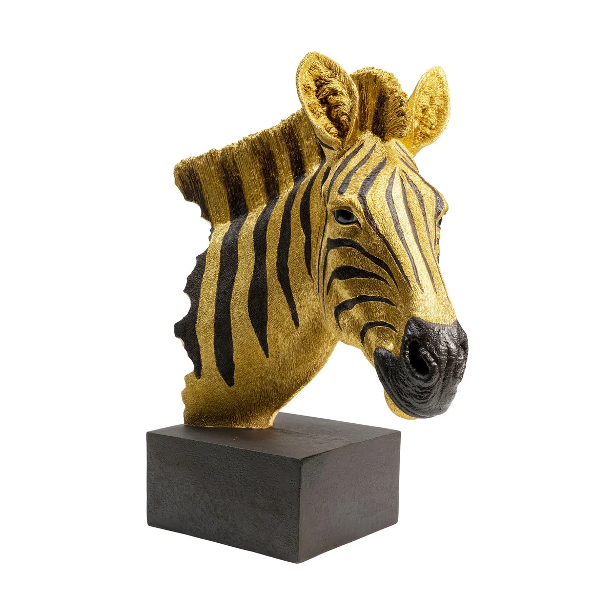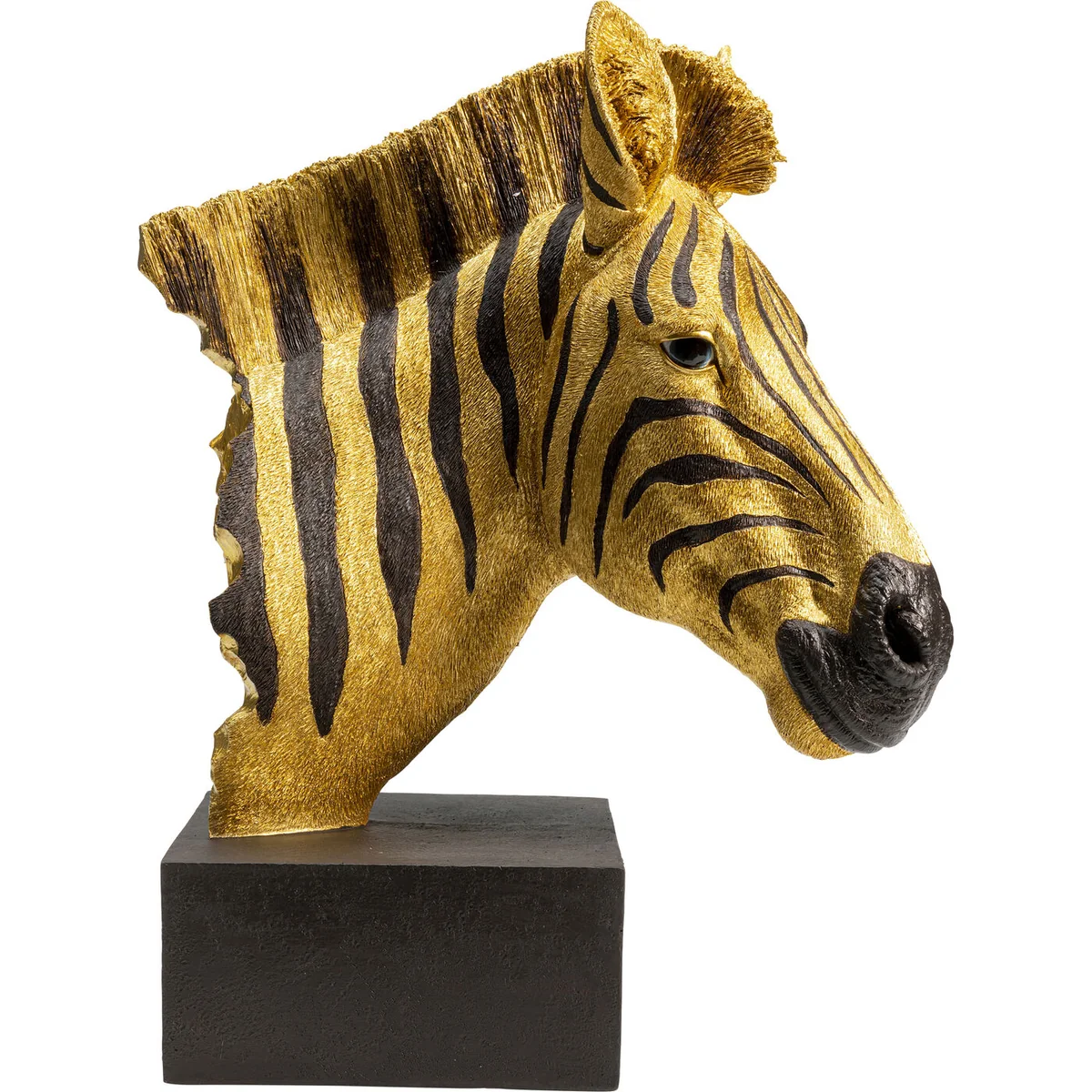 - Golden zebra head as a decorative object made of polyresin - Lovingly crafted down to the smallest detail - Each zebra is unique and made by hand - The cube-shaped base gives the zebra head support - An animal-friendly trophy for Africa fans and lovers of eccentric interiors