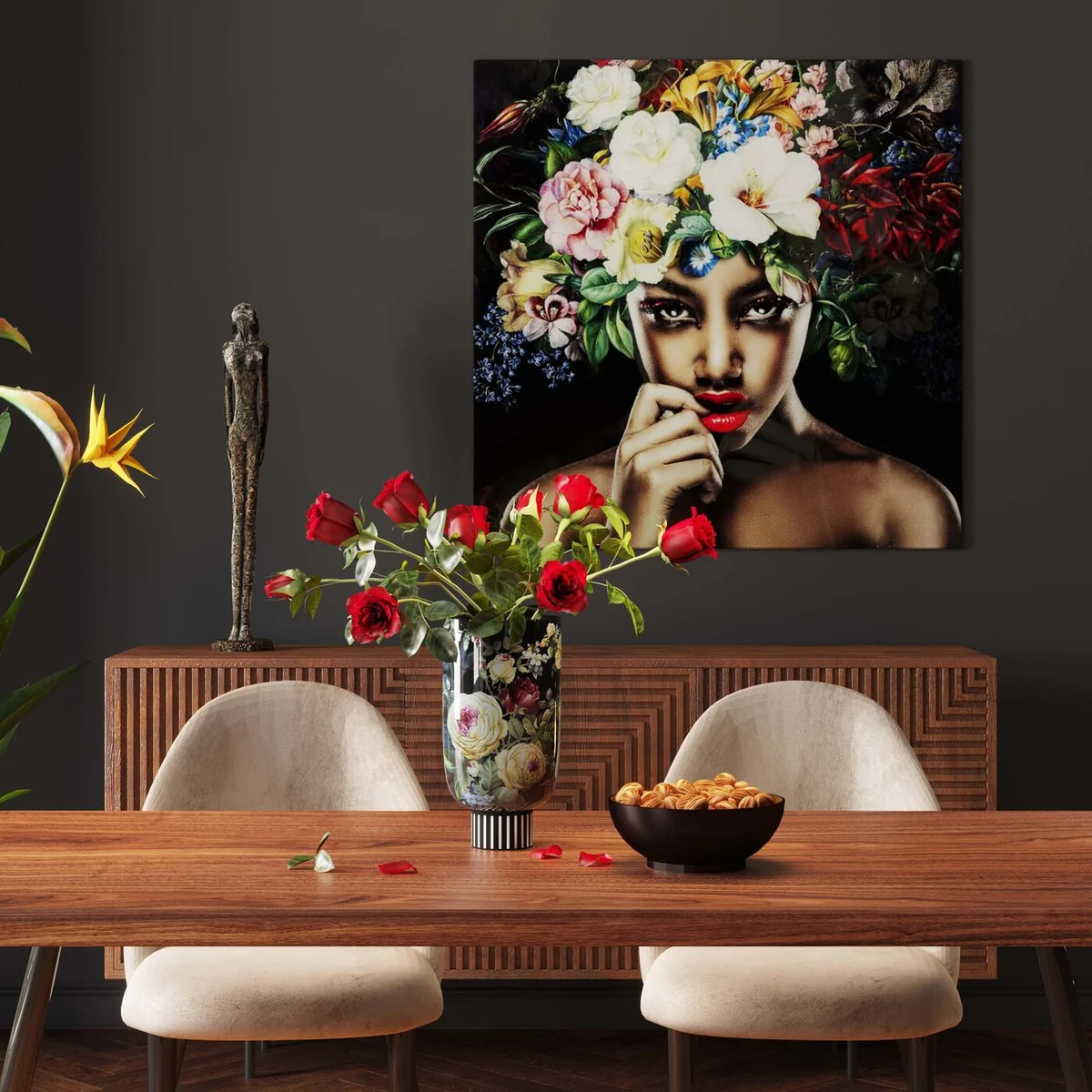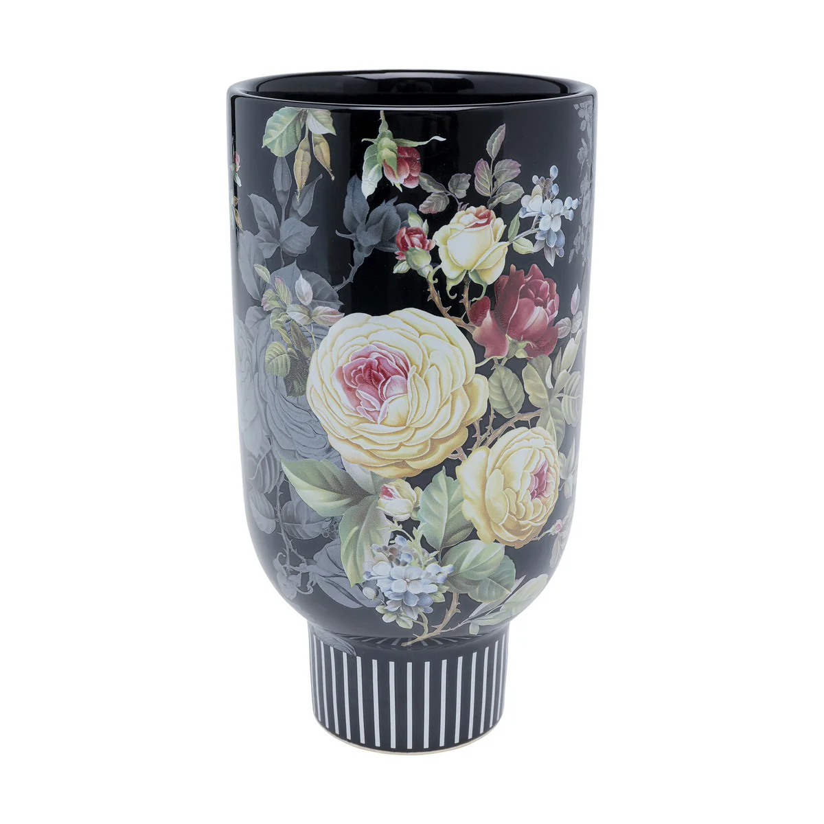 - Handmade: a stylish vase with rose decoration on a black backround - Material: made of earthenware, suitable for dry bouquets, dry twigs and grasses - Romantic: the design and the floral pattern harmonise well with the country house style - Size: with a height of almost 27 cm, medium sized and versatile - Tip for use: for fresh bouquets of flowers, please fill water in a separate jar and insert it into the decorative vase
