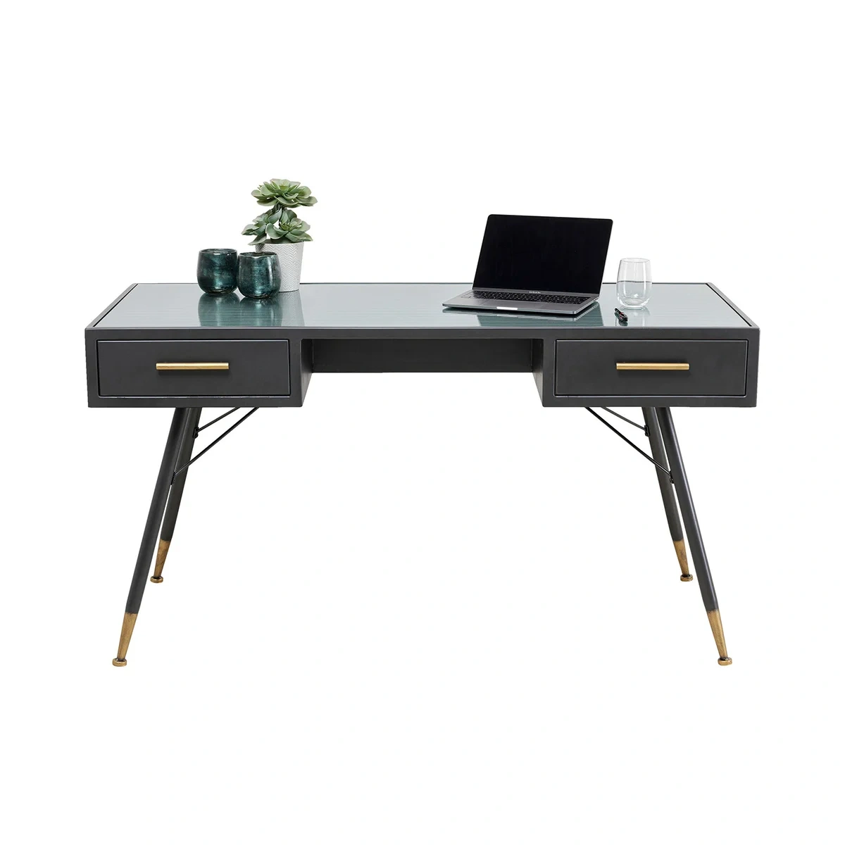 The metal desk from the Gomera collection captivates with its casual mix of robust steel and a glass top with a scalloped edge.