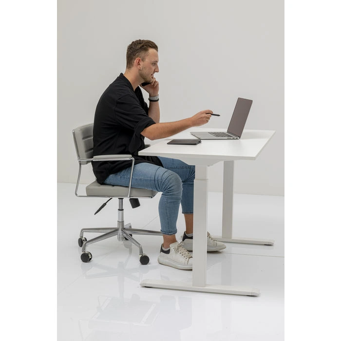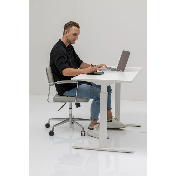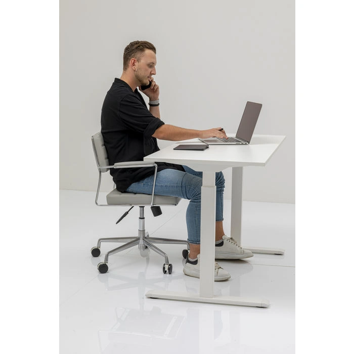 Our electrically height-adjustable desk is a real enrichment for everyday office life: thanks to the change from sitting to standing it encourages a healthy ergonomic posture and improves performance. With their all-over white look the silky matt white structure of the decorative MFC top and the lacquered white steel frame also look absolutely stylish in any study or office.