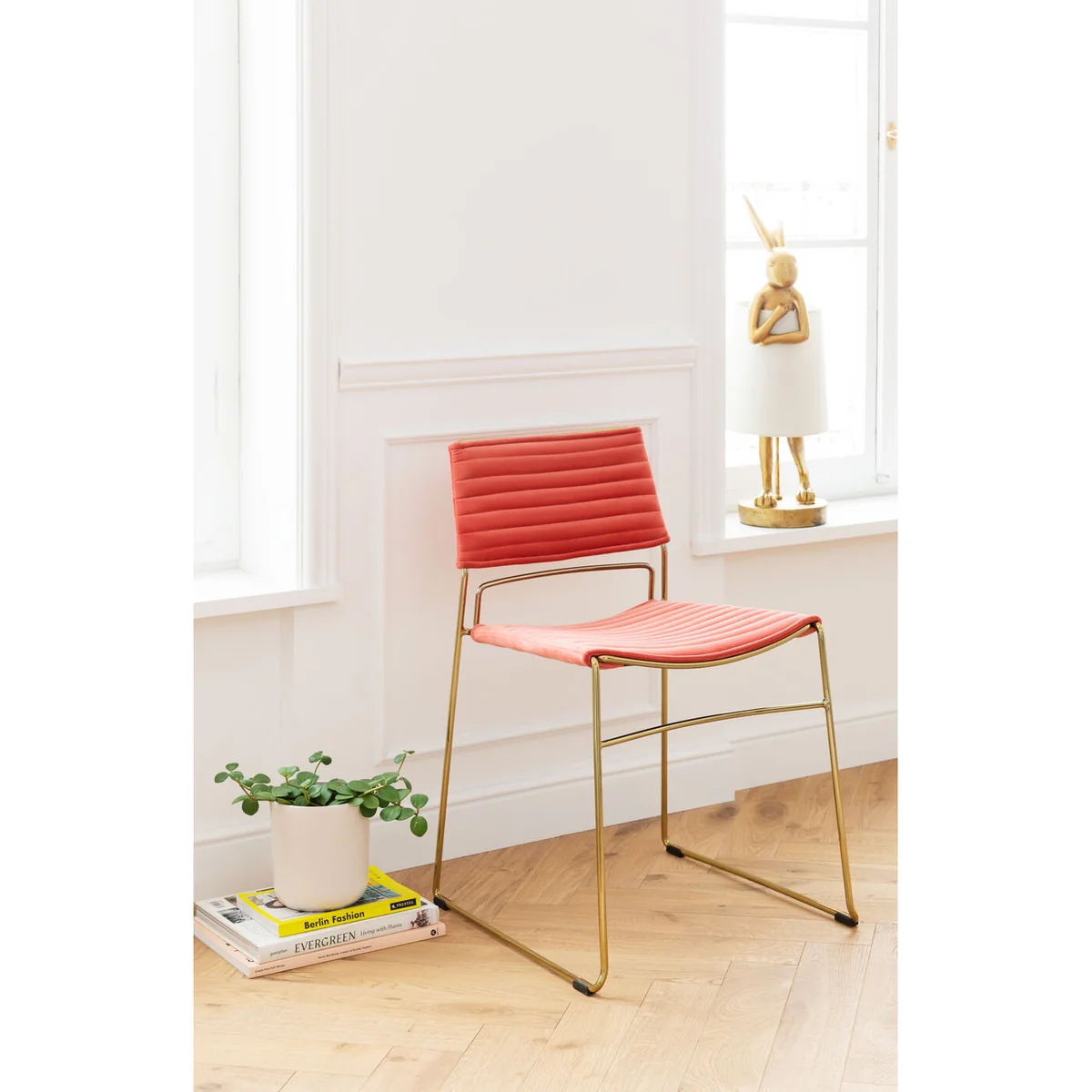 Wow! This chair is a real design statement: velvety ribbed upholstery in the trendy colour of "living coral" on a golden tubular steel body. The formal language of this chic roommate is based on Bauhaus classics, while the trendy colour combination comes from the here and now.