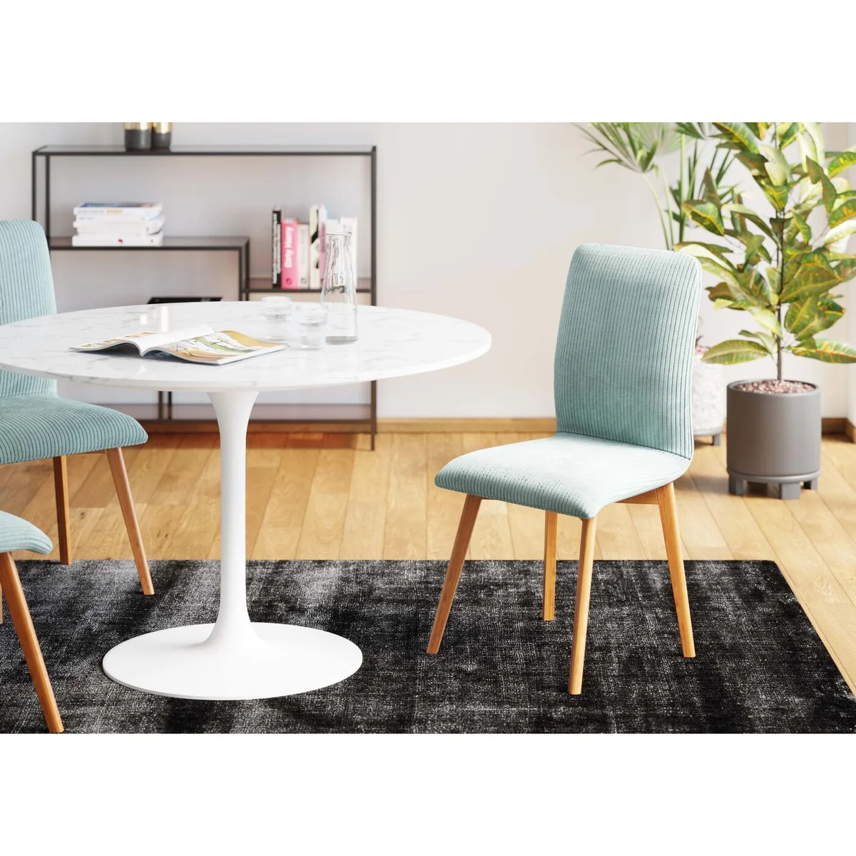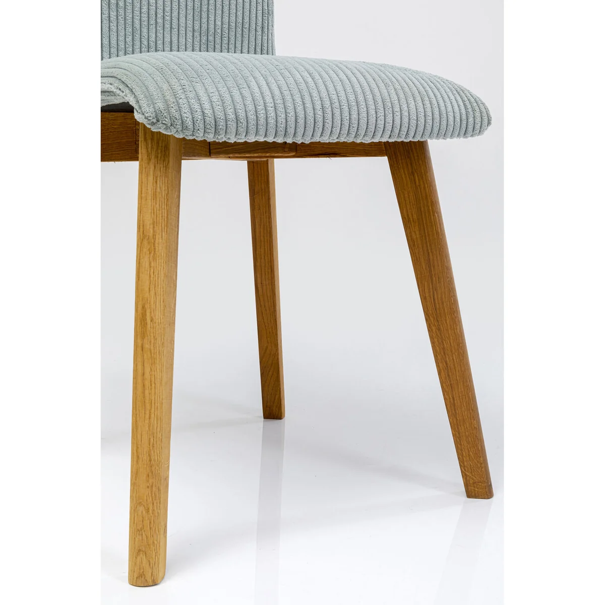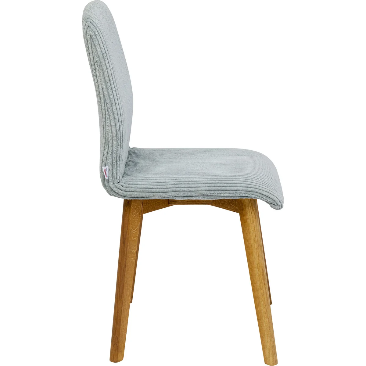 Oak wood and the delicate light-blue cover give the chair Lara visual lightness and Scandinavian style. It is a dining-room chair that has the talent to be an all-rounder in the whole home! Whether in the bedroom as a place to put clothes, by your desk or dressing table or in the hallway where you put on your shoes next to the coat rack: with its neutral colours and pure lines, this comfortable upholstered chair will cut a fine figure anywhere.