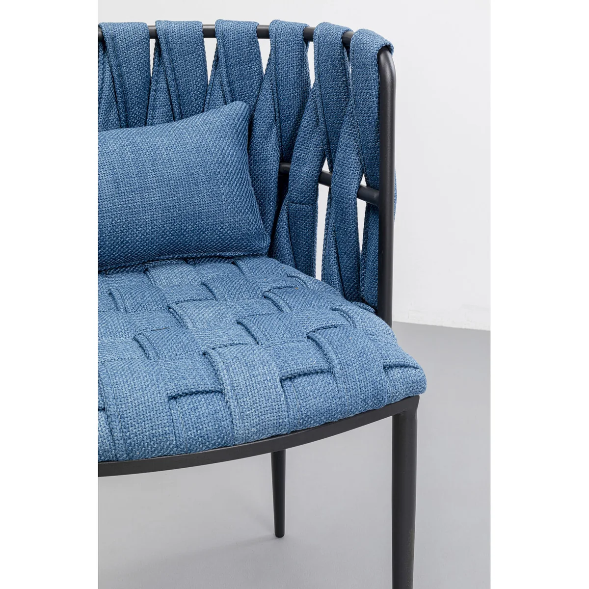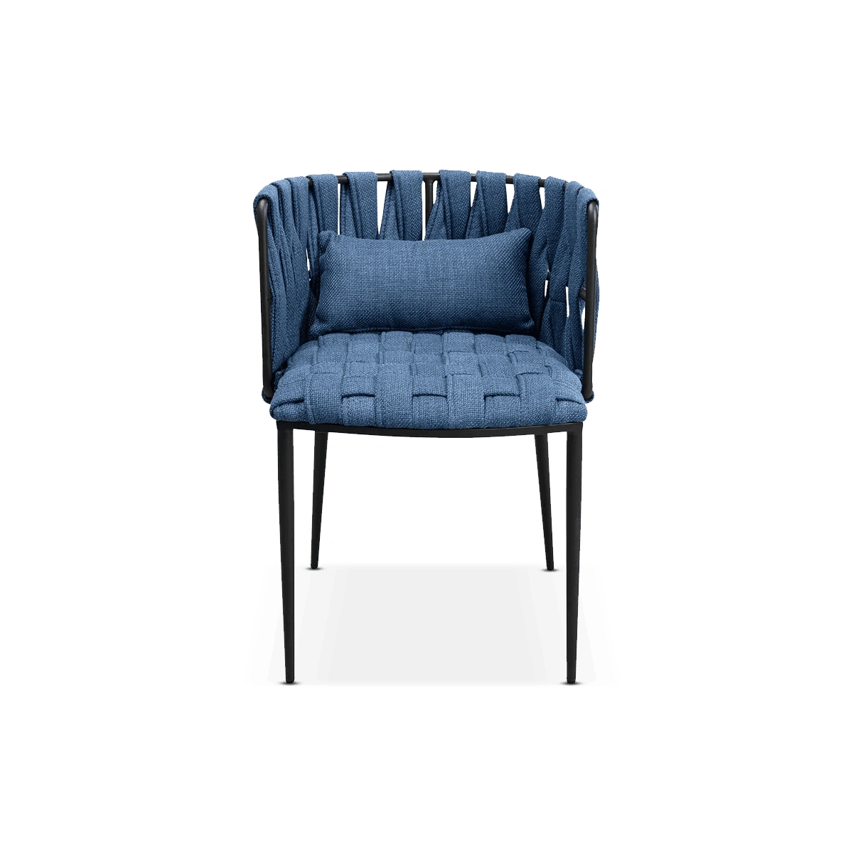 Blue upholstery and a curved backrest give the Saluti dining chair a comfortable, modern character. Suited to everyday meals and casual gatherings, the soft seat and clean profile work well in relaxed dining spaces. Coordinates with other pieces from the Saluti collection for a cohesive setting.
