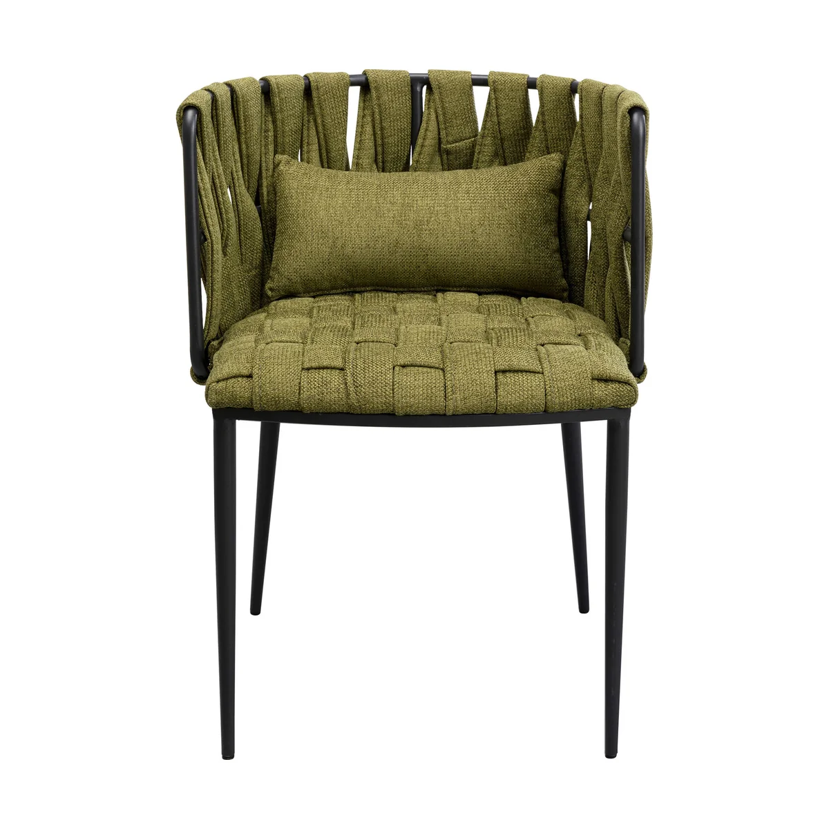 Discover our modern all-in-one solution when it comes to chairs with arms. The Saluti model in natural, dark green shows its versatility at the dining table or desk. Here, function meets a special design. The seat woven with wide fabric bands and the matching covering of arm and backrest made of easy-care synthetic fibre give this piece of furniture a unique character. Perfect for contemporary spaces that combine style and practicality.