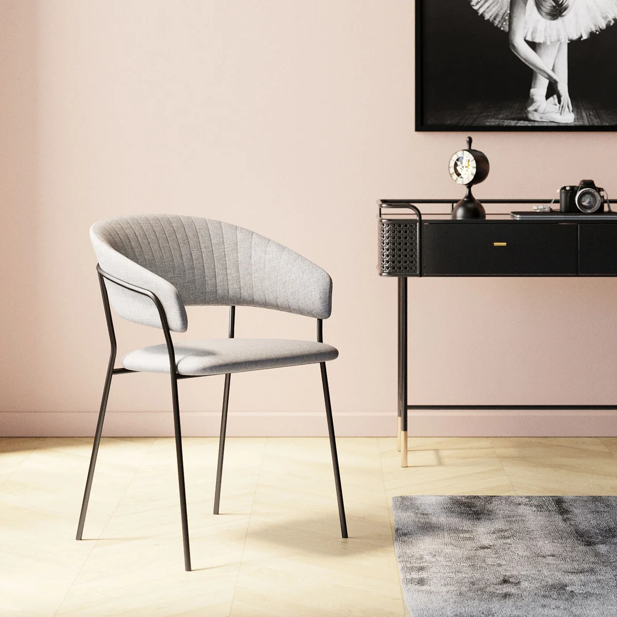 The Belle Dining Chair in beige offers understated elegance with its soft upholstery and clean lines. The armrests add extra comfort, making this chair the perfect addition to a dining space that seeks both style and relaxation.