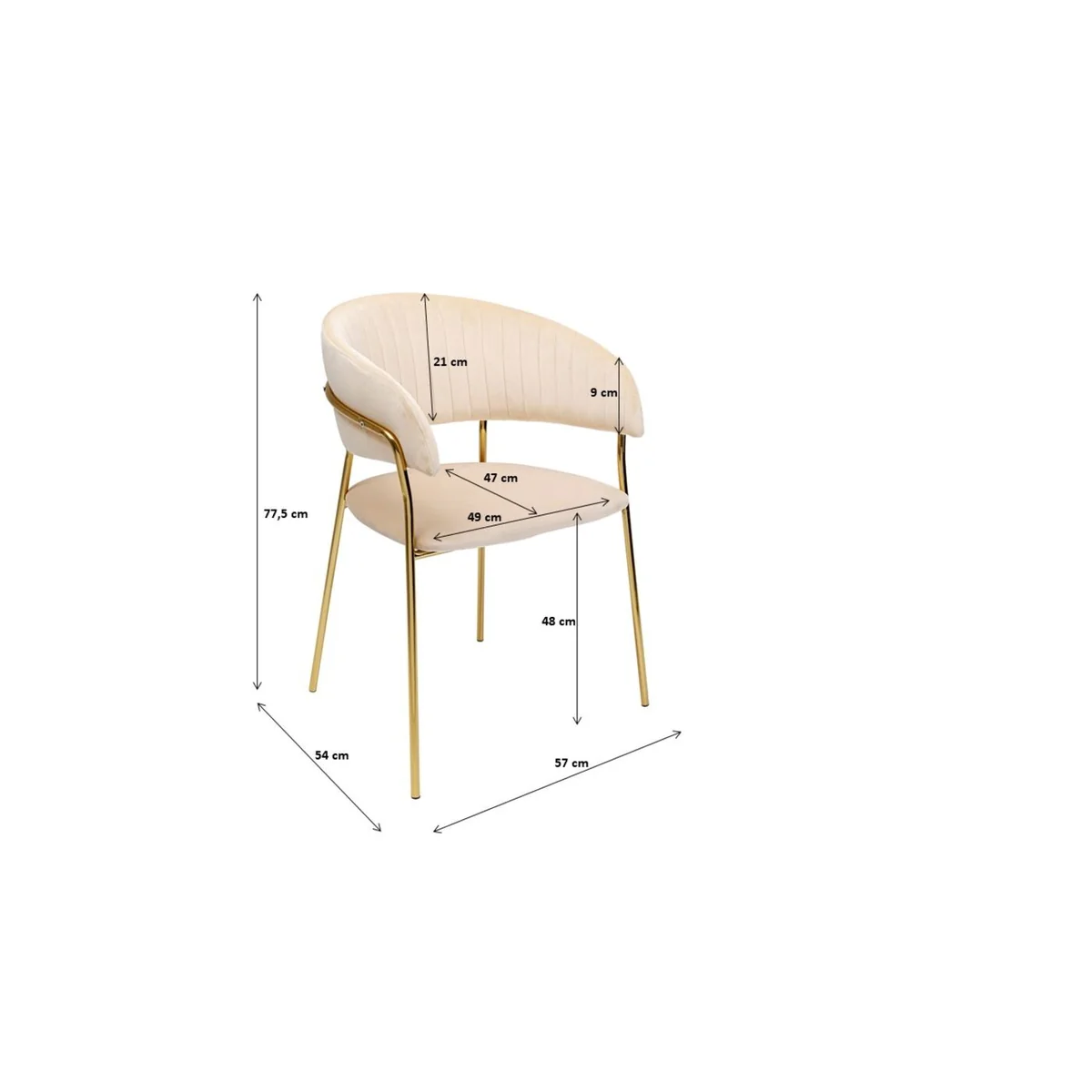 Key features of this chair include its plush velvet look and armrests. It's made of 100% polyester, ensuring durability and long-lasting use. The chair measures 57 cm in length, 54 cm in depth, and 77.5 cm in height, making it a perfect fit for any dining setup.