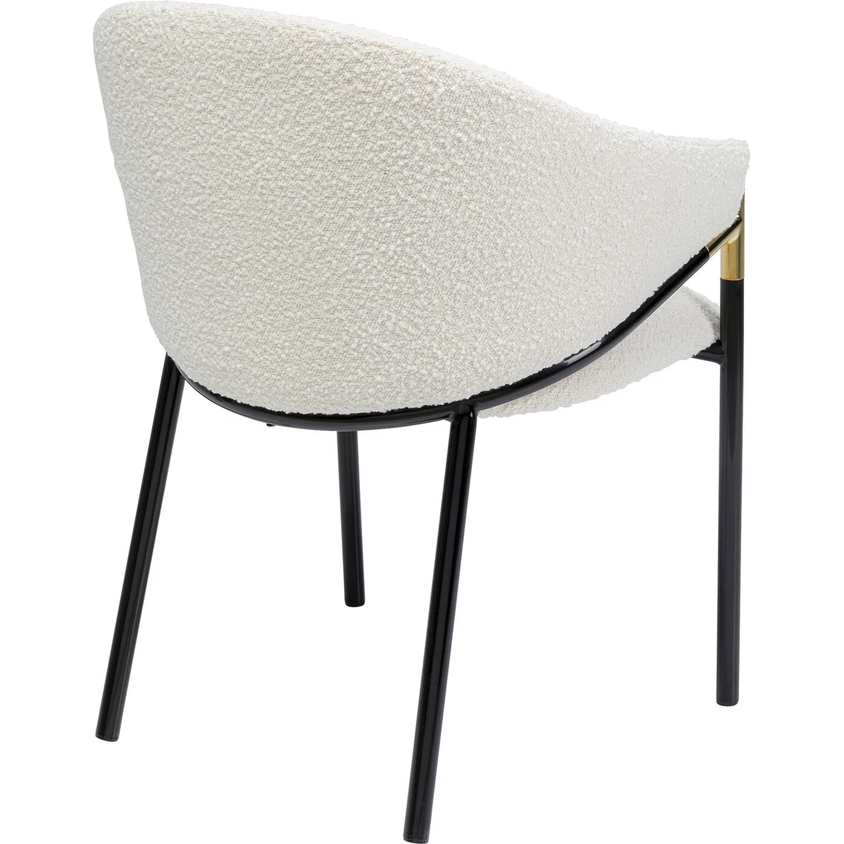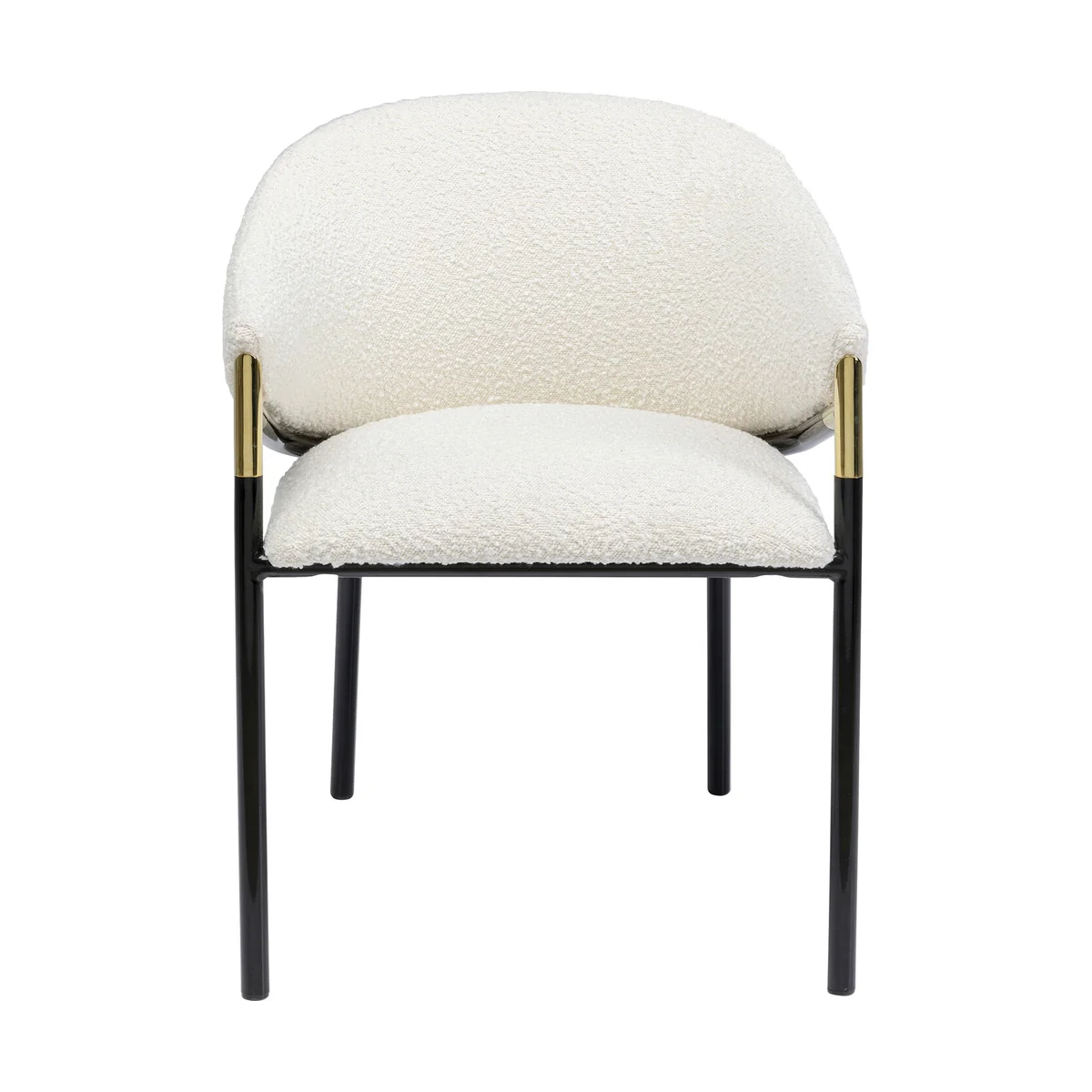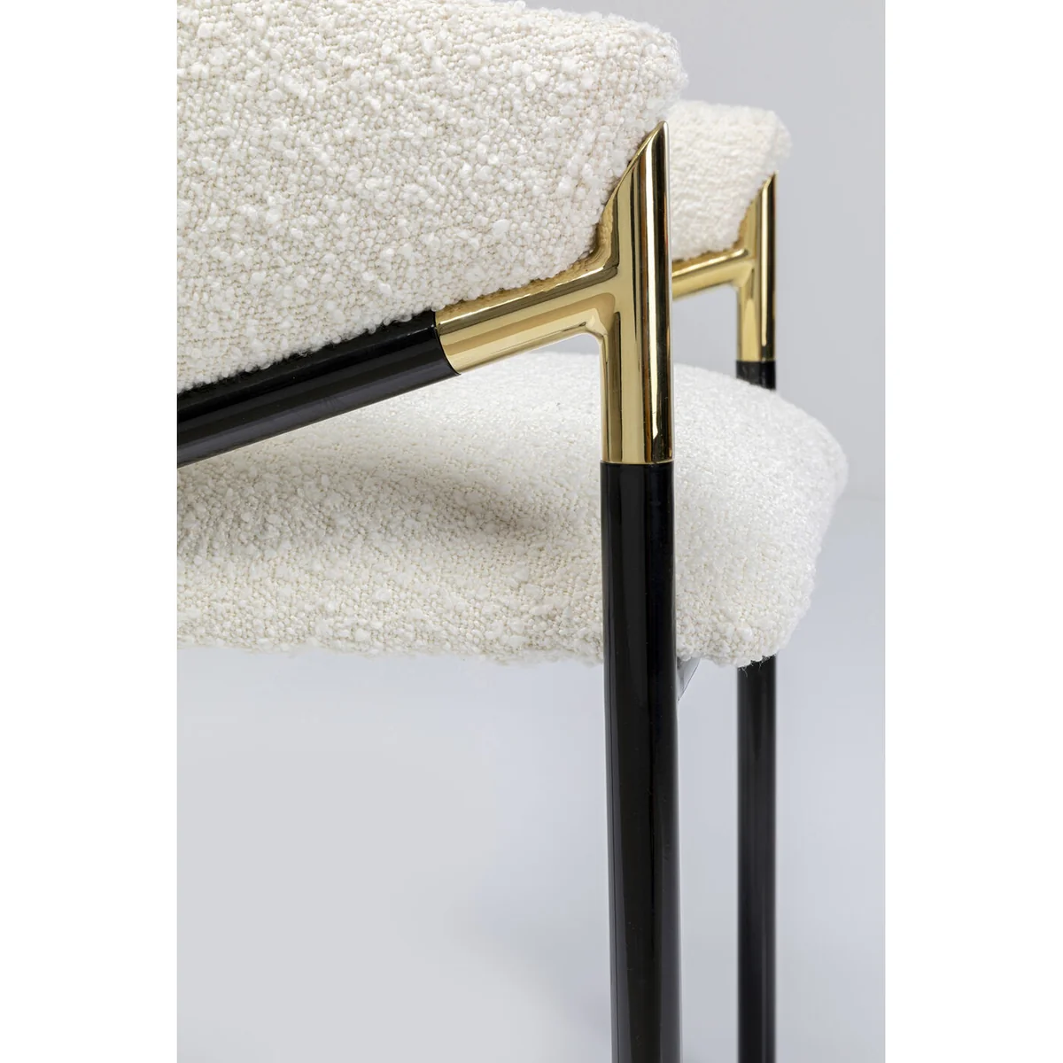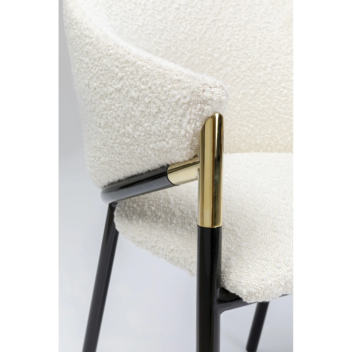 Our Boulevard Dining Chair features a size of 58 cm length, 56.5 cm width, and 78.5 cm height. It has a golden frame made of powder-coated steel, ensuring durability and longevity. The armrests provide added comfort and convenience.