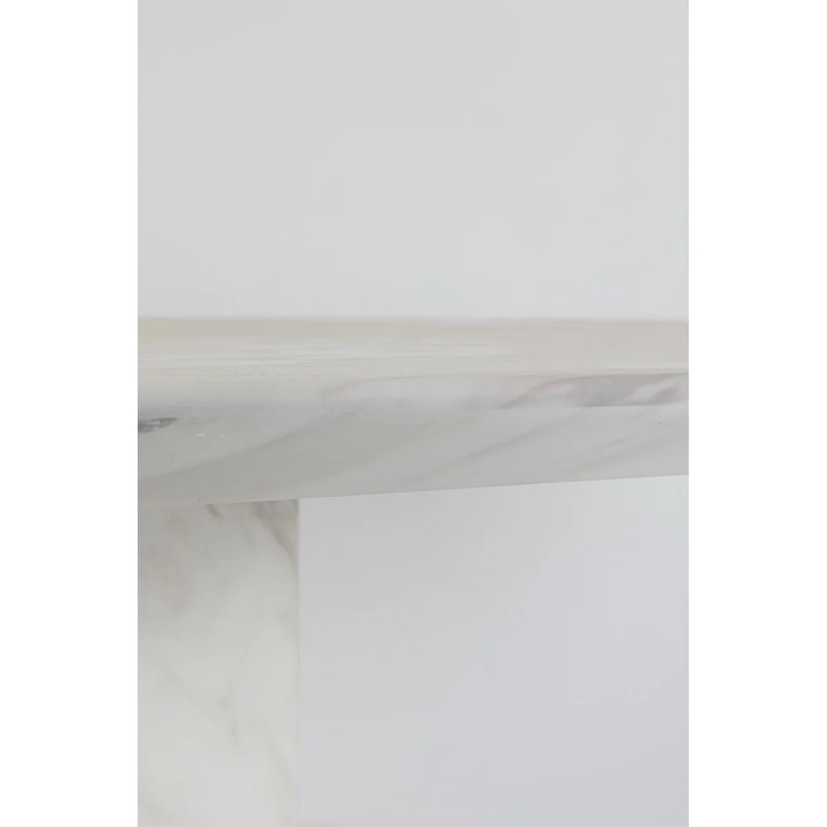 The rectangular table offers a central cuboid base and a spacious marble top with a Swiss edge, measuring 200cm in length—comfortably seating up to 6 people. Its polyresin-coated marble and natural MDF core ensure durability and easy maintenance. Pair with velvet or clean-lined chairs to match your interior style.