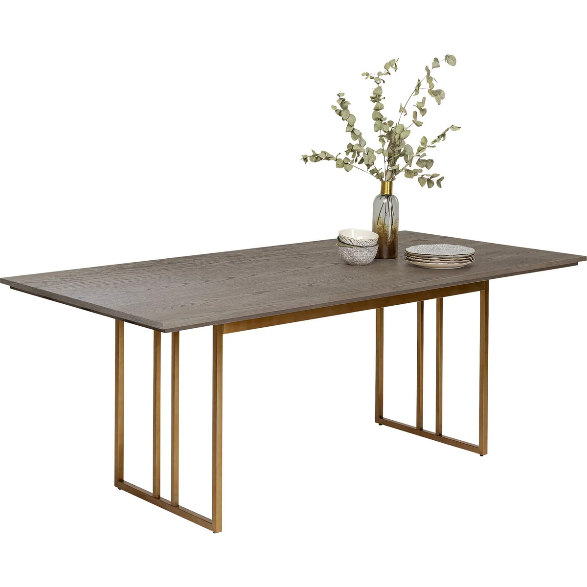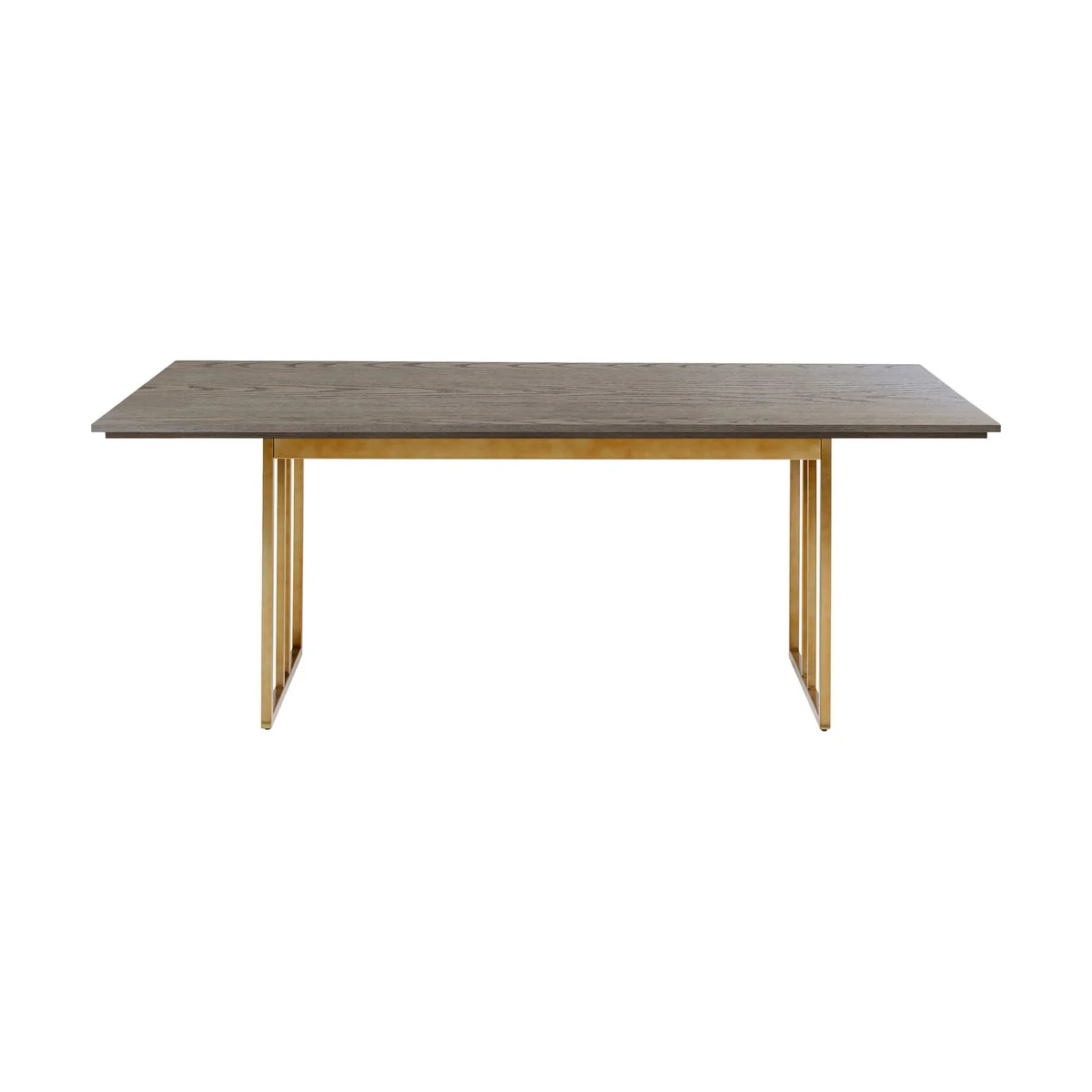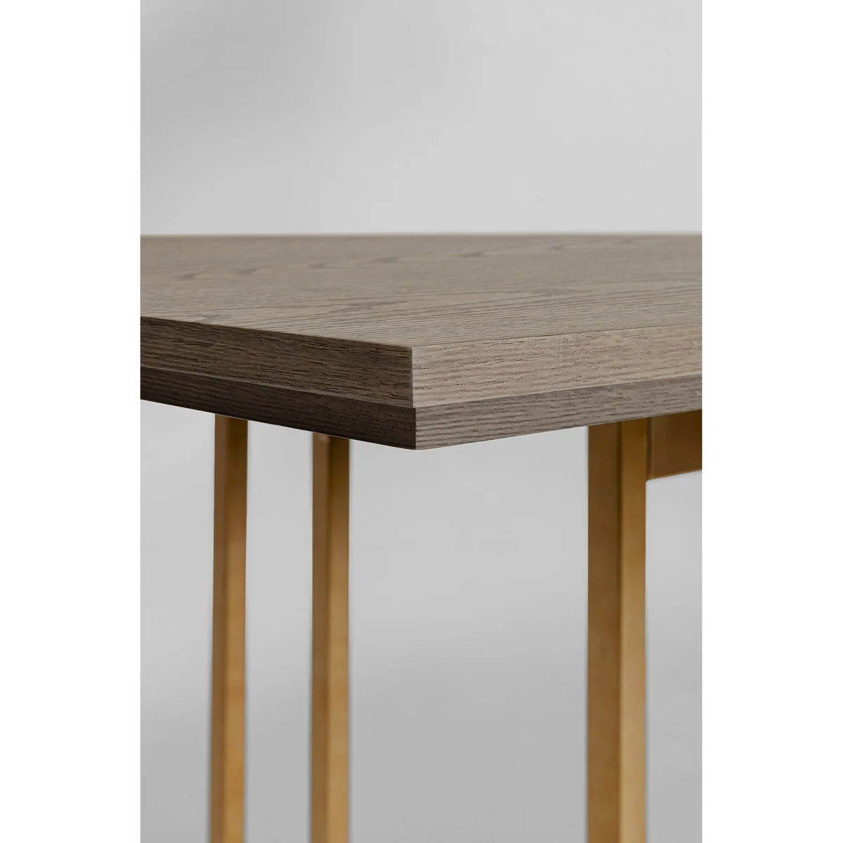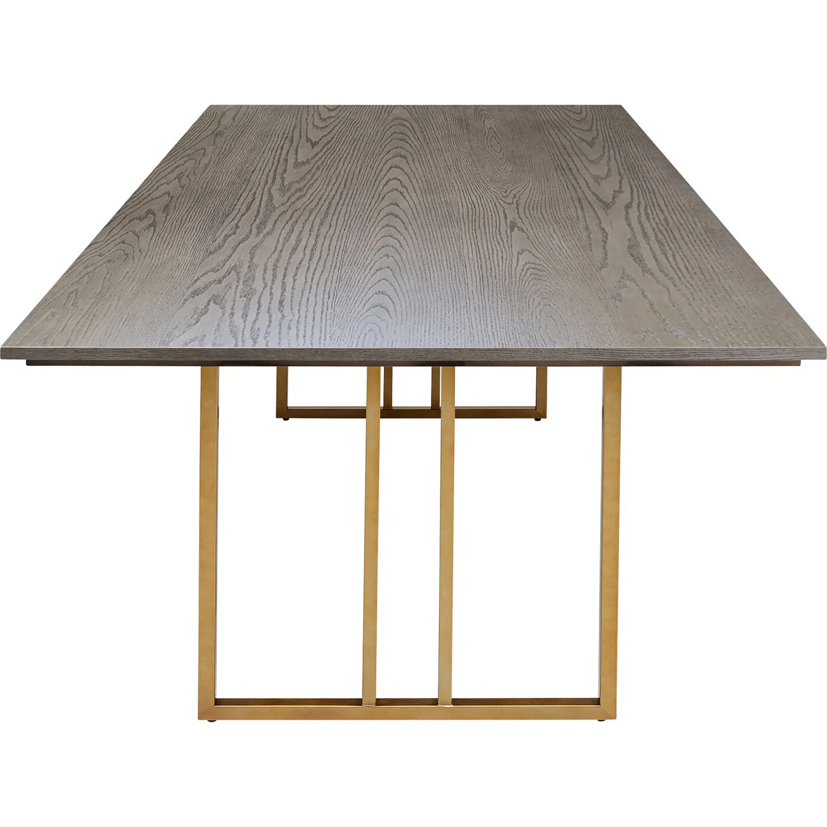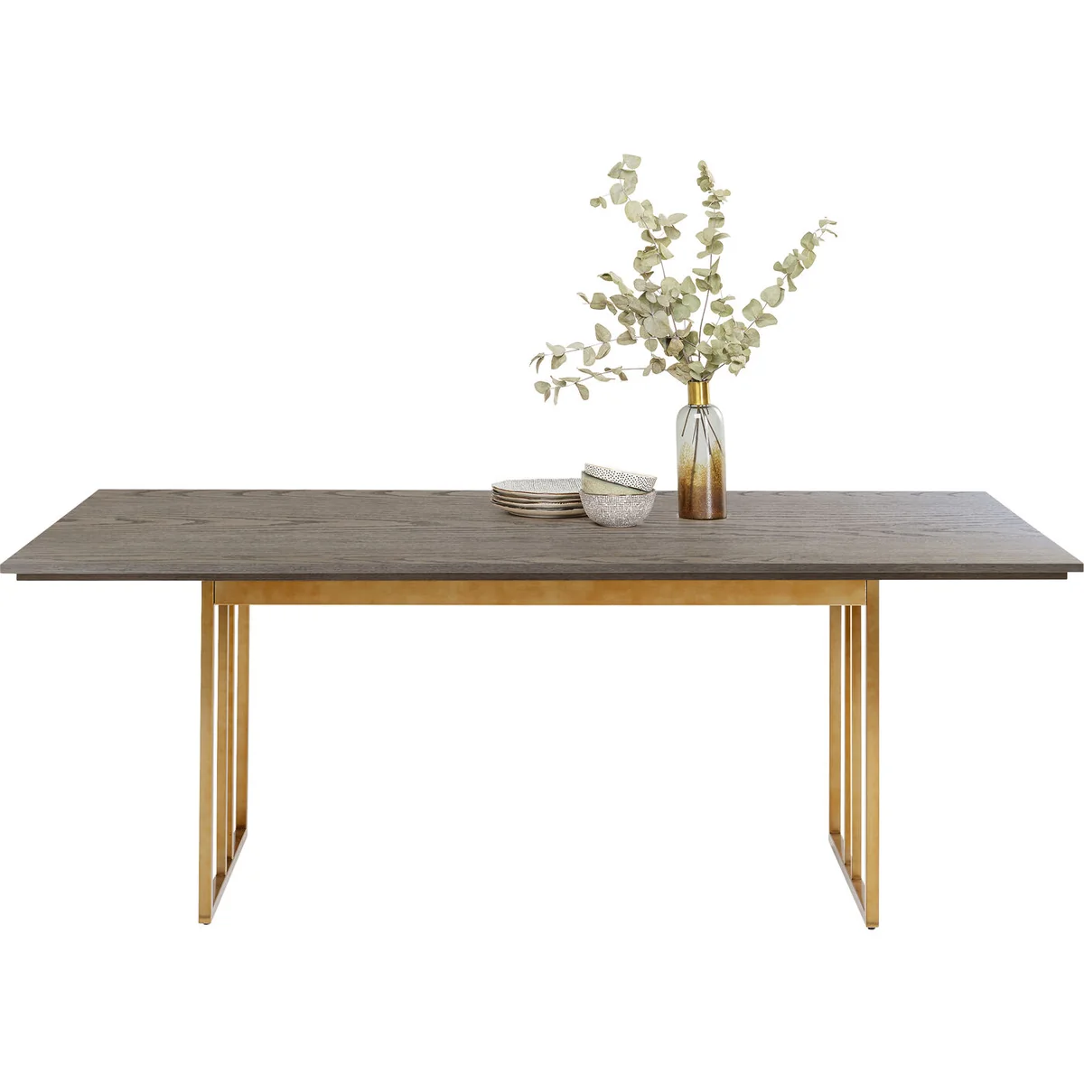 - Visually top class: a large dining table with a light ash veneer - Sensationally stable frame in stainless steel, finished with a brass coating - Exclusive designer furniture, created by Andreas Weber for KARE - Sufficient space for around six to eight people - A rectangular, 100-centimetre-wide top in grey-beige for lavishly set tables