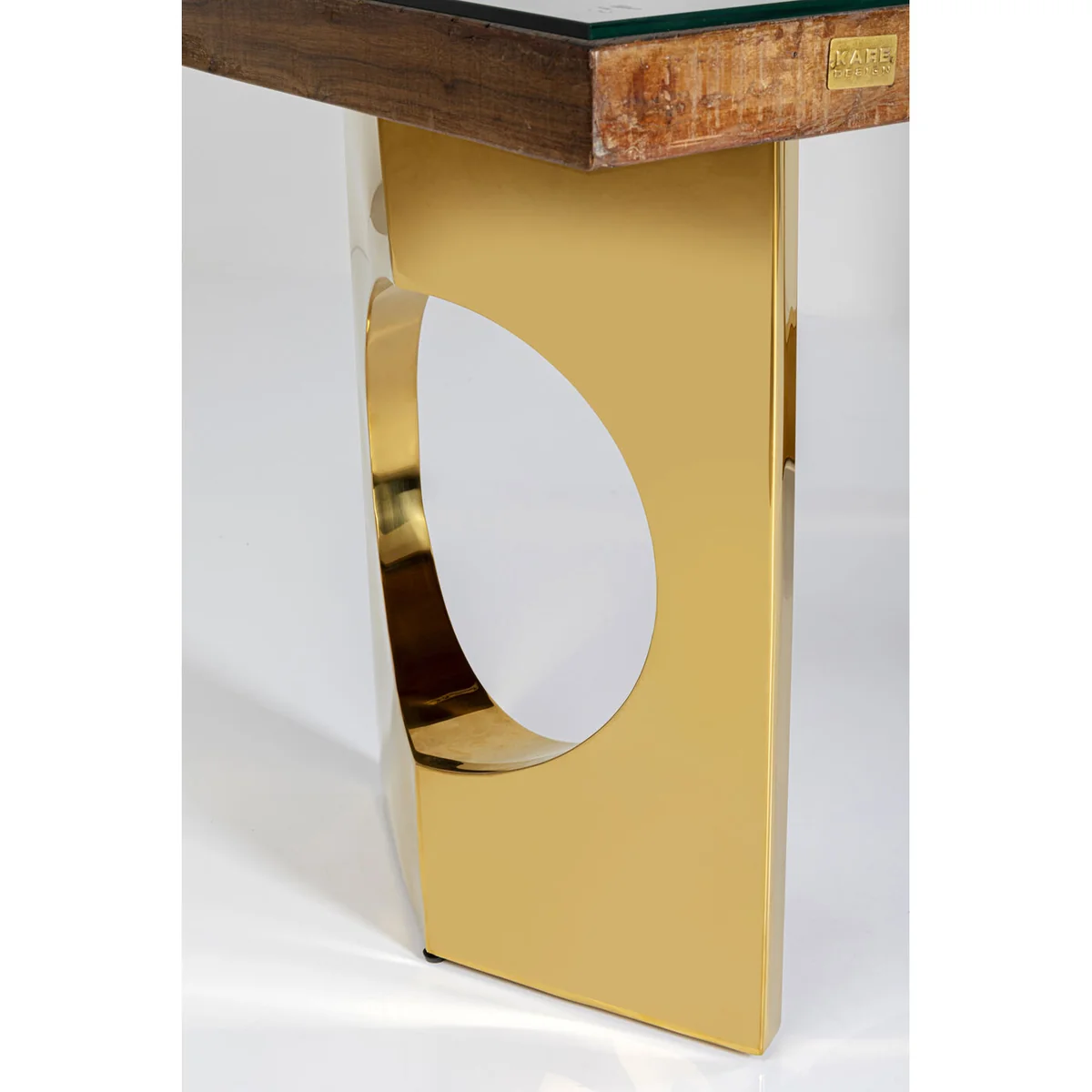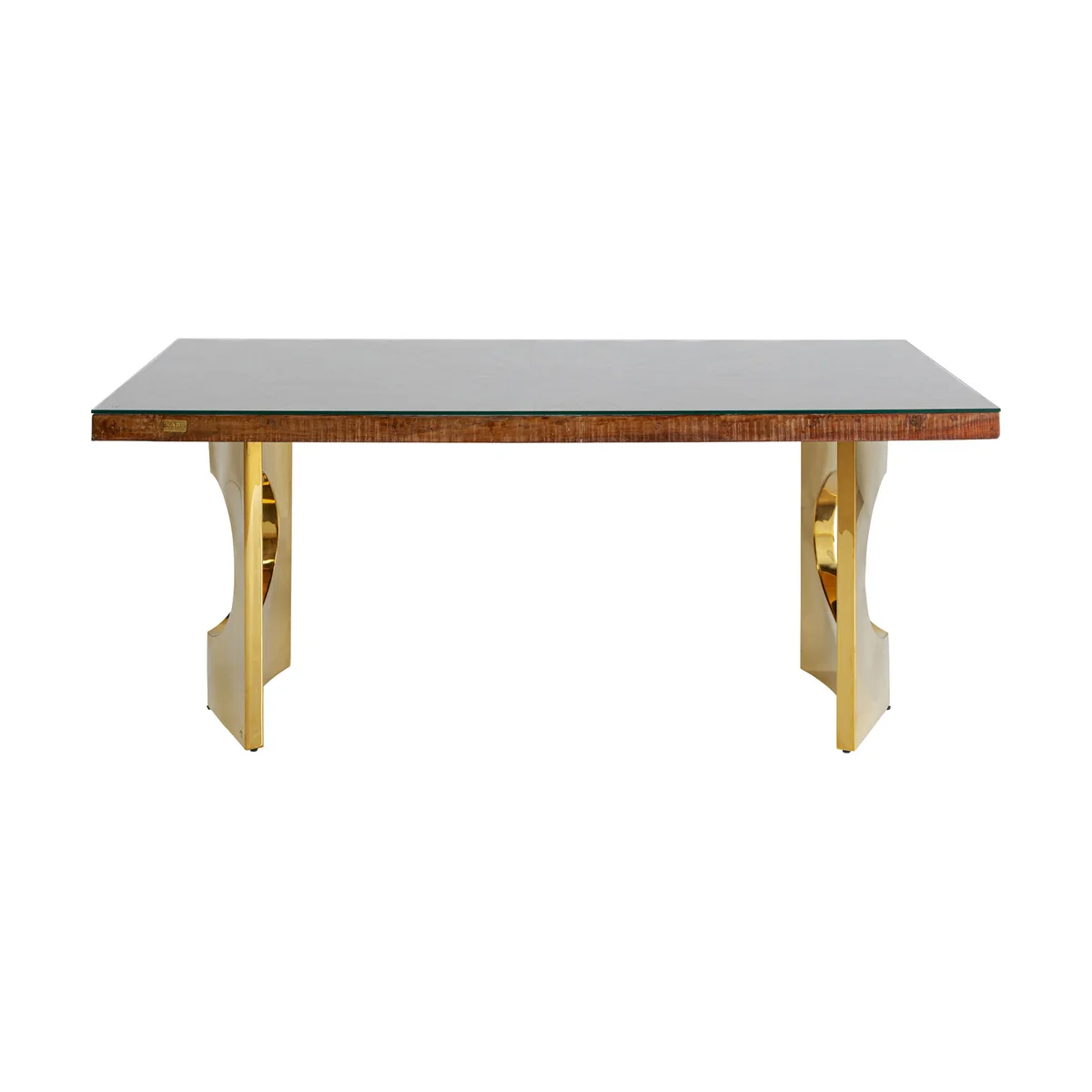 Create a warm and elegant dining space with the Conley dining table in oho gold. Featuring a smooth rectangular top and gold-toned base, this table suits both modern and classic interiors. Comfortably seats six. Pairs well with other pieces from the Conley collection for a coordinated look.