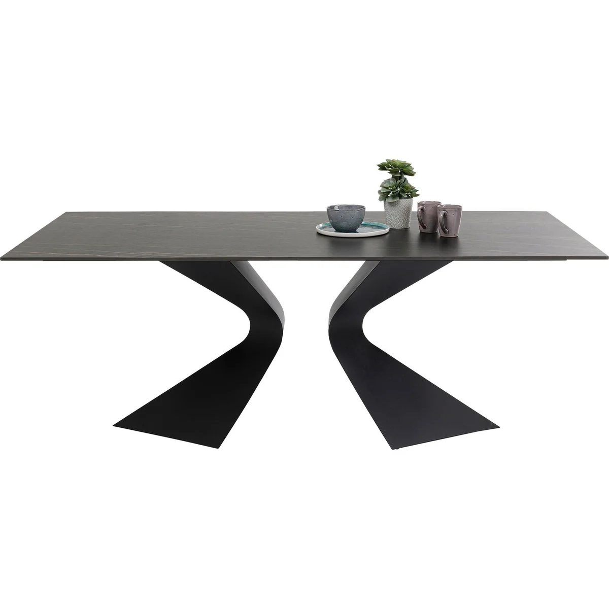 With its solid top made of real ceramics and curved steel legs, this designer piece will be a flamboyant focal point in any room. Friends and family can sit comfortably around this generously sized table, which offers plenty of space for glasses, crockery and the like. Thanks to its attractive, individual look, the table skilfully enhances any living area and quickly becomes a hub and meeting place for everyone - for dining in convivial company as well as for an entertaining evening playing games. You will receive the table in partly assembled form for easy self-assembly.