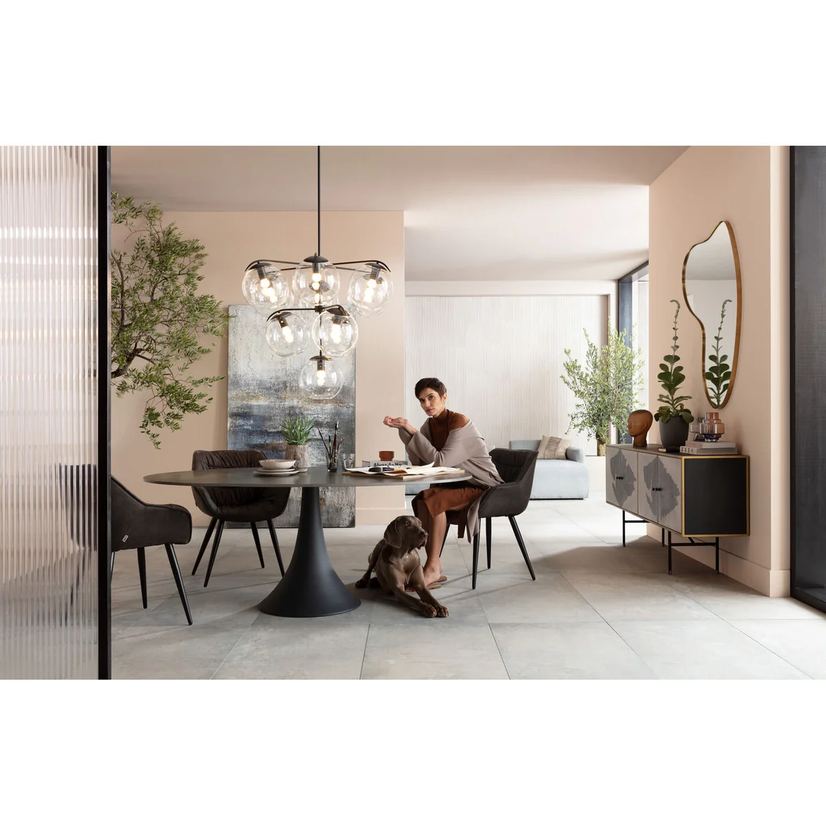 This sculptural, oval table will play the leading role in the living room and dining area. Its classic shape is and remains modern: the oval design encourages communication at the table, and the colour black blends in as an exciting contrast in all styles of furnishing. The ceramic top offers a visual and tactile experience and matches the desire for natural cosiness. Space for around six people.