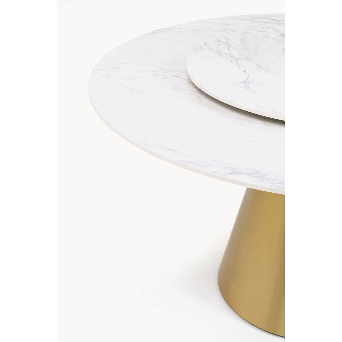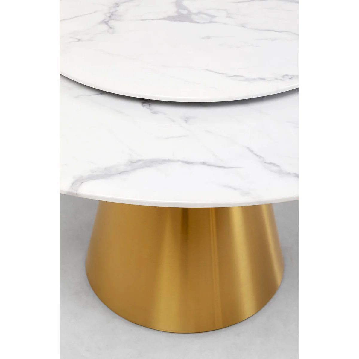 Elevate your dining experience with the Lucia Dining Table in gold marble, a stunning centerpiece for contemporary spaces. This round dining table features a luxurious marble tabletop and an elegant golden base, perfect for modern dining rooms or stylish kitchens.