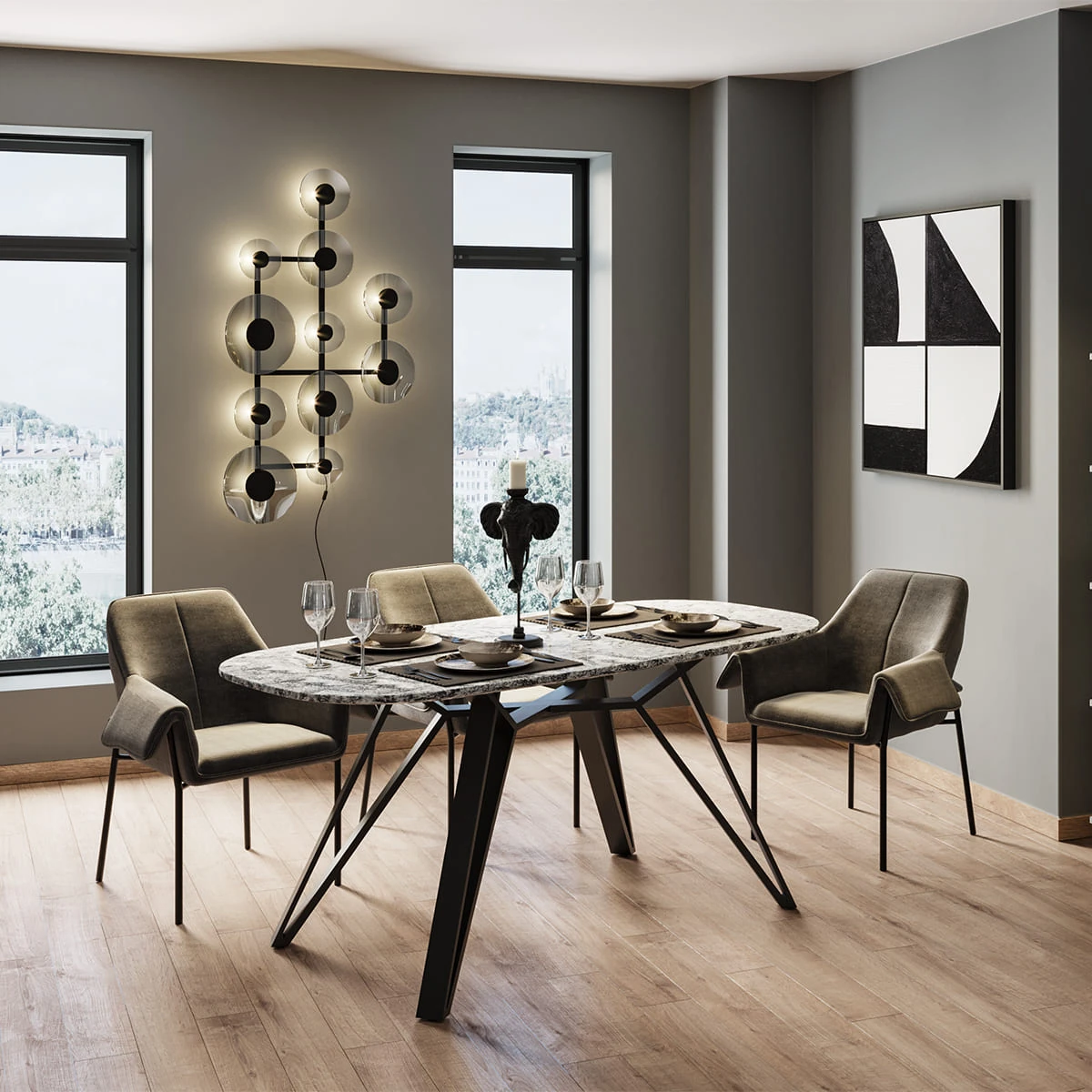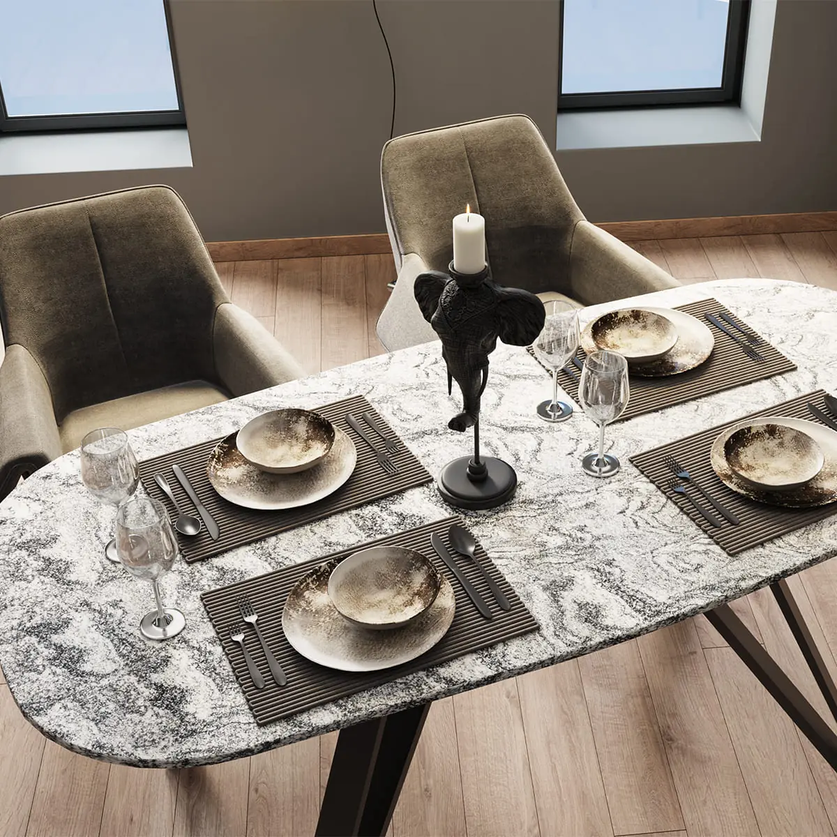The Okinawa Dining Table in grey granite with a steel base elevates your modern dining room with its refined design and robust construction. This contemporary dining table comfortably seats 6 to 8 people, making it ideal for family gatherings and entertaining friends. The combination of premium materials and a sleek silhouette ensures this table becomes the centerpiece of any contemporary dining space.