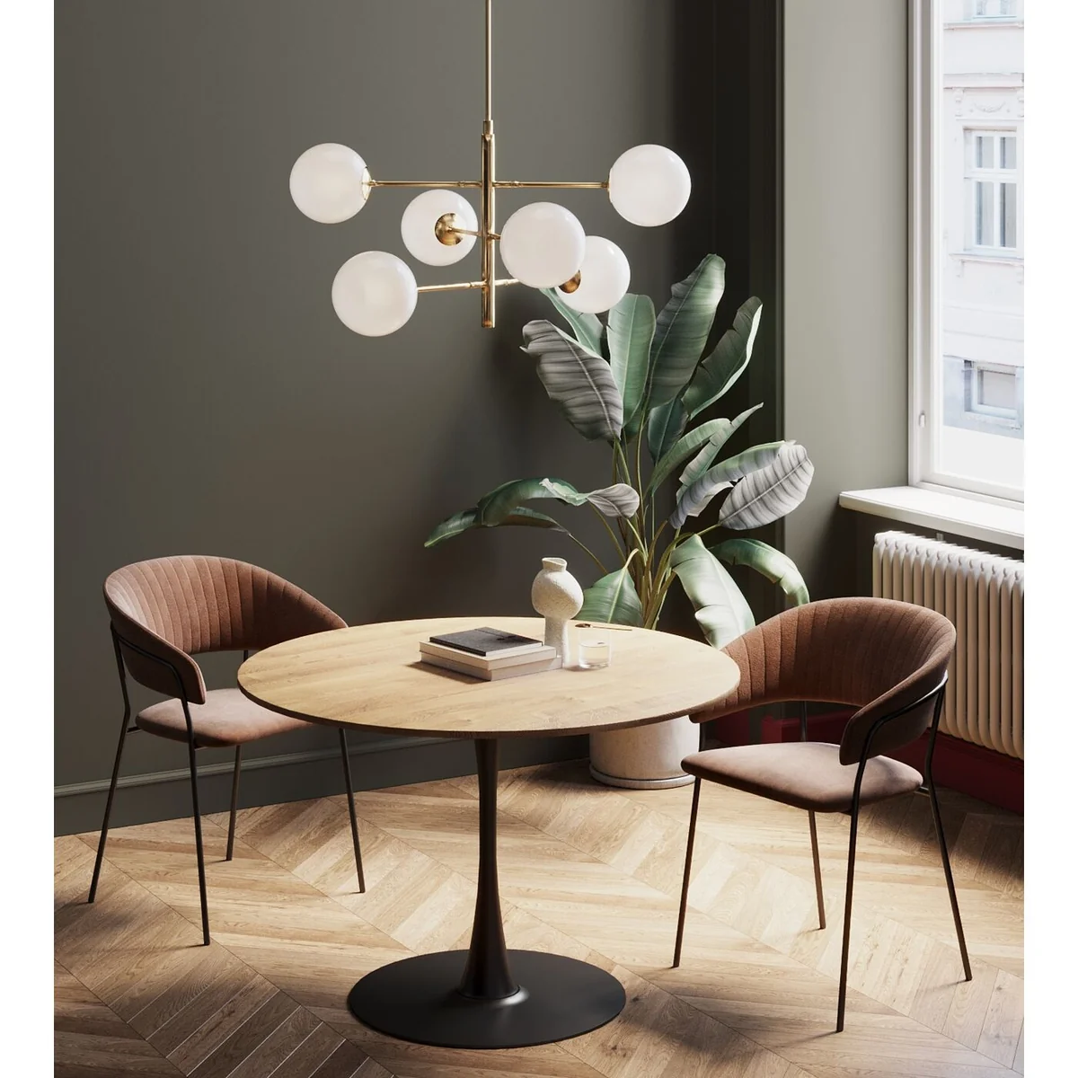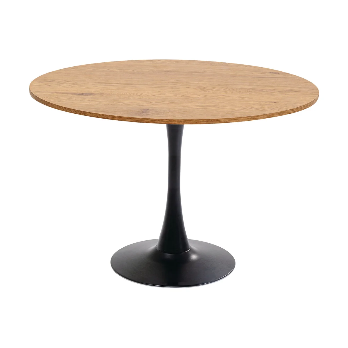 • Round dining table in oak look, 74 x 110 x 110 centimeters (H/W/D) • Black center foot in tulip shape made of black lacquered steel • Dimensionally stable table top made of MDF covered with oak decor • Dining room table or meeting table with space for 4 people depending on the seating arrangement