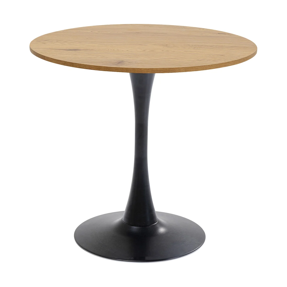 • Round dining table in brown and black, 74 x 80 x 80 cm (H/W/D) • The 1.8 cm thick table top comes in an oak wood look and is easy to clean thanks to the foil coating • The central base in a tulip shape is made of black lacquered steel • Whether as a dining table, desk or side table, thanks to its compact size this table fits in anywhere • Depending on the seating, this round dining room table can accommodate 4 people