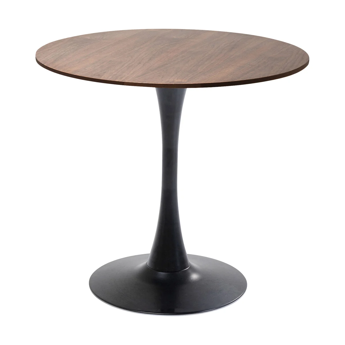 A modern, round dining table in the best retro design in expressive black with an elegant walnut finish for the table top. This is foil-coated and therefore insensitive to moisture and can be wiped clean with a mild detergent. The small round dining table is an absolute hit when it comes to style. Simple dining chairs with high backrests suit Schickeria just as well as retro swivel chairs or shell chairs. The tulip base guarantees plenty of legroom.
