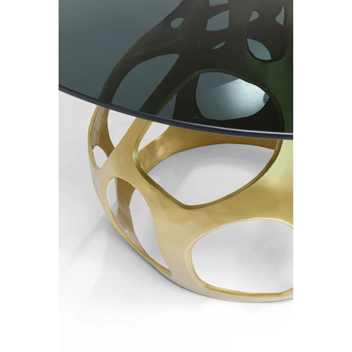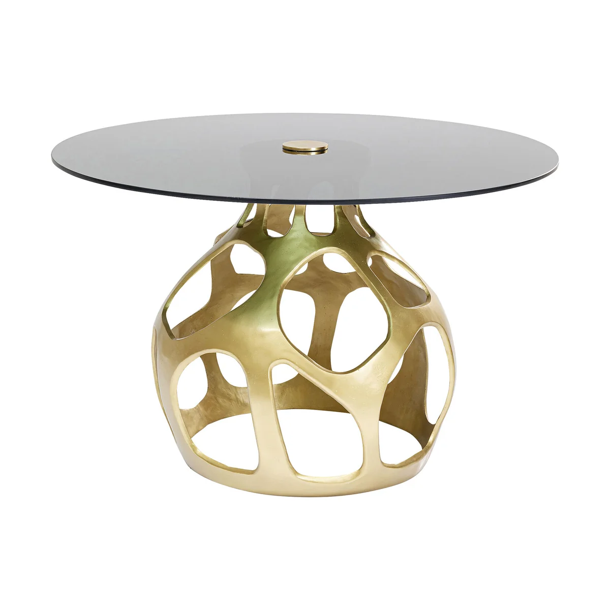 • A round glass table like a piece of modern art that will turn your dining room into a design hotspot • The combination of the gold-coloured base and smoky tinted glass stands for luxurious understatement • A one-of-a-kind piece that is partly made by hand • Slight deviations from the illustration are possible • You can also use this gem as a living room table or for the office • This round table with its diameter of 120 centimetres can seat 6 to 7 people, depending on the chairs which are used