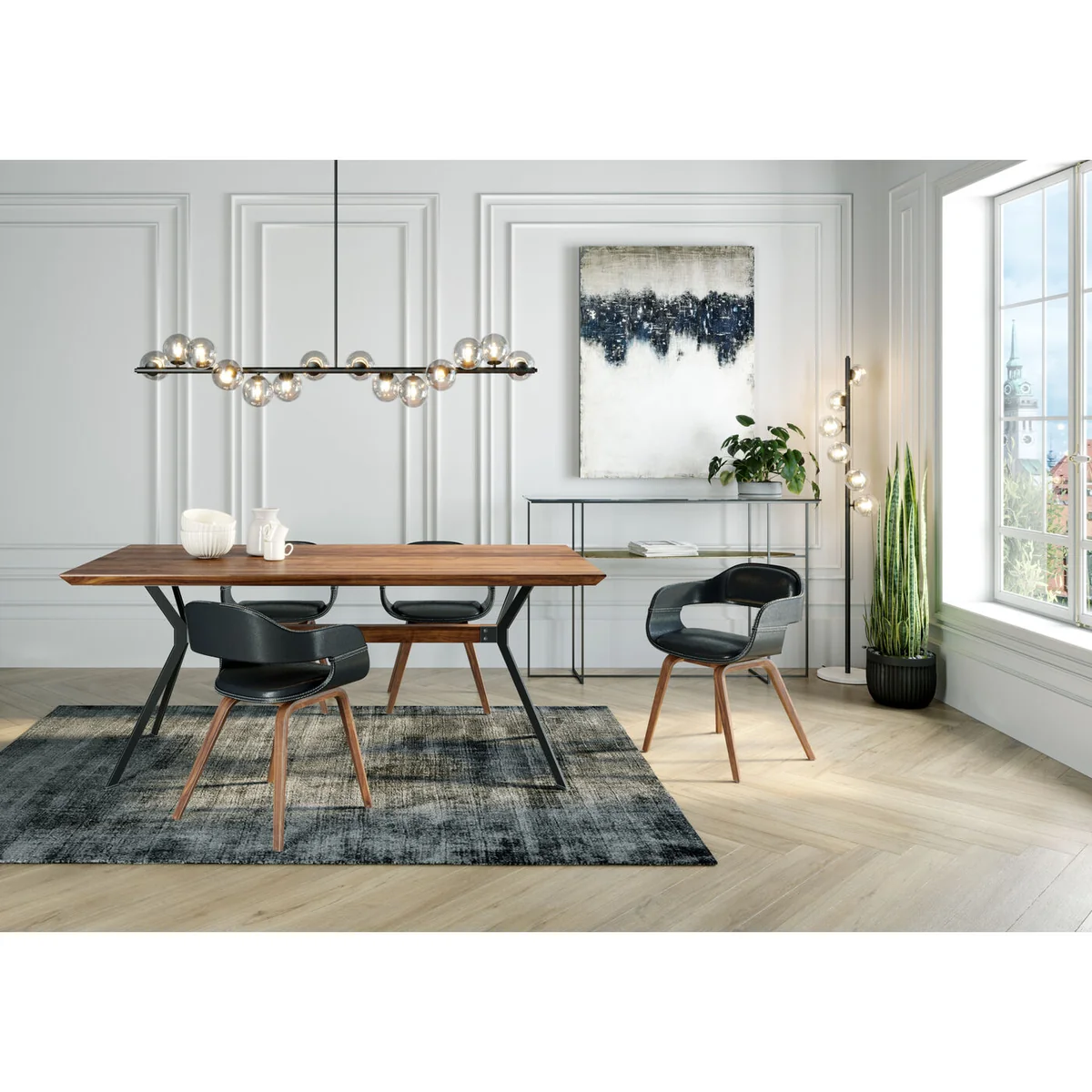 The Downtown Dining Table’s solid walnut top is lacquered to highlight its beautiful grain, ensuring durability and easy maintenance. Its rectangular shape comfortably seats 4–6 guests, while the dynamically shaped black steel legs and wooden central strut create a harmonious and eye-catching foundation. The bevelled edge adds a refined touch to your dining space.