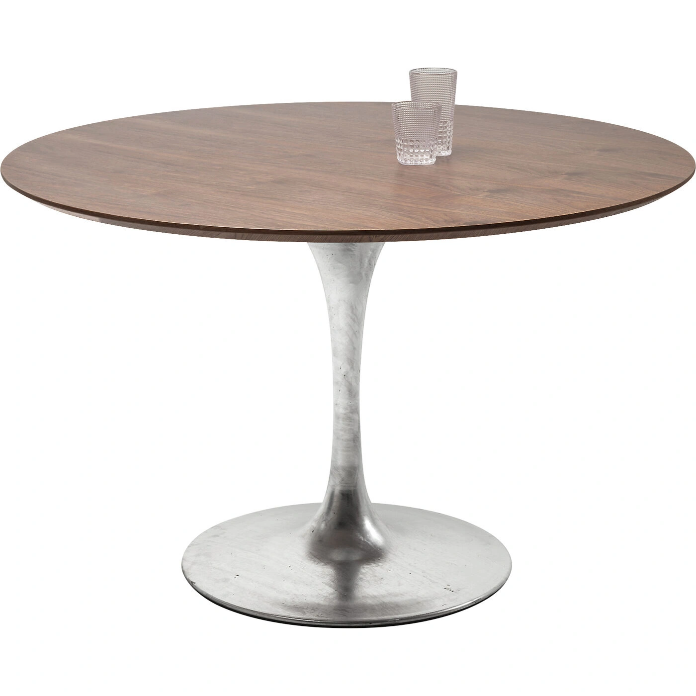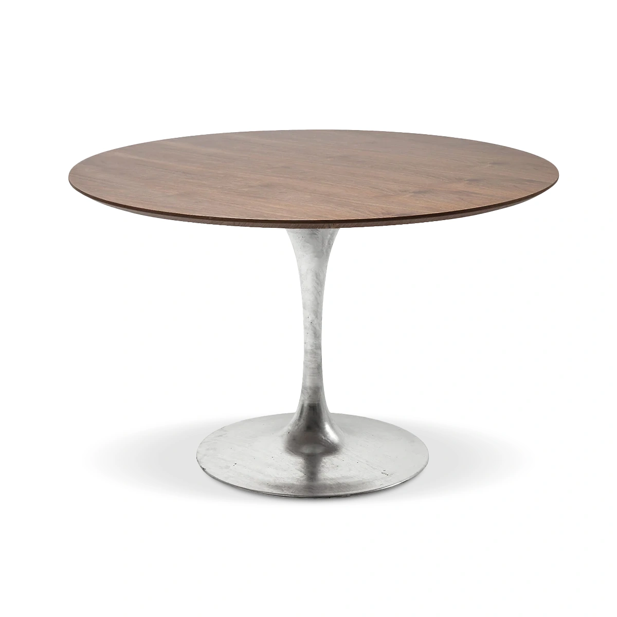 The real wood walnut veneer top offers warmth and sophistication, while the galvanized steel tulip base provides lasting stability. Its 120cm diameter comfortably seats four, making it ideal for family gatherings or collaborative meetings. The classic round design from the Invitation table series saves space, adds harmony, and enhances small dining areas with a light, inviting look.