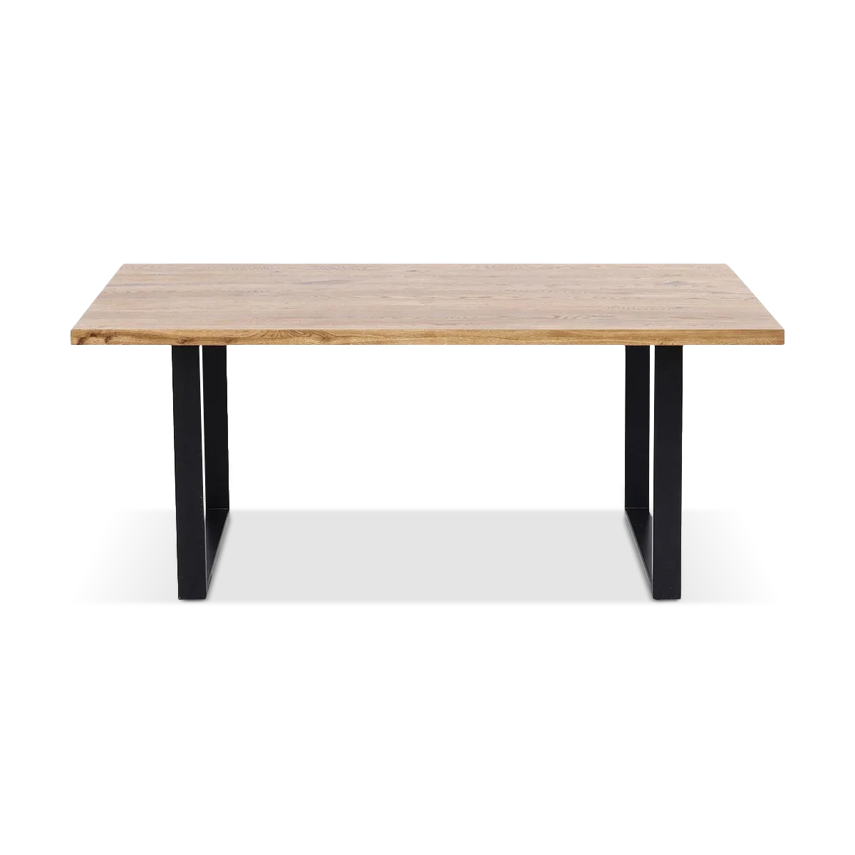The center of every home and a loyal, robust companion in all situations: the dining table, where you not only eat together, but also celebrate, work and laugh. The mix of the decorative, durable table top made of rustic oak wood and the table frame made of steel makes it a timeless modern designer furniture. Material: (table top: oiled solid oak, legs: lacquered steel)