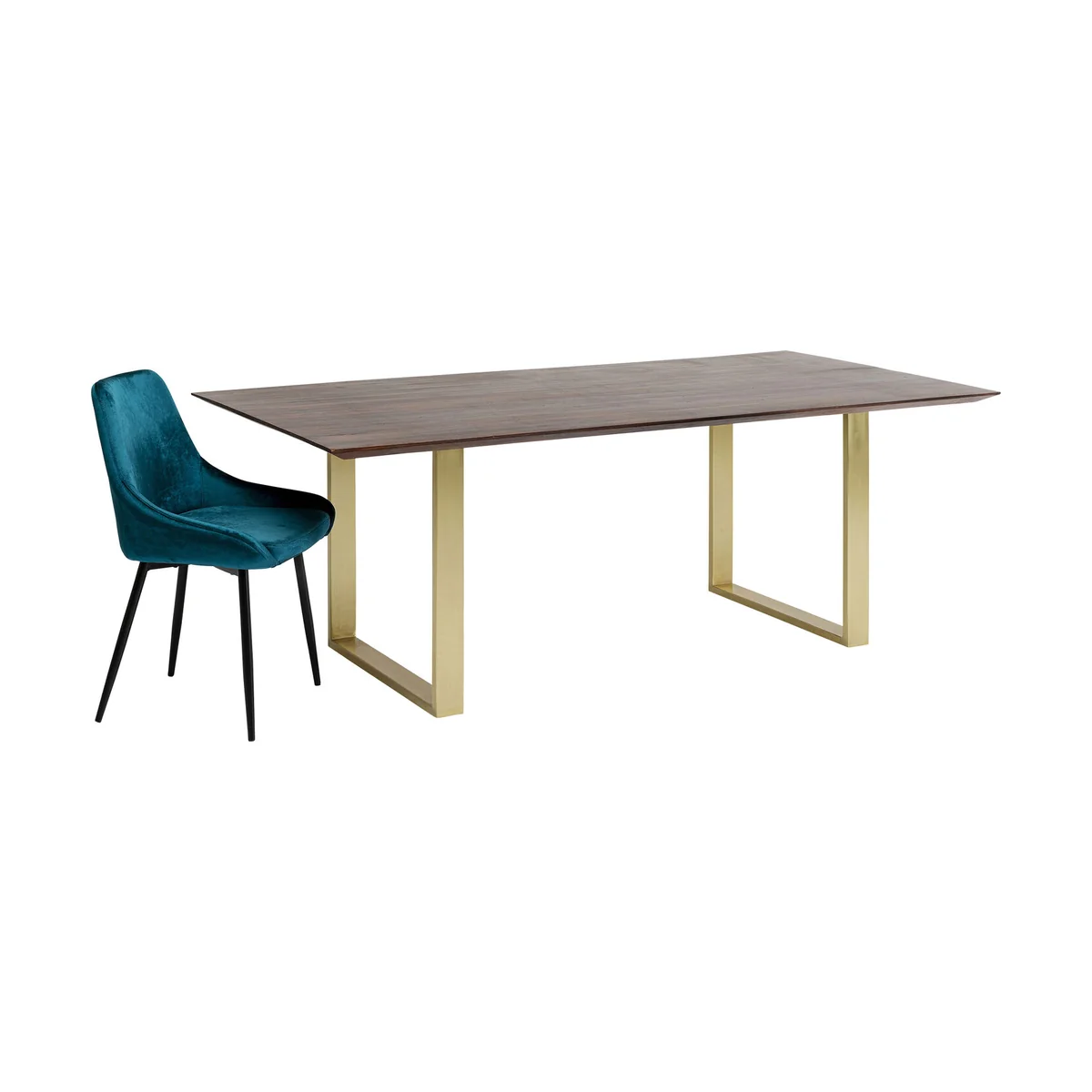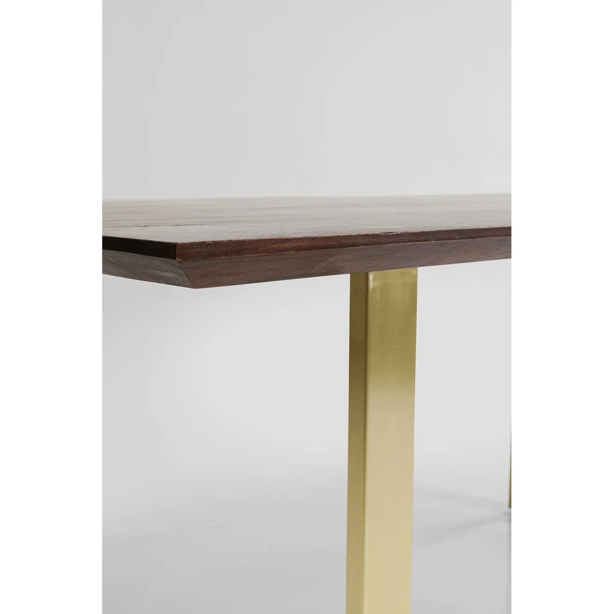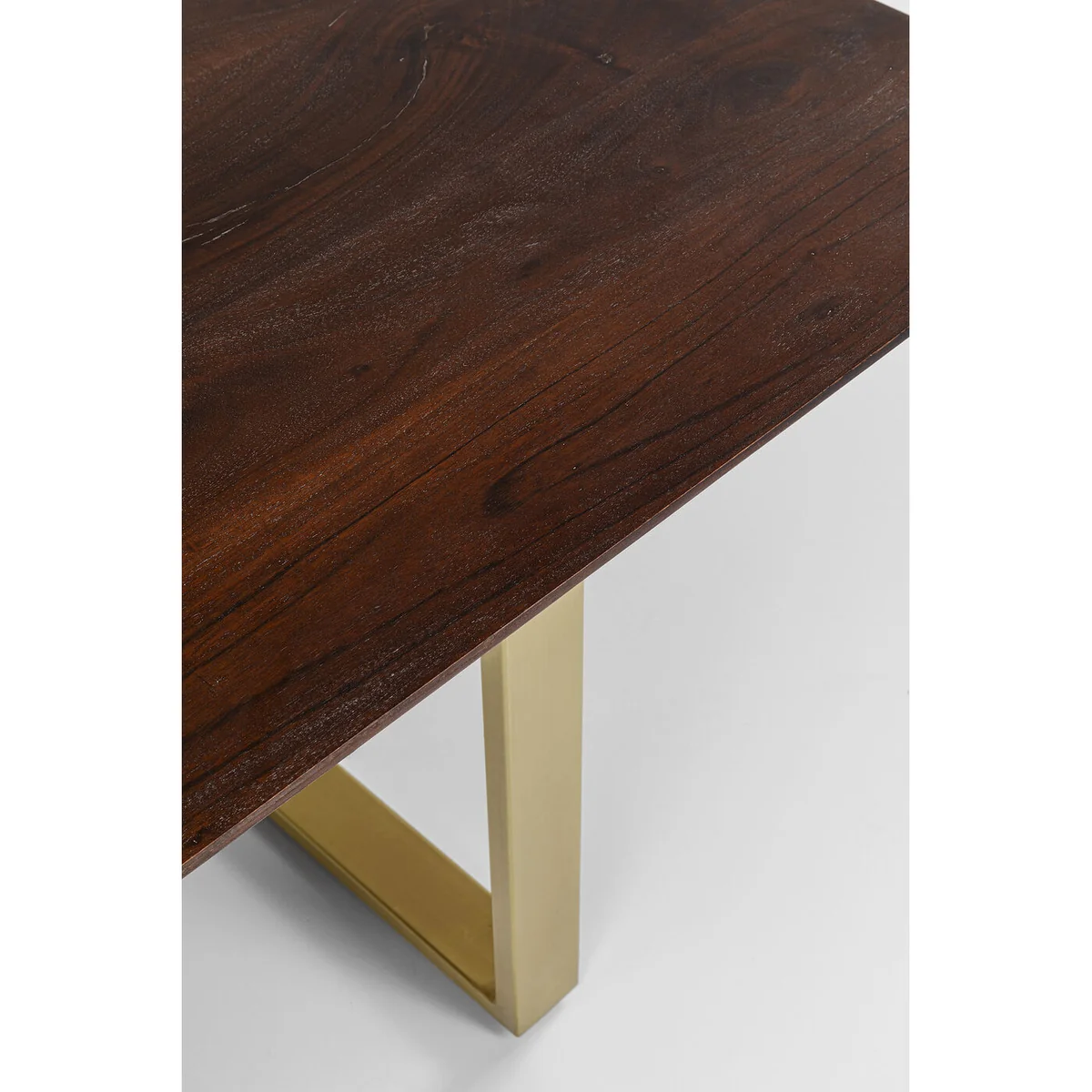 This spacious dining table combines natural flair with modern design. The solid wooden top with its striking grain brings warmth into the room, while the irregular edges emphasize the organic character of the natural material. The golden sled base adds a sophisticated accent and lends the table a stylish lightness. Whether in minimalist, elegant or industrial-inspired interiors - this table becomes a sociable focal point and offers space for cozy get-togethers with family and friends.