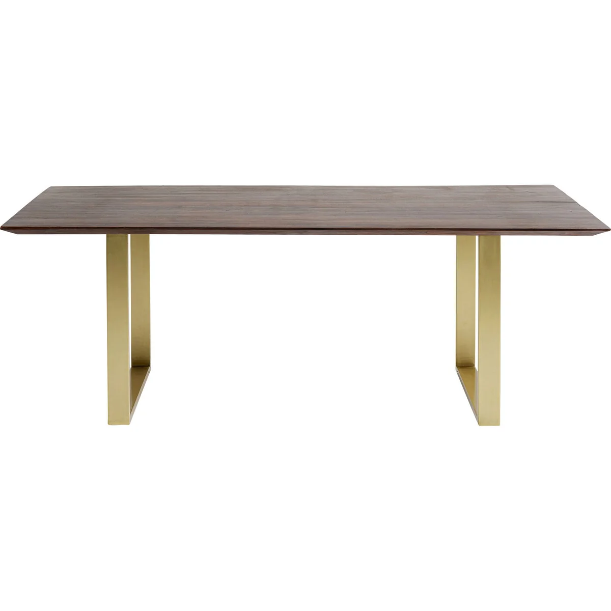 • Rectangular dining table made of dark solid wood with golden sled base, 76 x 200 x 100 centimetres (H/W/D) • The table top made of robust acacia wood impresses with its natural wood grain and is particularly easy to clean thanks to its lacquer finish • The natural growth of the tree is reflected in the irregularly shaped long sides of the table, making each table unique • Table legs made of sturdy steel in shiny gold and the simple design create an exciting, modern contrast • The dining room table offers space for 4 to 6 people, depending on the seating arrangement