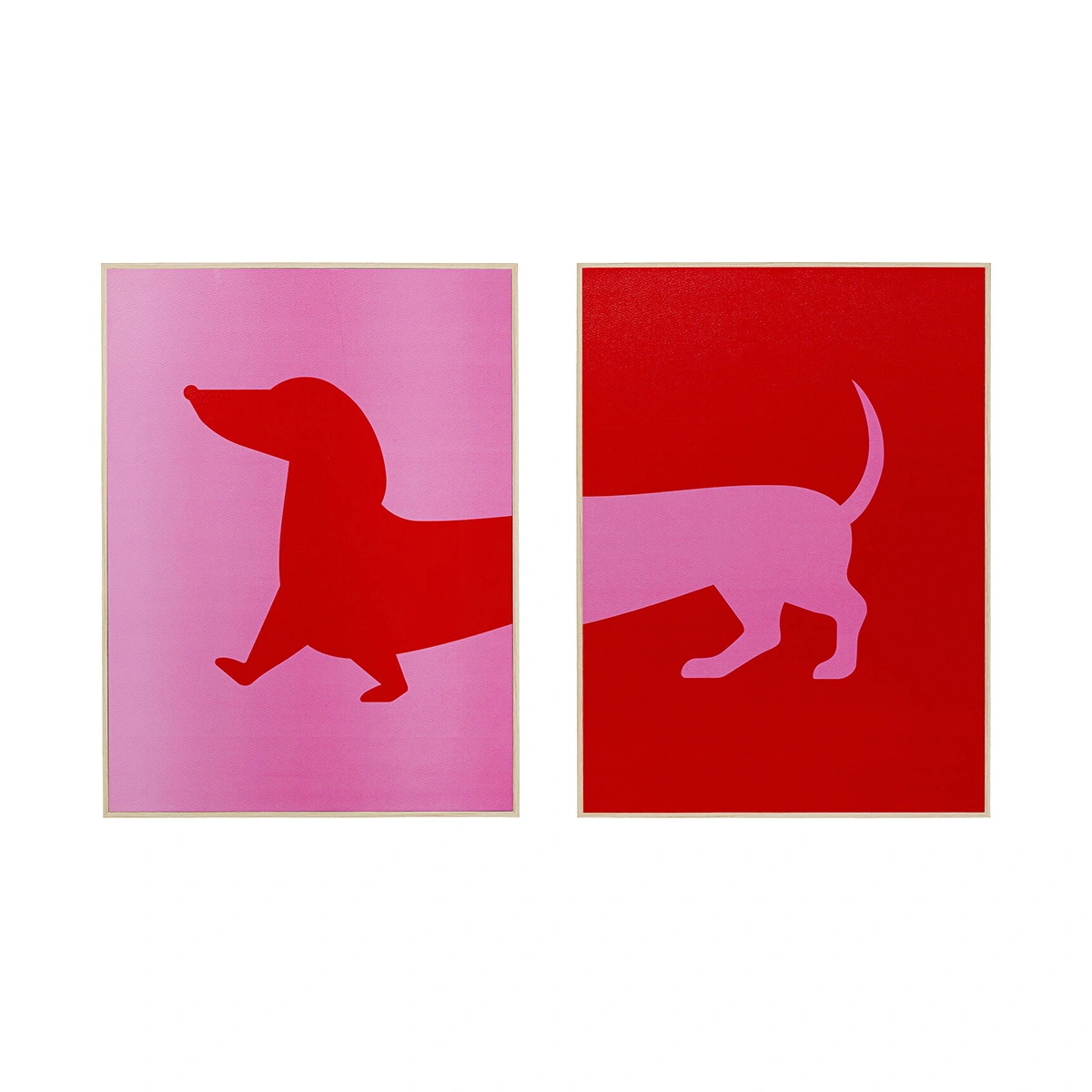 Key features of the set include two vivid prints of our lovable dachshund, Frankie. Each print is mounted on a sturdy MDF board, promising durability and longevity. The frame is made of natural, untreated MDF that's been paper wrapped, adding a refined touch to the playful prints.