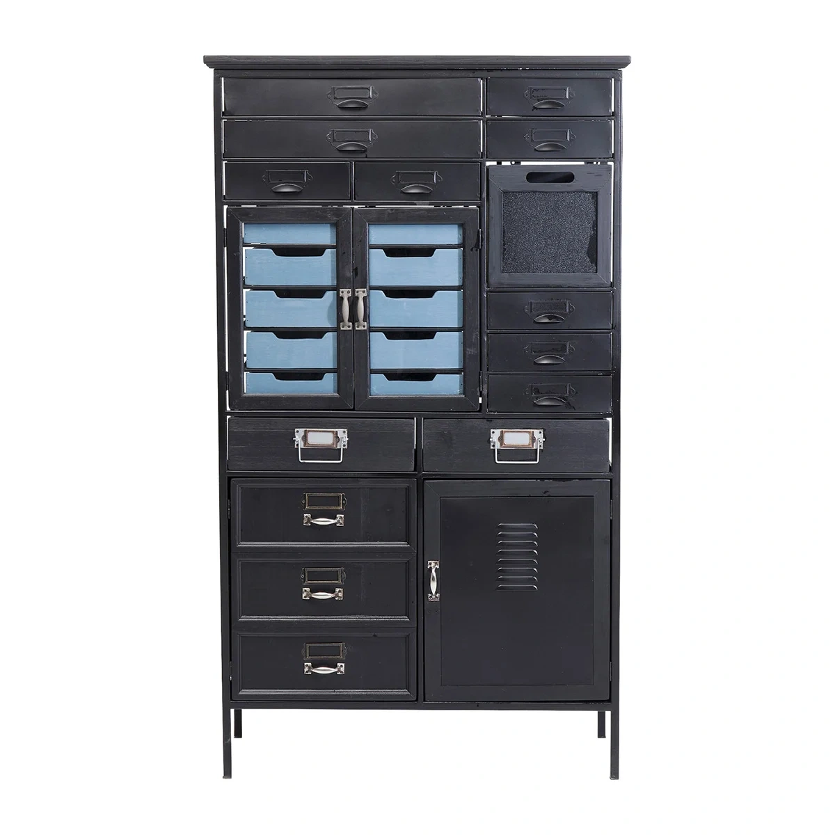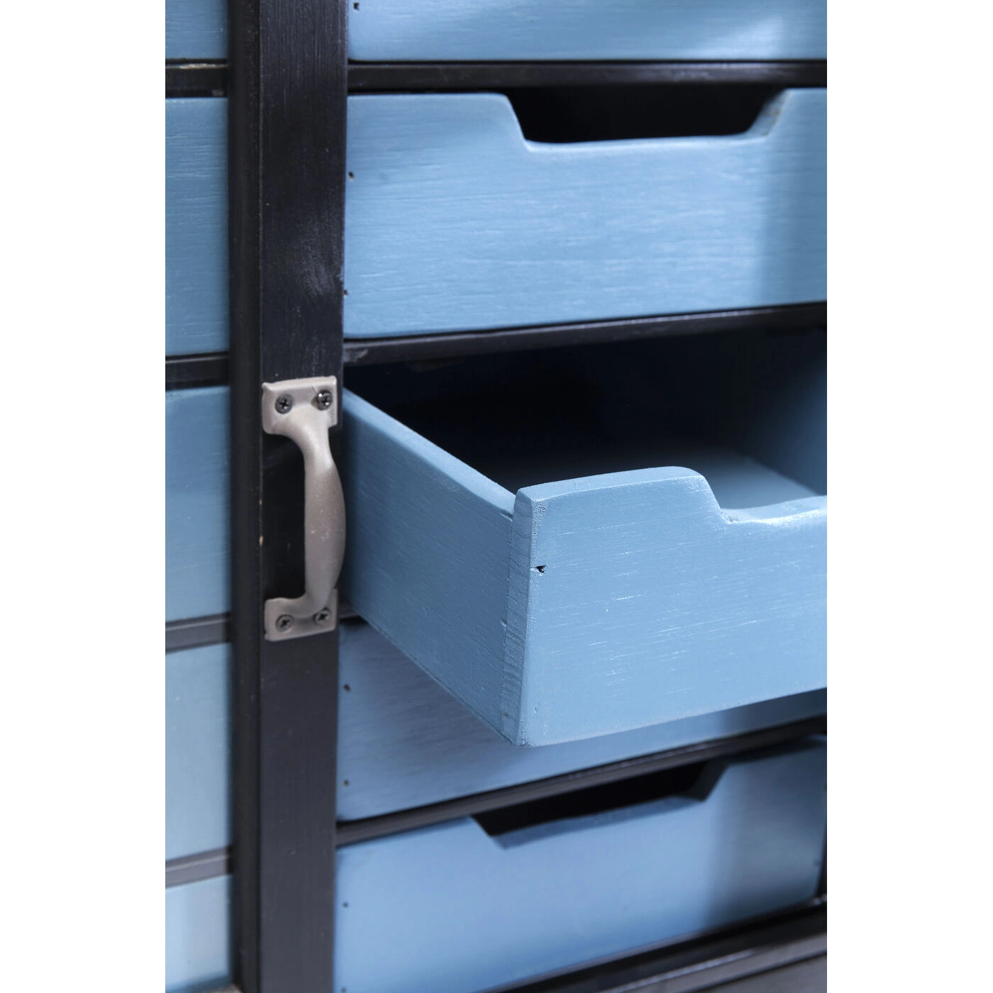 The dresser measures L 76.5 cm | D 32 cm | H 132.5 cm, offering ample space for your wardrobe. The back panel is made of lacquered plywood, ensuring durability and robustness. The dresser's striking blue color adds a pop of color to any room, making it not just a practical addition, but a stylish one too.