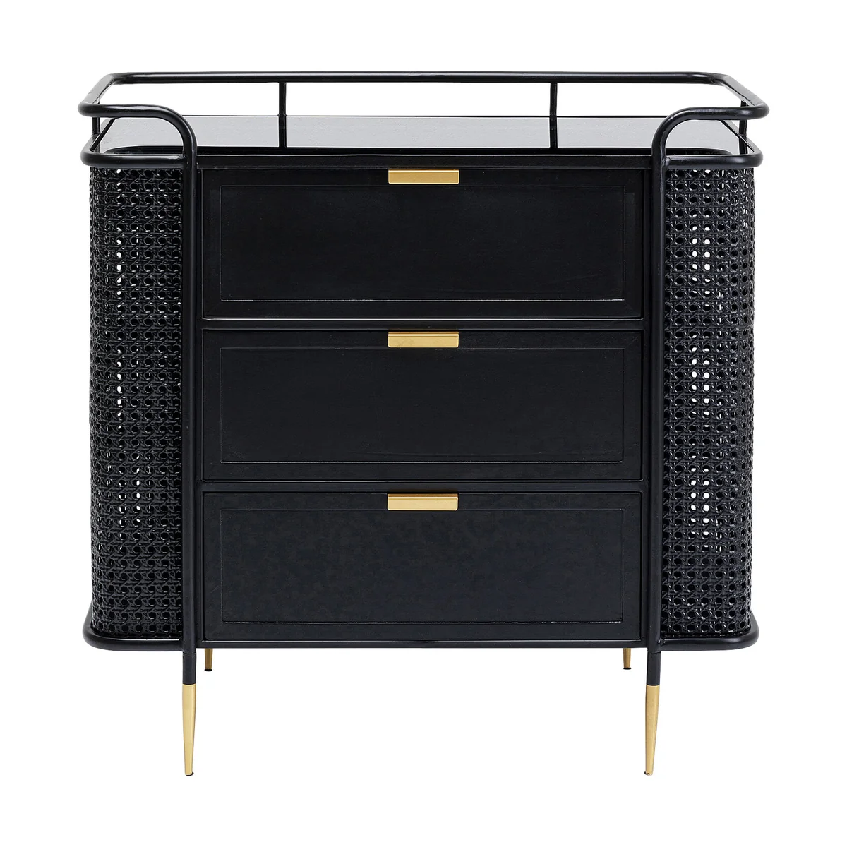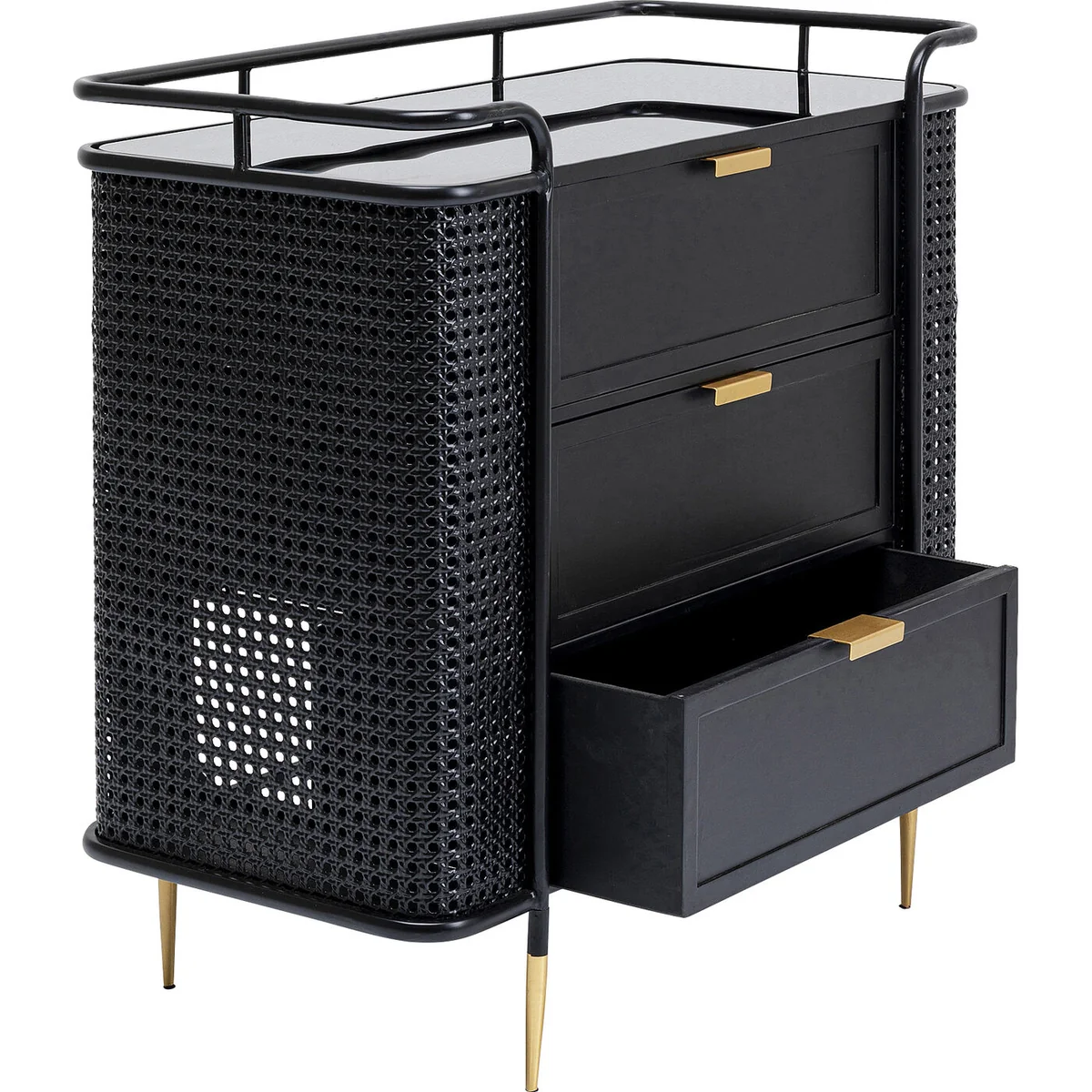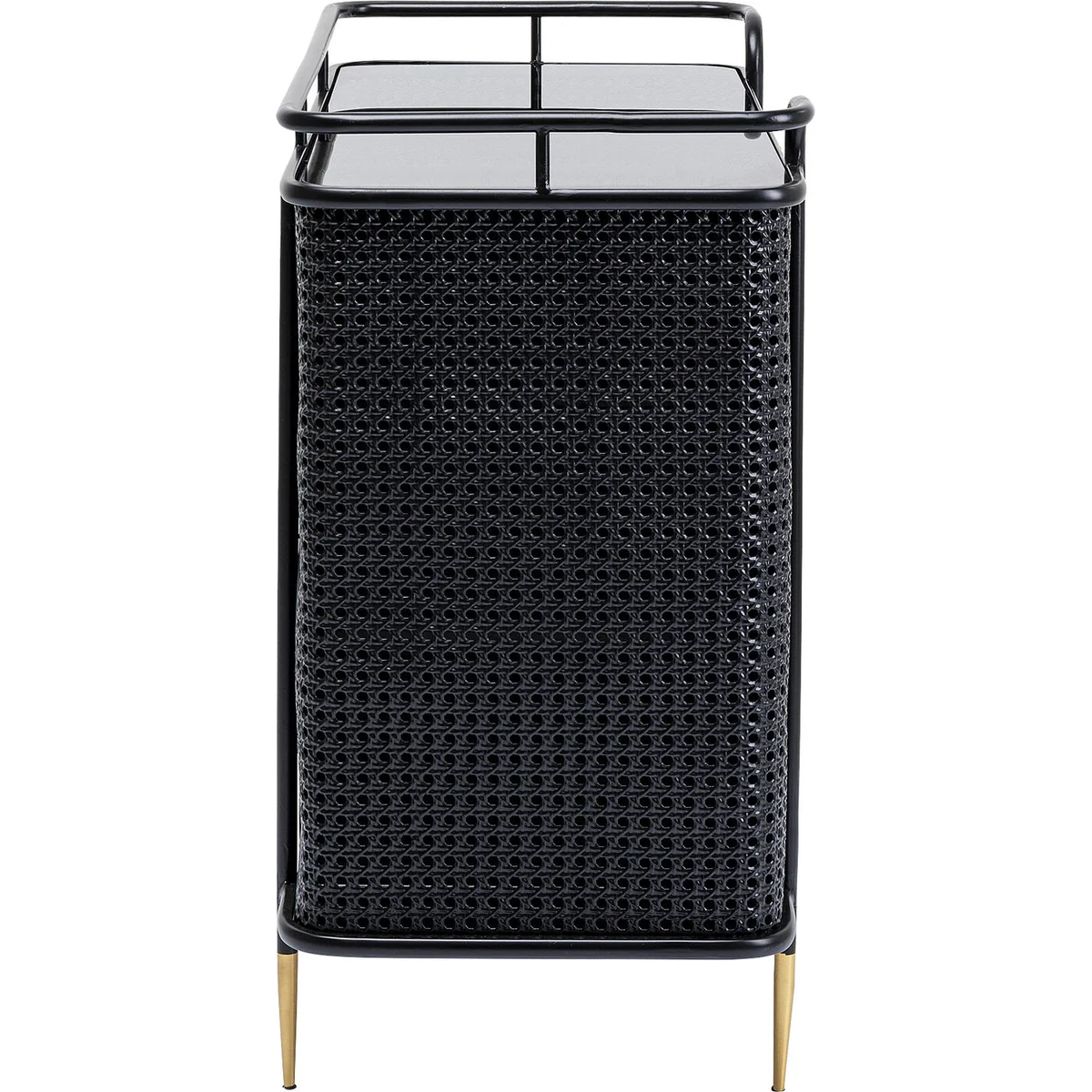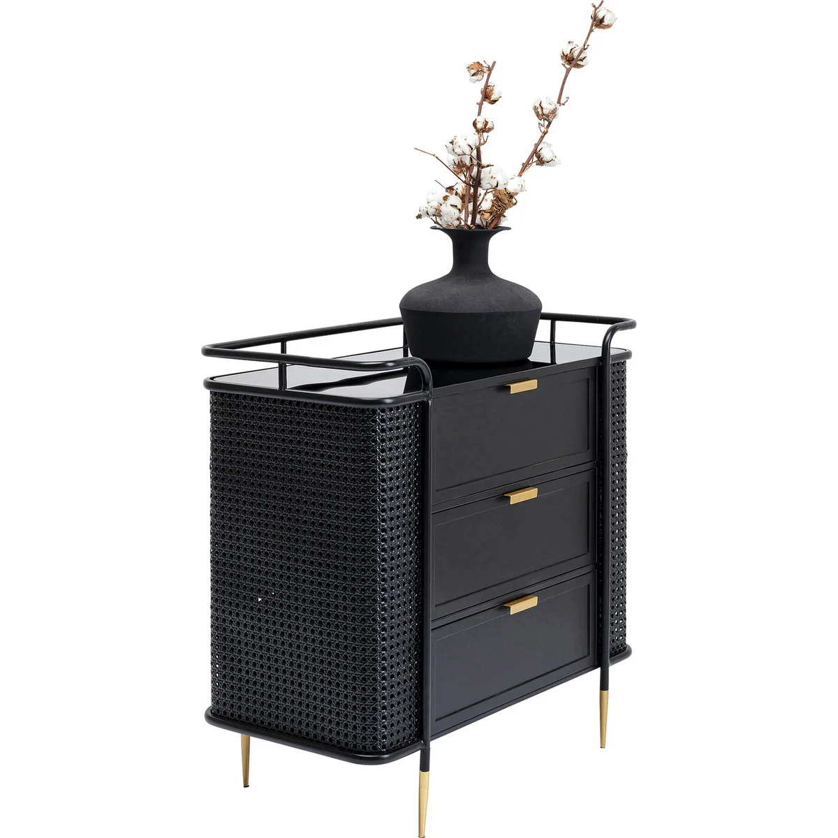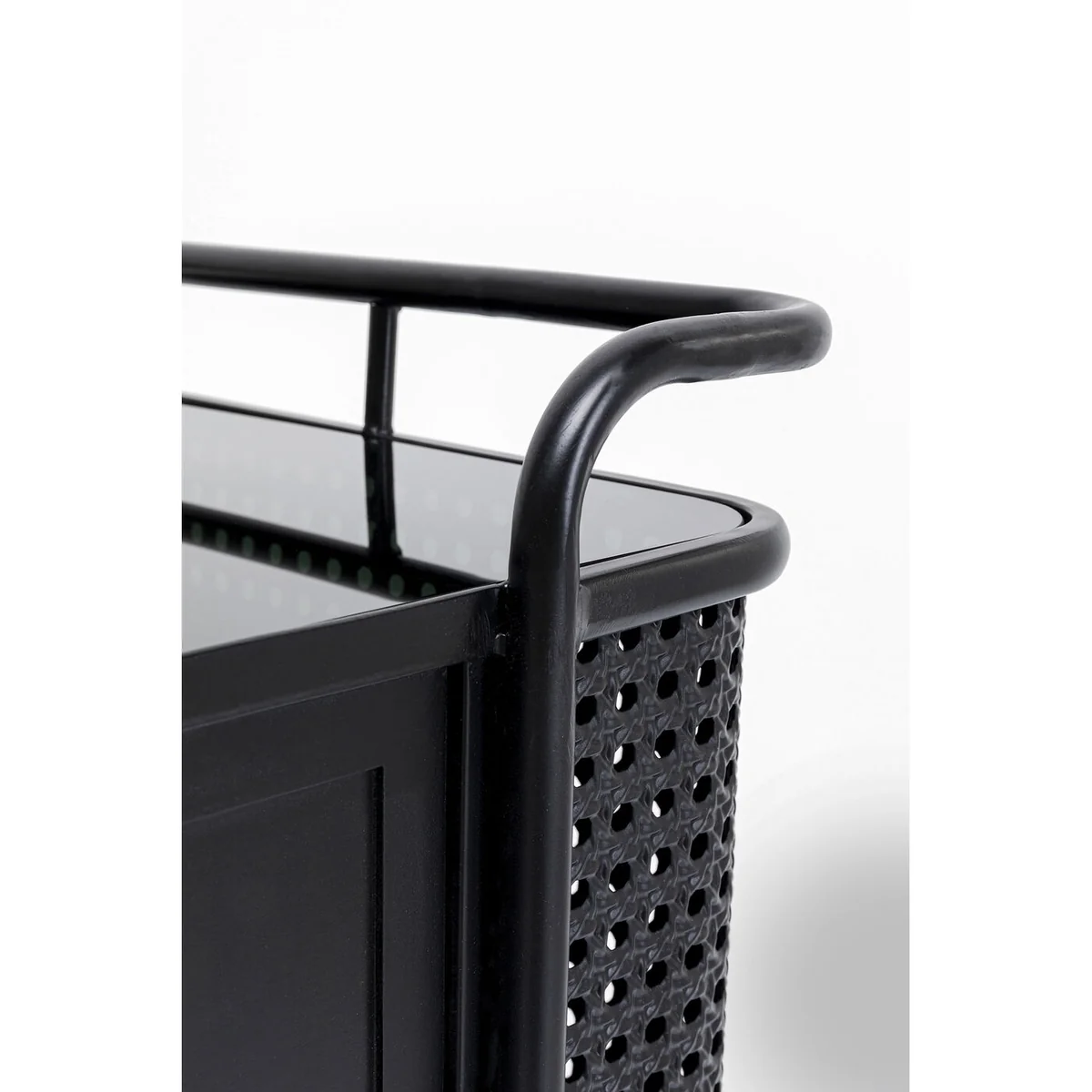 The Fence furniture collection expands the style worlds of steel furniture. It is not the traditionally rugged industrial look, but the modern elegance that makes this furniture line stand out. The element of surprise is provided by three ingredients that we have not seen before in workshop furniture. The Viennese mesh comes into play in the fronts. Smooth surfaces of lacquered steel and glass alternate with structured, permeable passages in a wickerwork look, which are also made of steel. The design of the Fence collection is also unmistakable thanks to the sweeping lines of the legs and frames, which end in a kind of railing, similar to the rail around a ship's deck. Finally, handles and legs in a brass finish provide elegant retro moments. The collection includes a side table, coffee table, console table, lowboard, chest of drawers, cabinet, desk and sideboard.