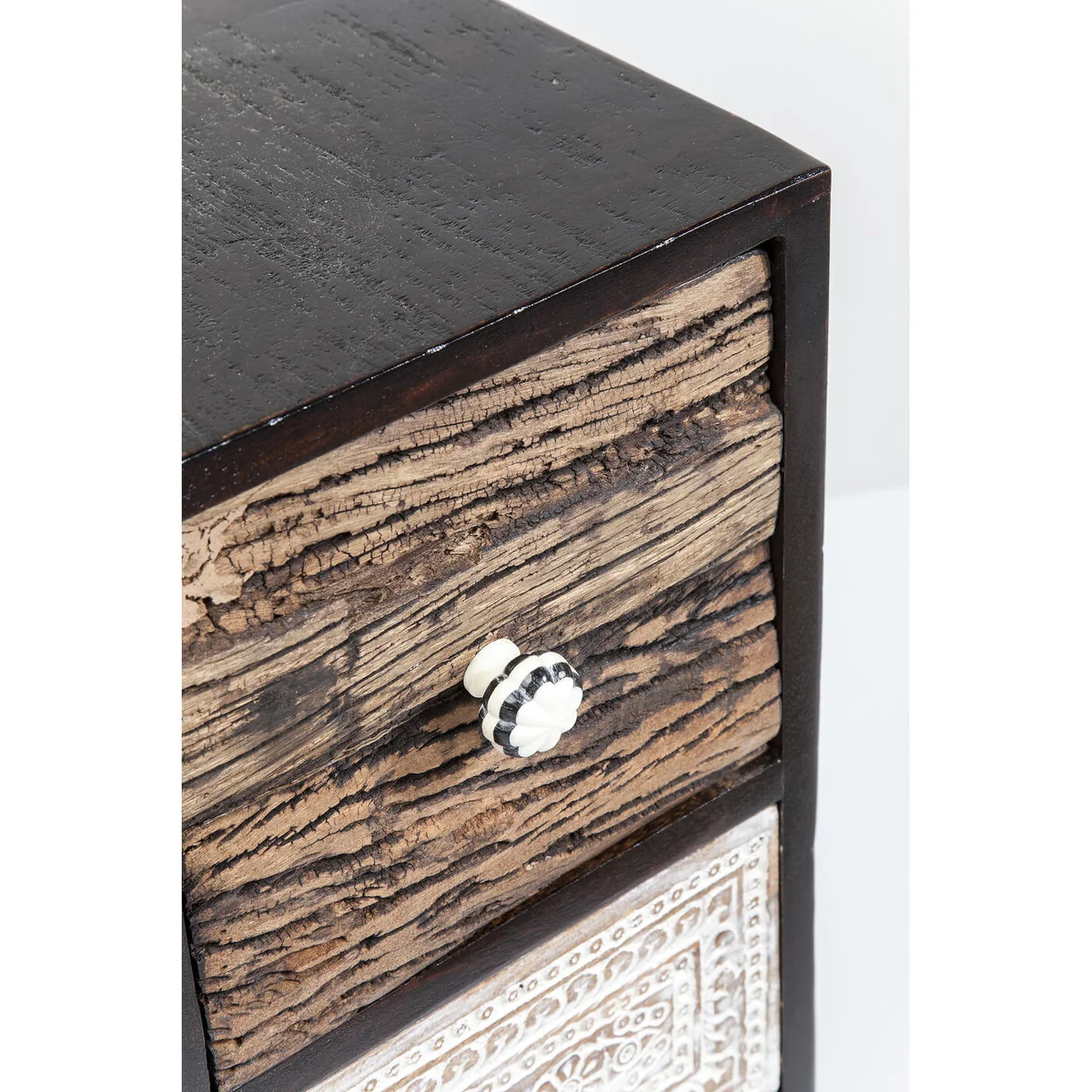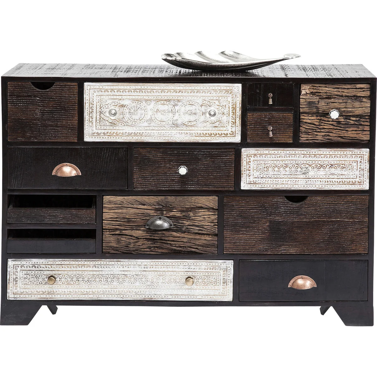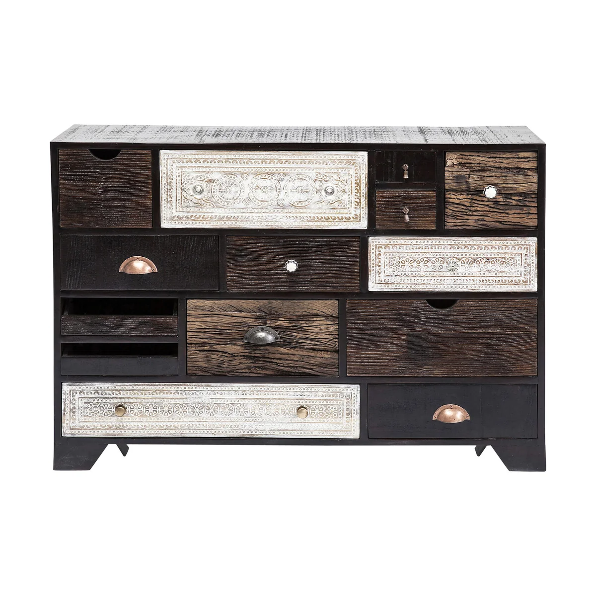 Finished in black lacquered mango wood, the Finca wooden dresser balances practical storage with natural character. Fitted with fourteen drawers, it offers generous space for clothing, accessories or everyday items. suitable for bedrooms, dressing areas or hallways. Part of the finca collection for a coordinated look.