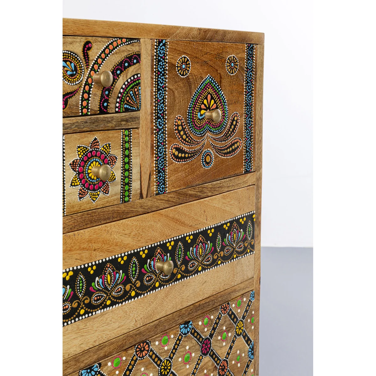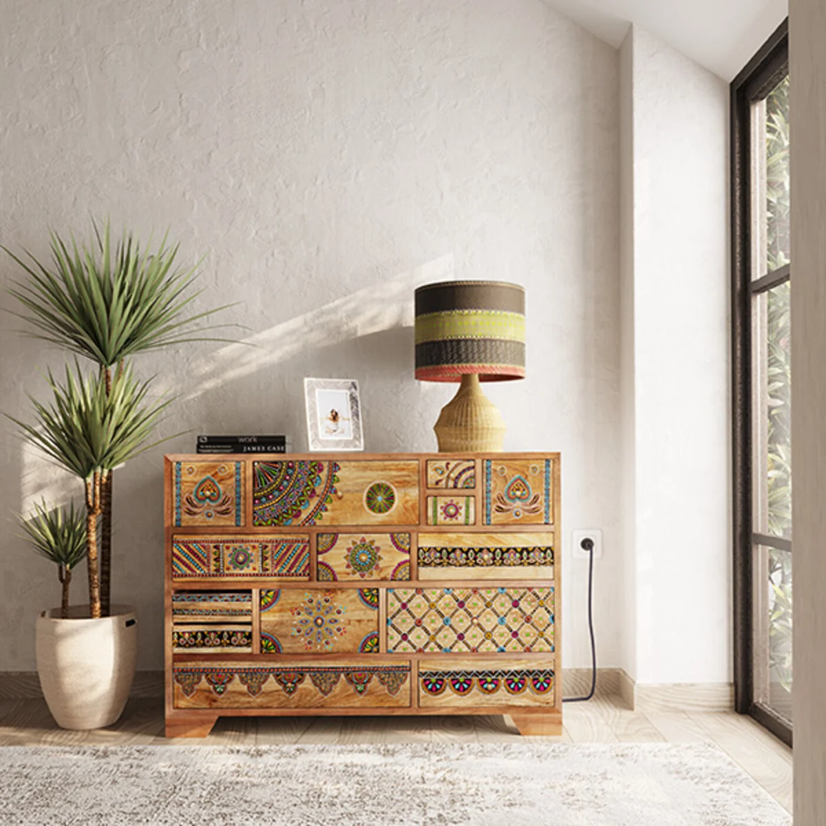 The Menorca furniture series presents a fascinating ethnic style that cleverly combines traditional elements from different cultures. This timeless style creates an atmosphere of warmth and blends seamlessly into a variety of interiors. The subtle embellishments and motifs give the furniture a unique look that will fill your rooms with character. The Menorca series is designed to enhance living spaces in a natural way. With a focus on functionality, these pieces of furniture offer generous storage space for the living room, hallway or bedroom, combined with individual design. Each piece of furniture in the Menorca range has been crafted with the utmost care and attention to detail. Our focus on quality and craftsmanship is evident in the use of solid wood, which not only guarantees durability but also brings a touch of nature to your rooms.