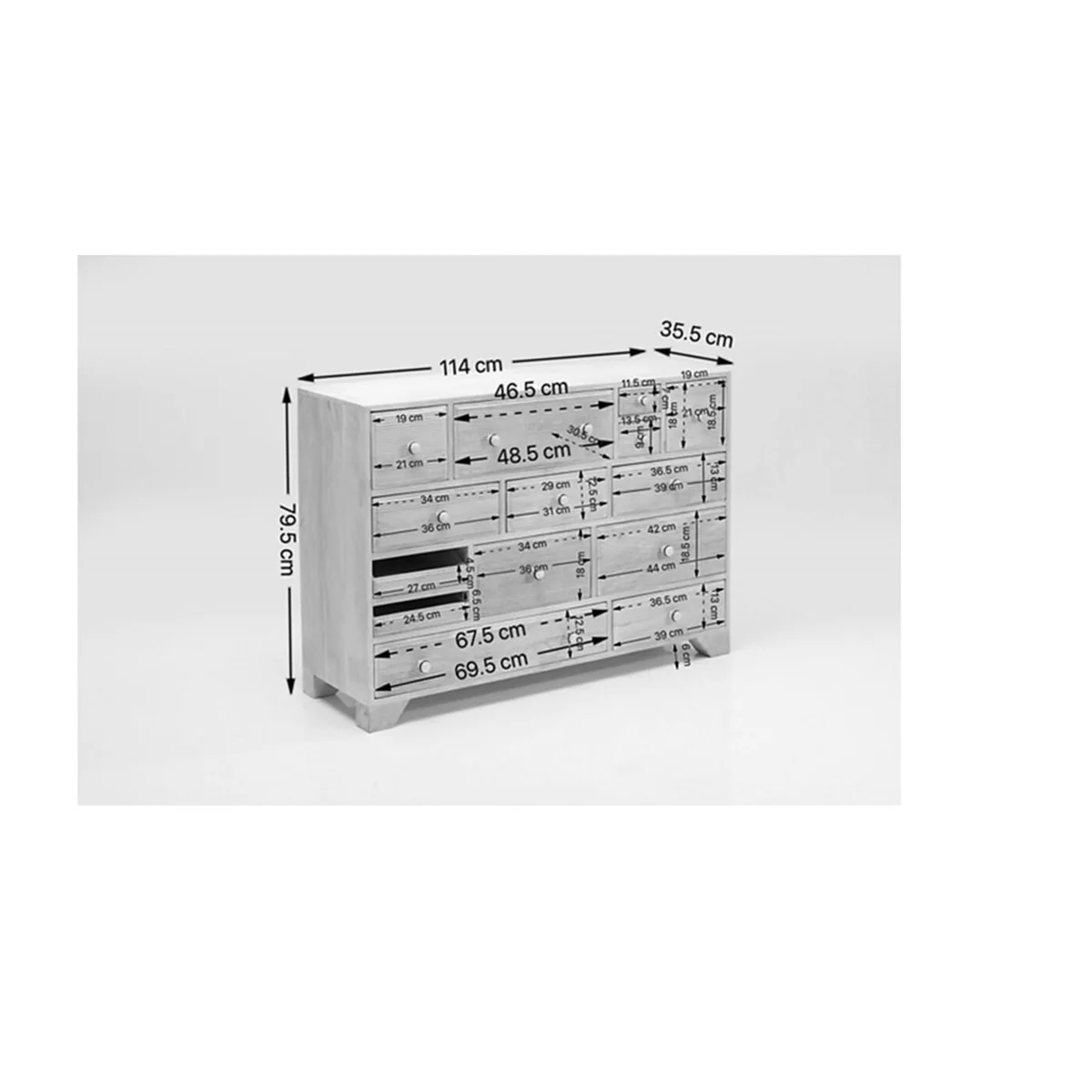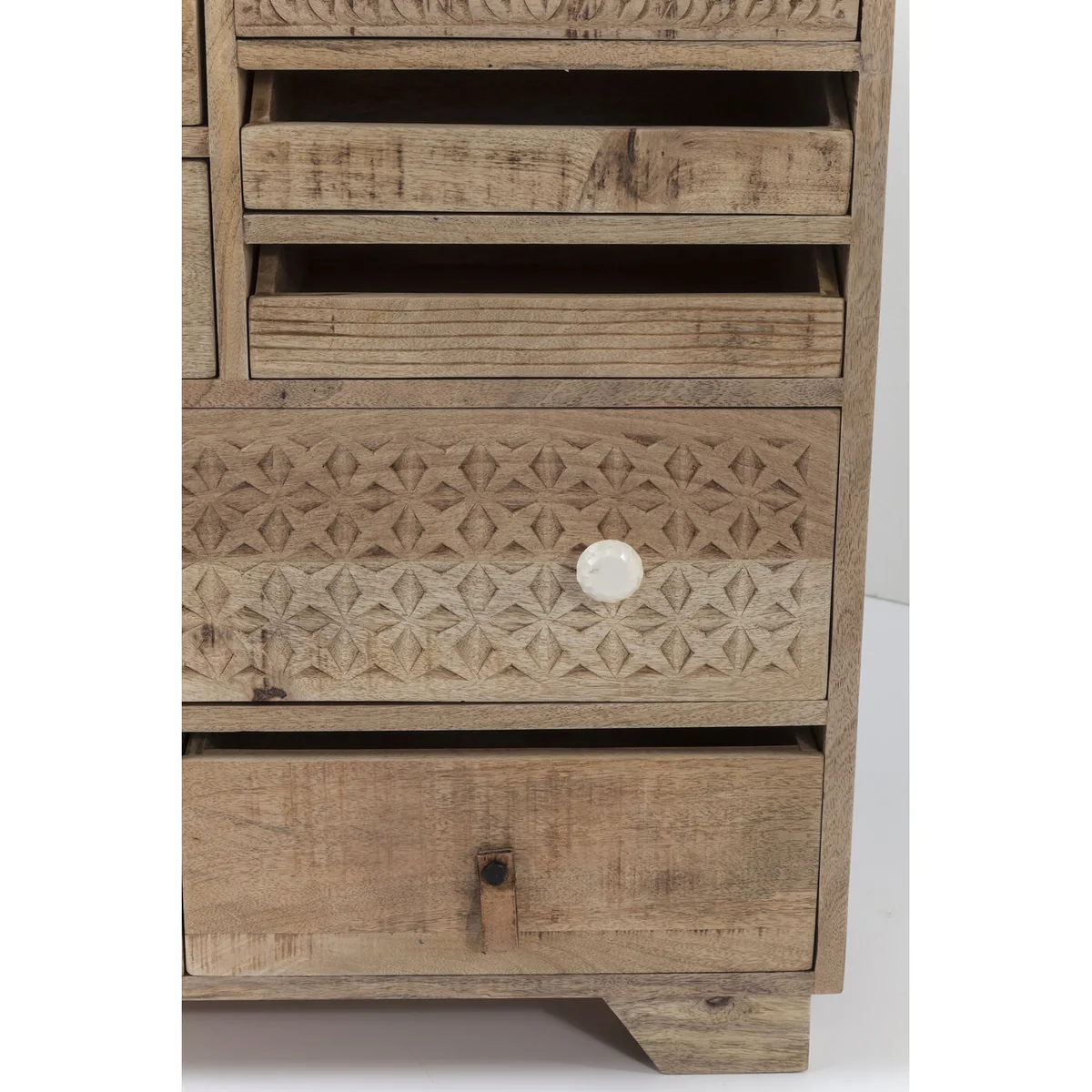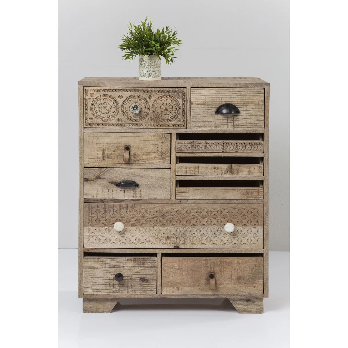 This dresser stands at L 70 cm, D 30 cm and H 90 cm, offering ample space with its 10 drawers. The corpus and fronts are made of solid mango wood, lacquered for a polished finish. The brown color adds a warm, natural touch to any room.