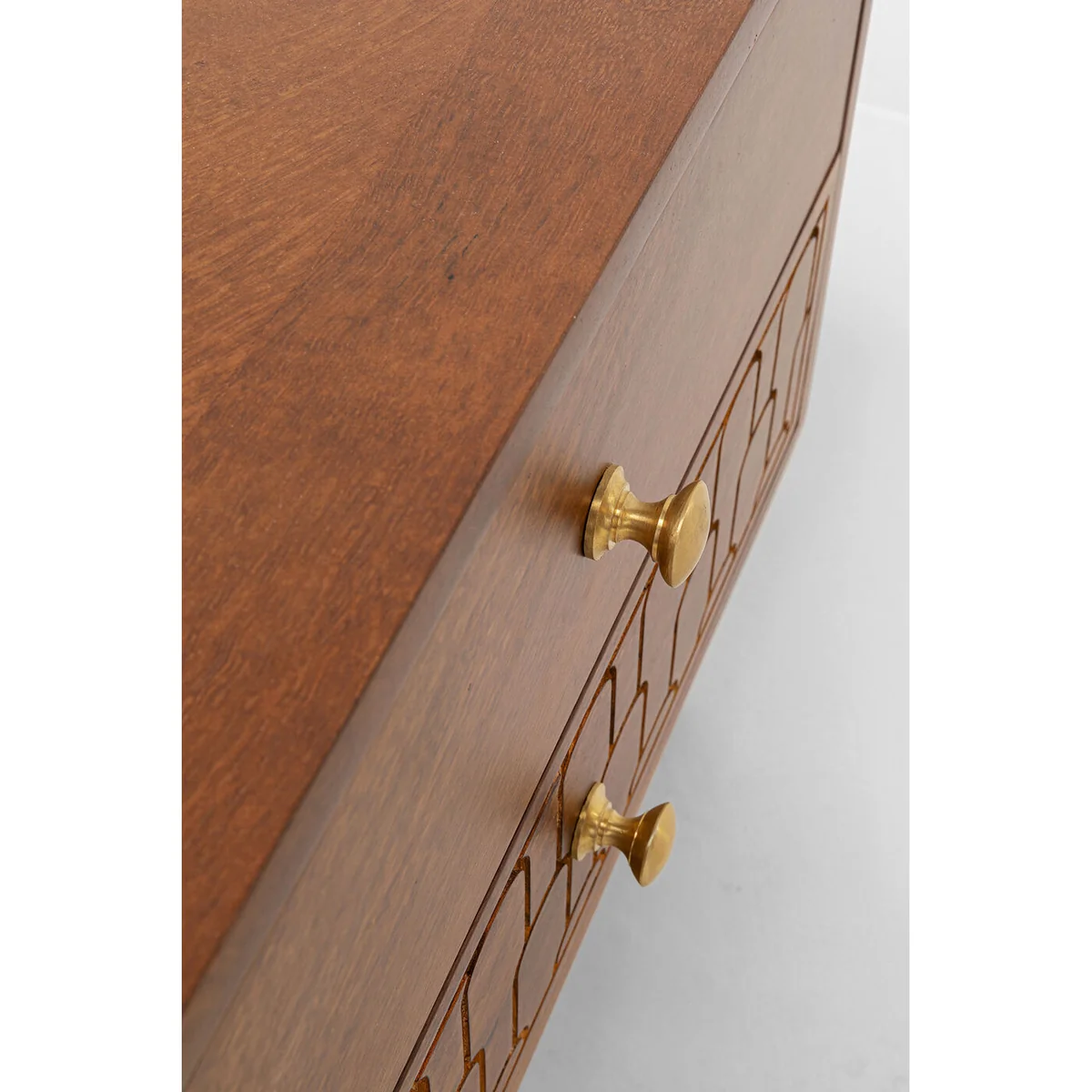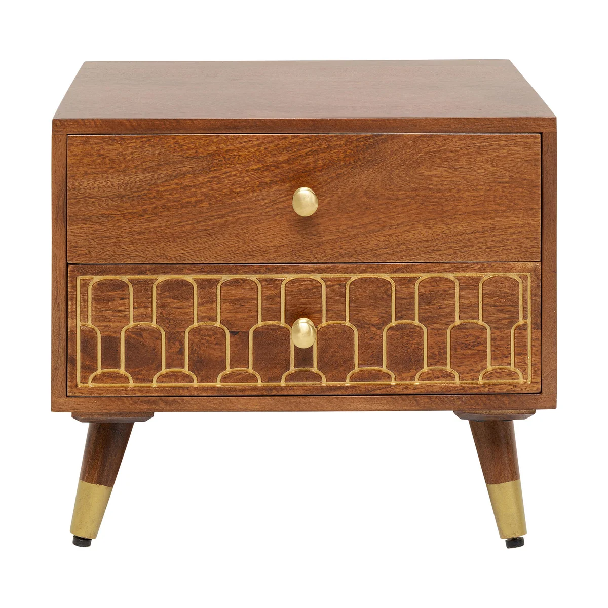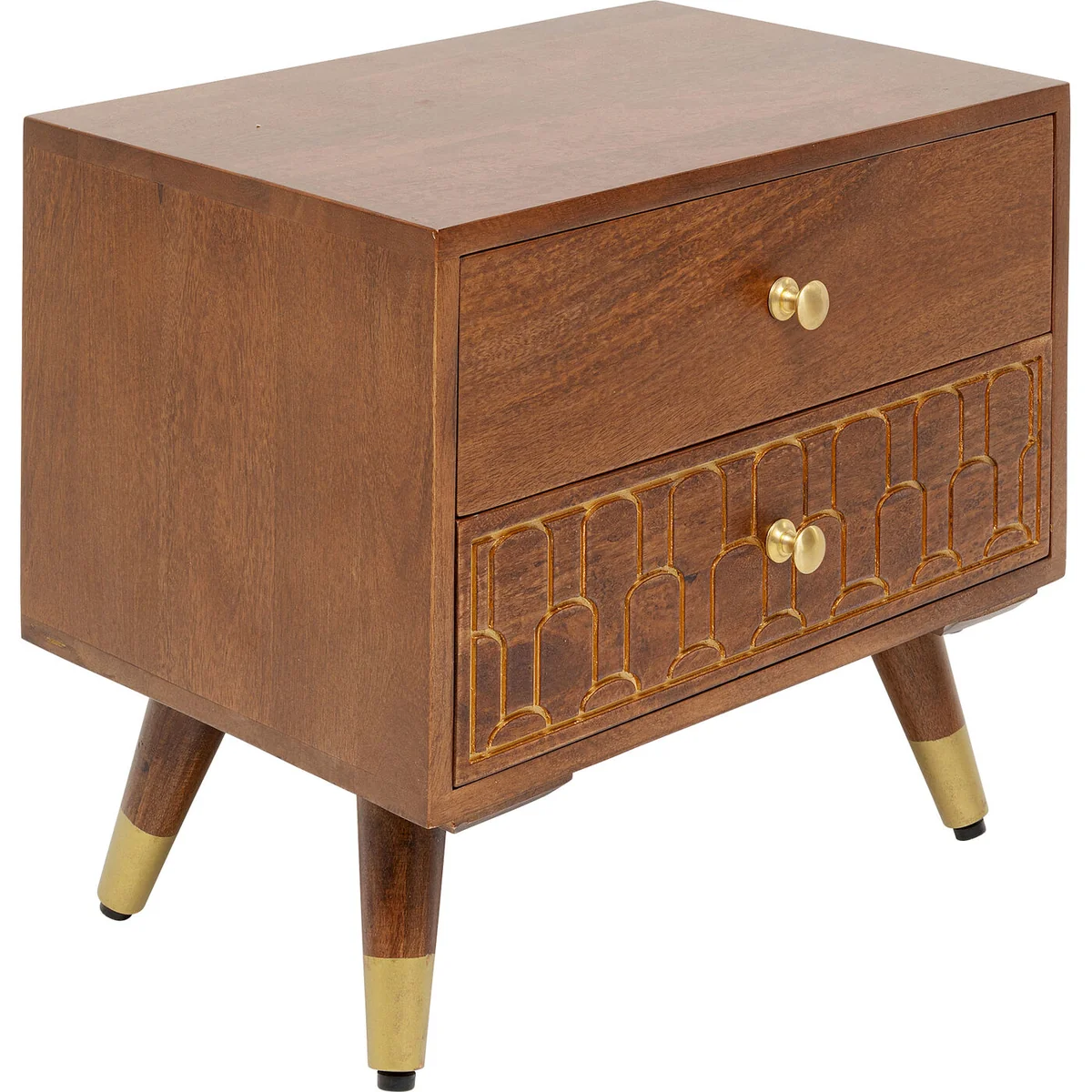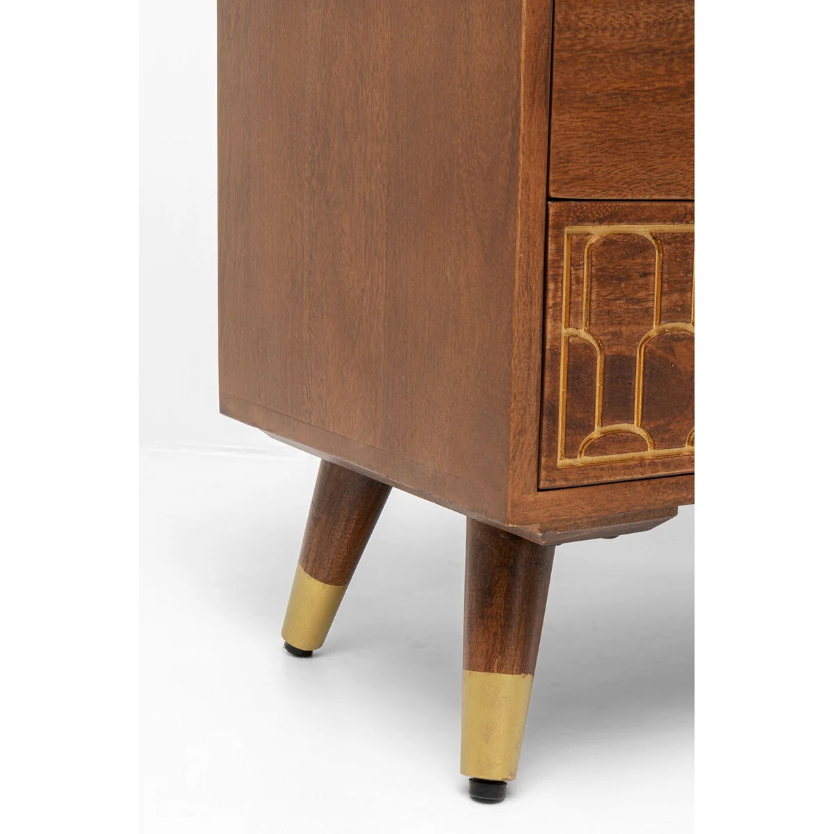 ● Handmade, compact dresser made of solid mango wood with engraved, golden oriental decorations and two doors ● Decorative storage space: makes a good nightstand or a stylish eye-catcher in the hallway and living room, decorated with vases and lamps ● Perfectly imperfect: the engraved, golden ornaments are elaborately crafted by hand and have their own individual character ● The night stand looks like an object found in an antique shop and immediately conquers the hearts of all retro lovers ● Muskat is a furniture series with further models such as a sideboard or cupboard